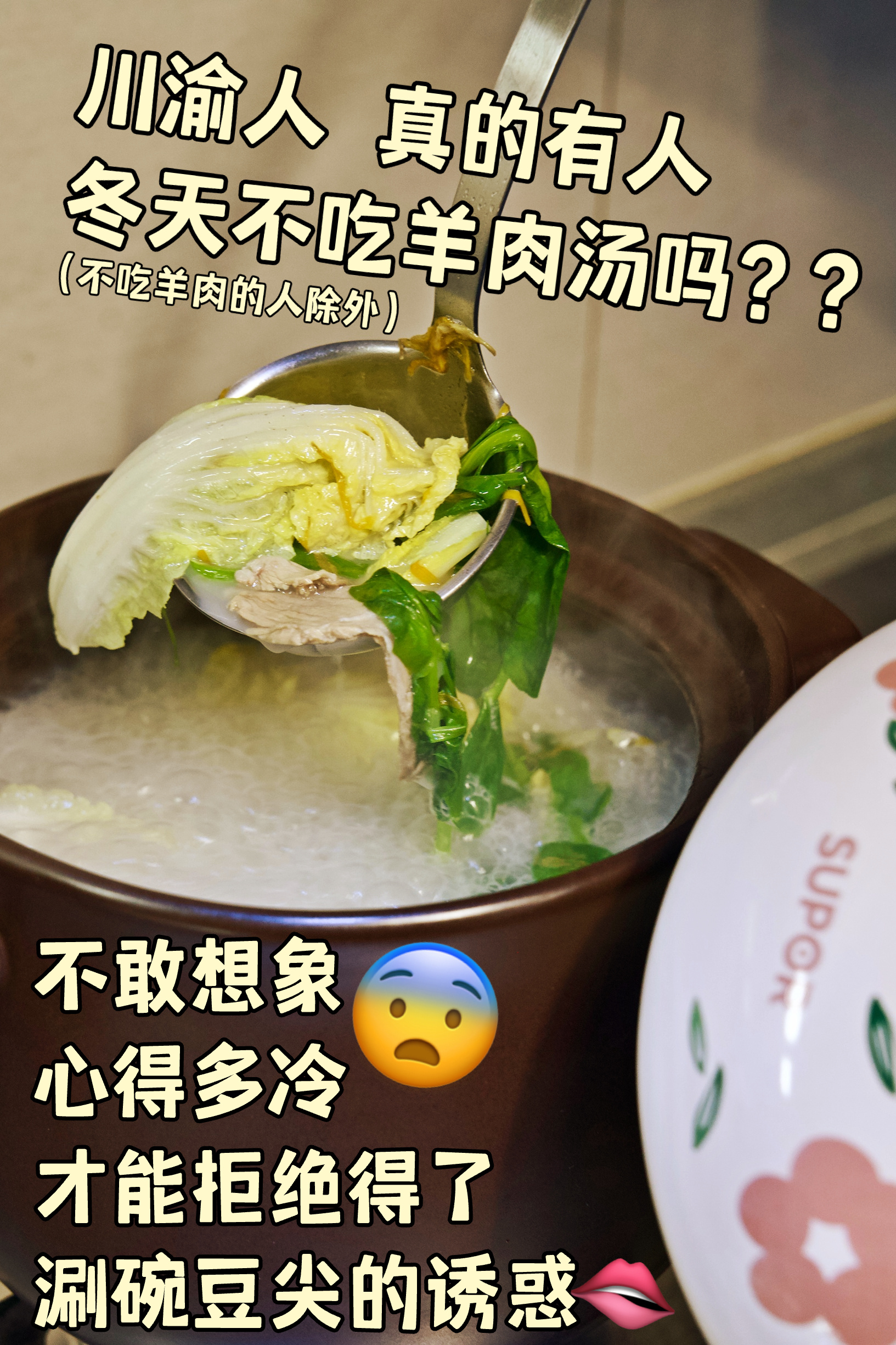 but!喝点鲜美又暖胃的羊肉汤才真嘞巴适!xuan美的羊肉汤煮好羊肉和羊杂,一点都不腥,再煮一点点的季节限定豌豆尖,嫩嫩的豌豆尖煮出来又lun又葩,直接xuan翻天灵盖儿,再喝一口梨汤,爽惨!!川渝人真嘞超会猫冬!