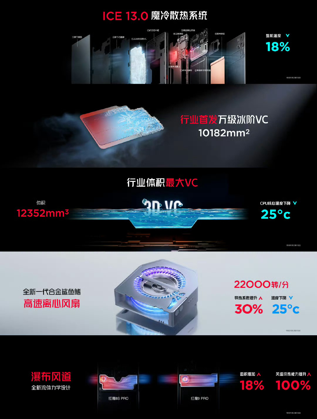 红魔9全系搭载骁龙8gen3+LPDDR5X+UFS4.0,自研红芯R2 Pro芯片,安兔兔常温下跑分2291328分,后置不凸起三摄,5000万OIS光学防抖超感光主摄+5000万超广角主摄。
