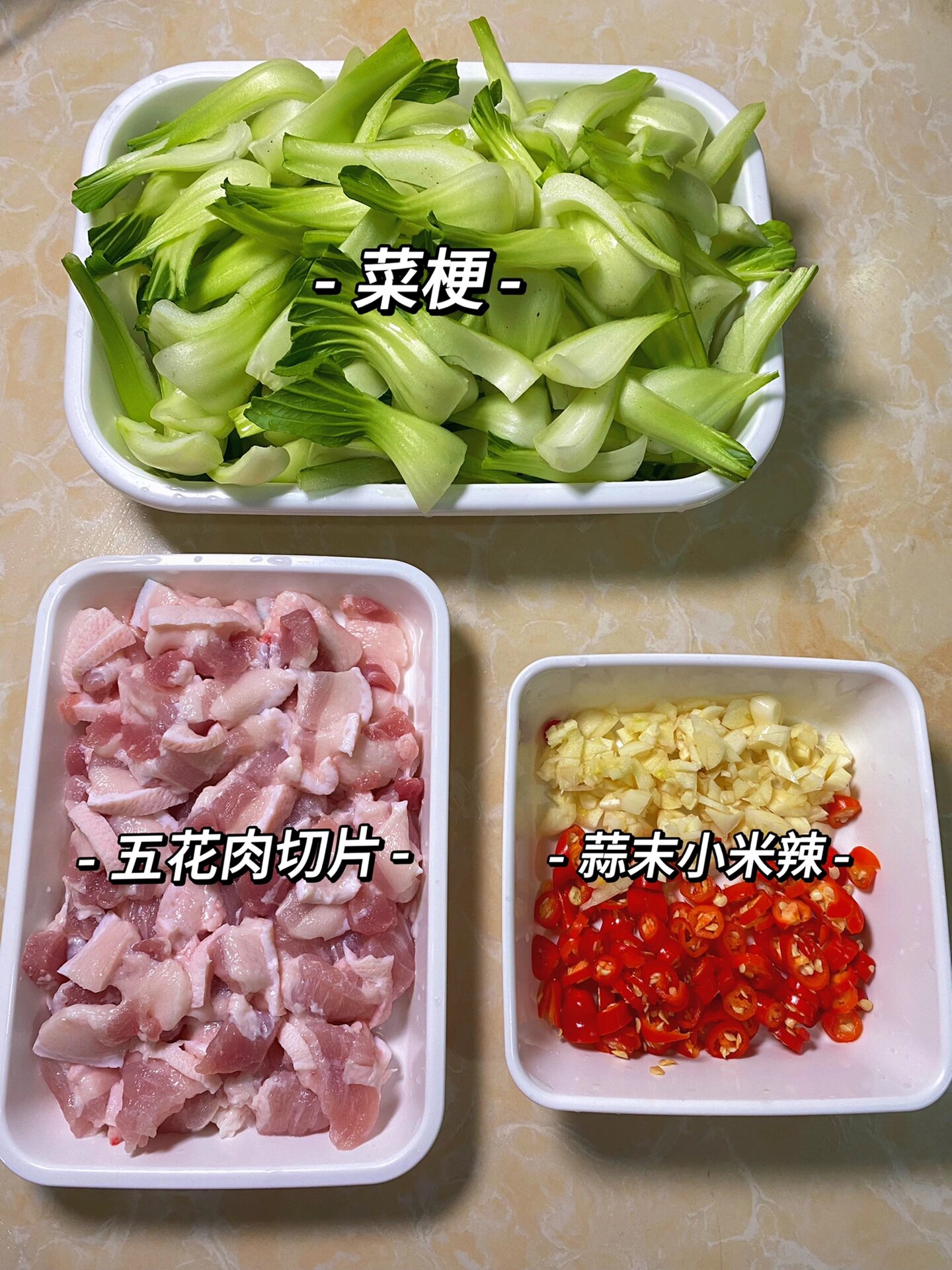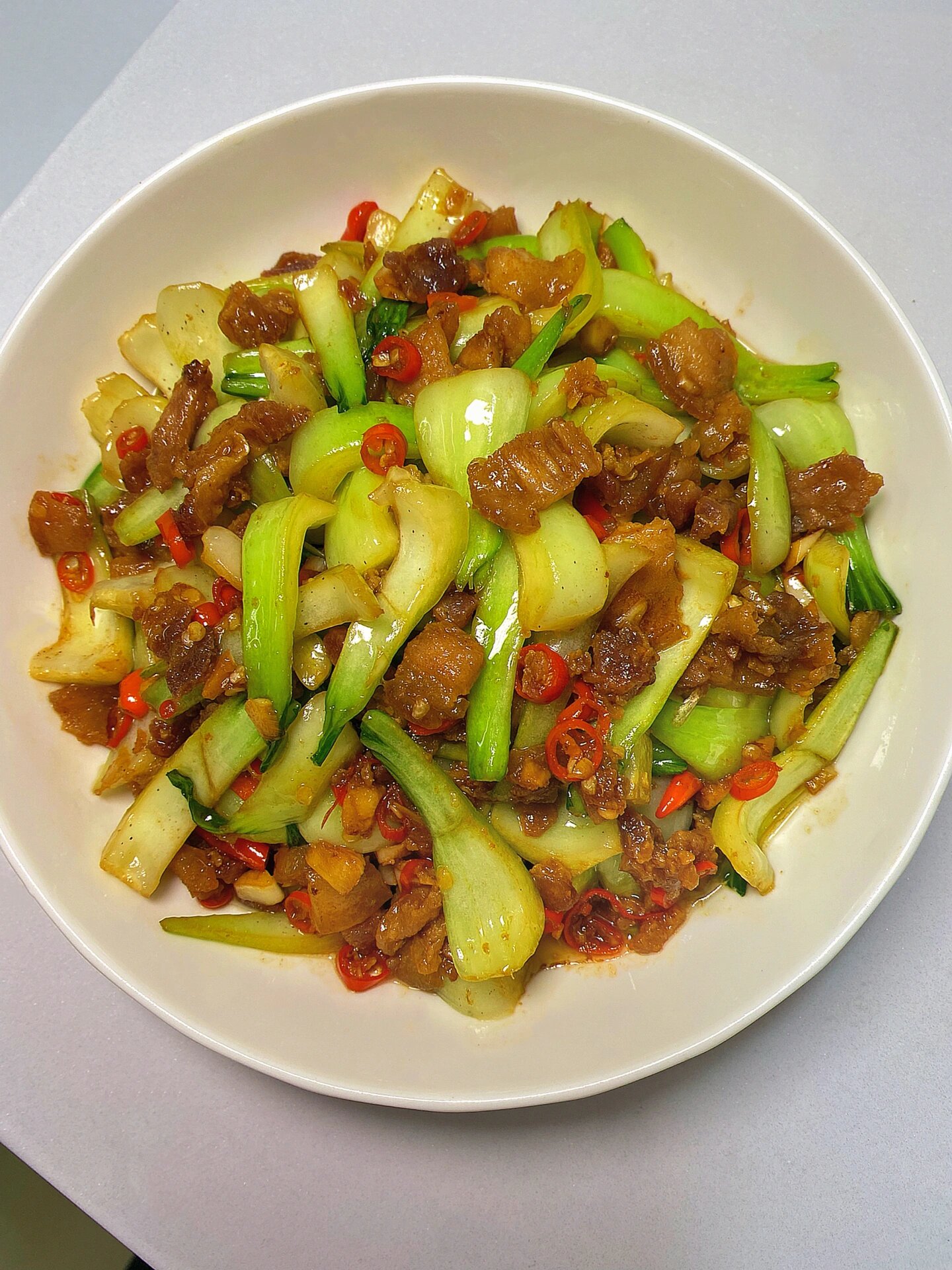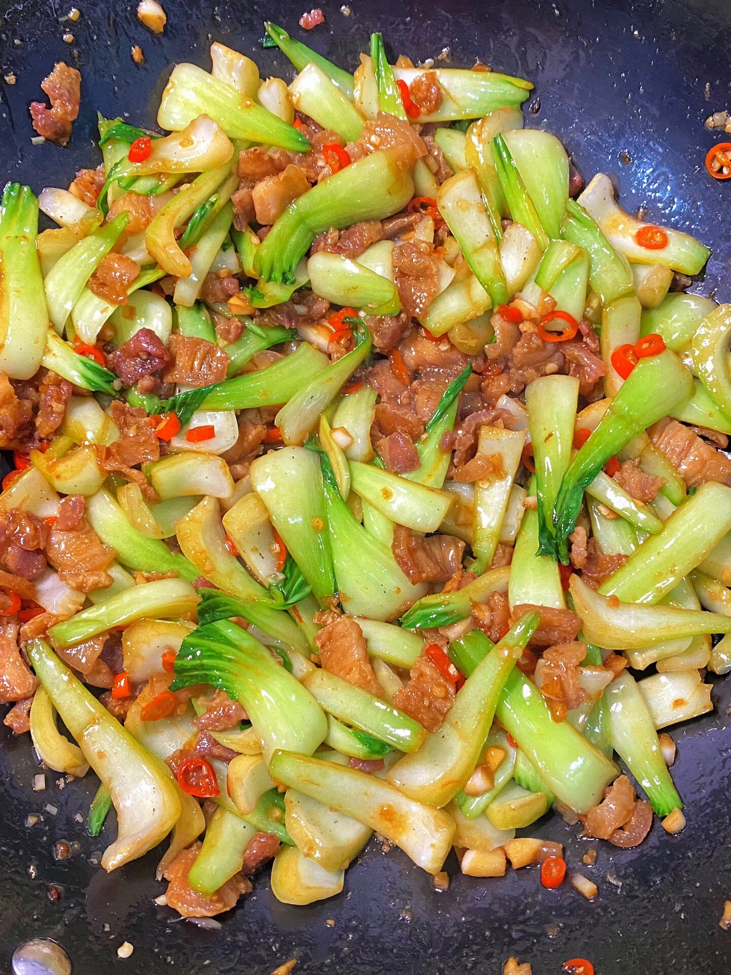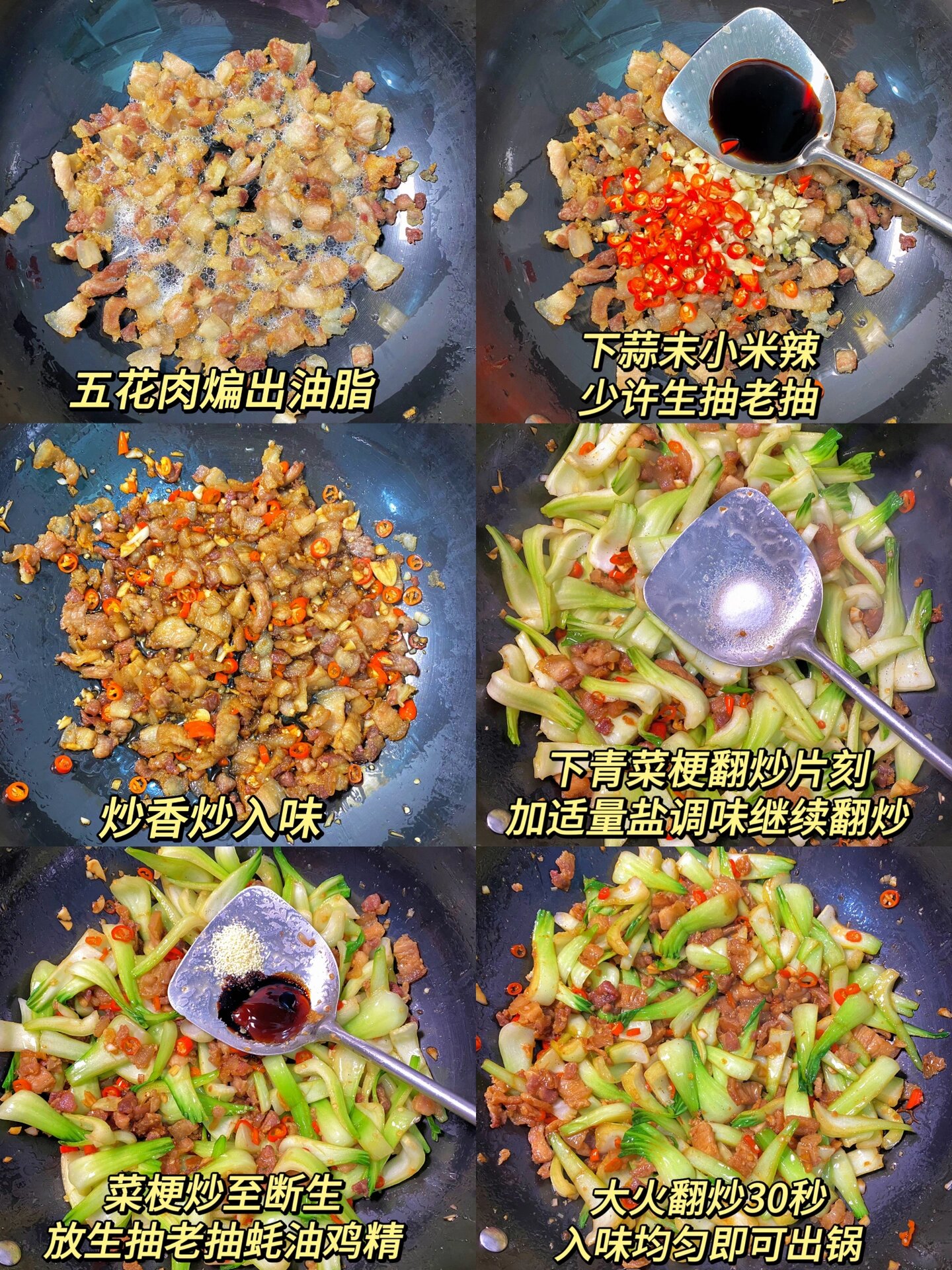 江西人应该都吃过这道菜吧,快来集合啦 食材:青菜梗 五花肉 小米辣 蒜末 做法:1、五花肉少油下锅煸炒出油脂,下蒜末小米辣加少许生抽老抽一起炒香 2、放青菜梗,翻炒片刻加适量食盐调味,继续翻炒至菜梗断生 3、然后加生抽老抽蚝油,鸡精适量大火翻炒30秒左右出锅 从小吃到大的家常菜,做法简单食材易买,真的很下饭,不知道吃什么菜的试试这个吧