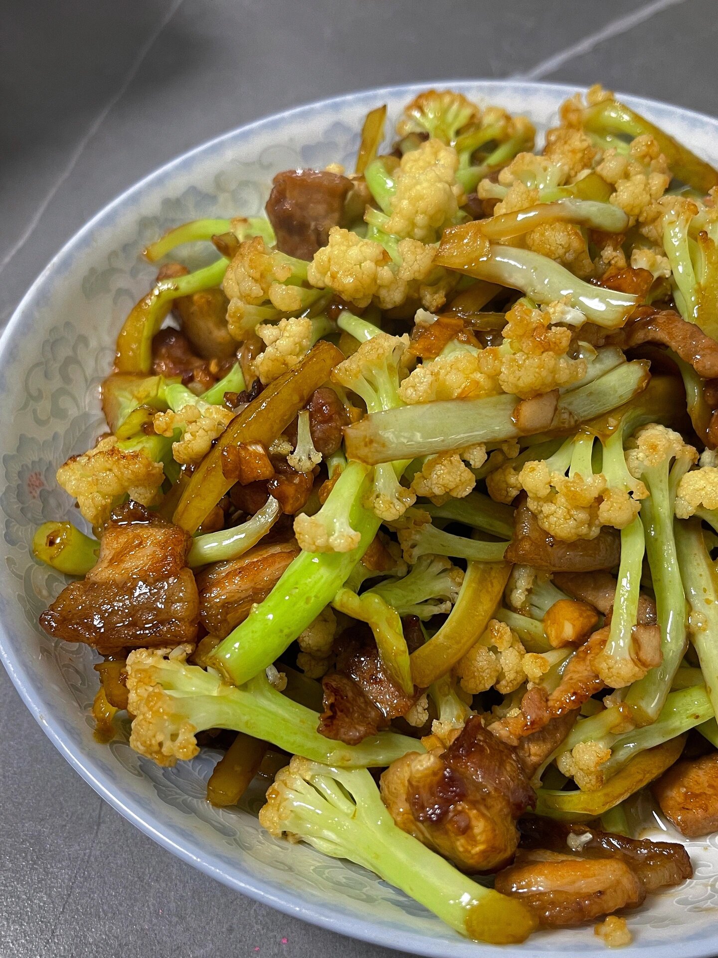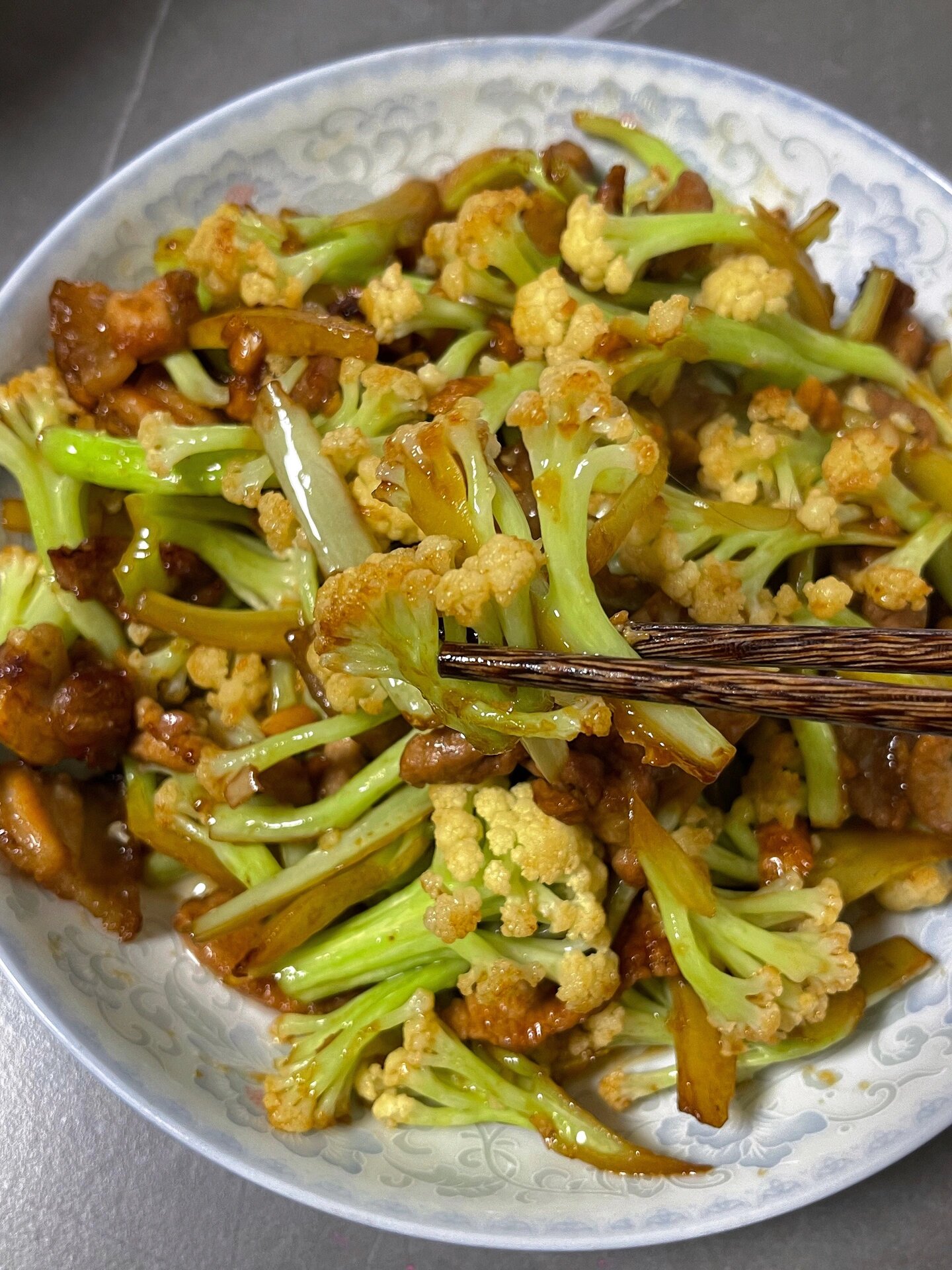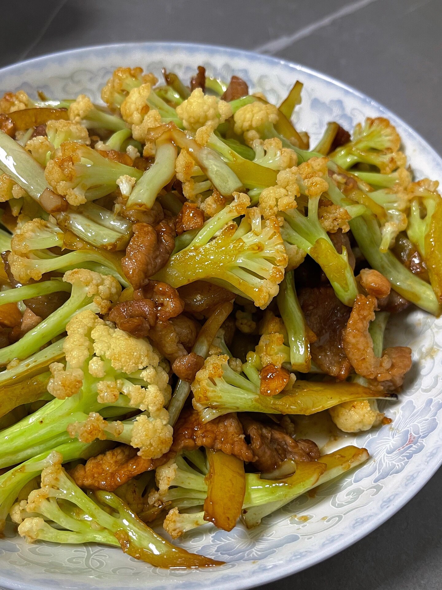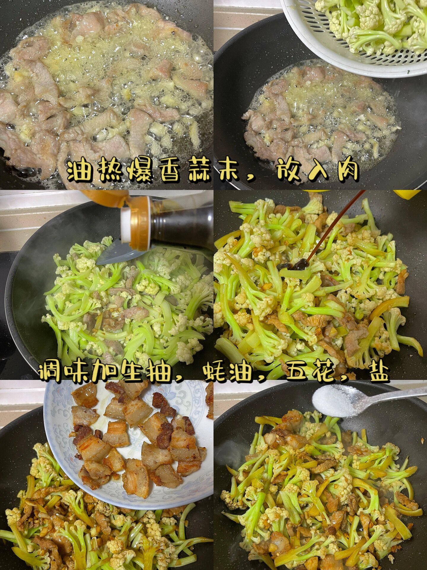 美味无敌下饭的干锅花菜,简单巨好吃…… 今天做了一道巨好吃的干锅花菜,香辣入味!超级下饭! 做法简单!五分钟就能搞定!赶紧的来试一试吧! 食材:花菜 五花肉 做法:1.花菜切成小块儿,五花肉切成片,锅中少油先放入五花肉炒出油脂,捞出乘盘备用 2.锅中油热,下入蒜末爆香,倒入瘦肉炒熟,放入花菜,继续翻炒,炒至断生后,加生抽,蚝油,翻炒均匀,倒入五花肉,加盐,继续翻炒个五六七八下,就可以出锅了。