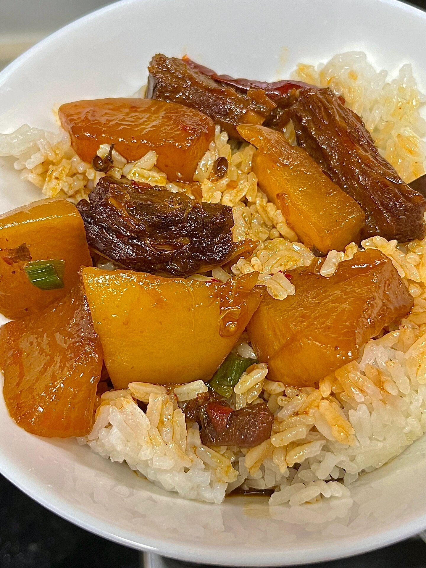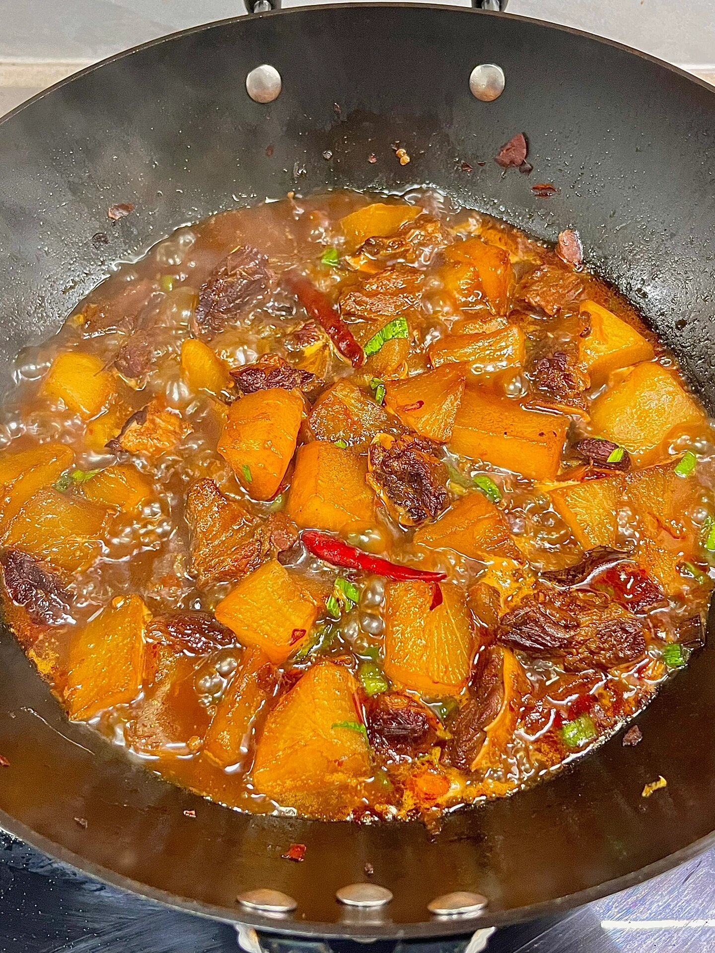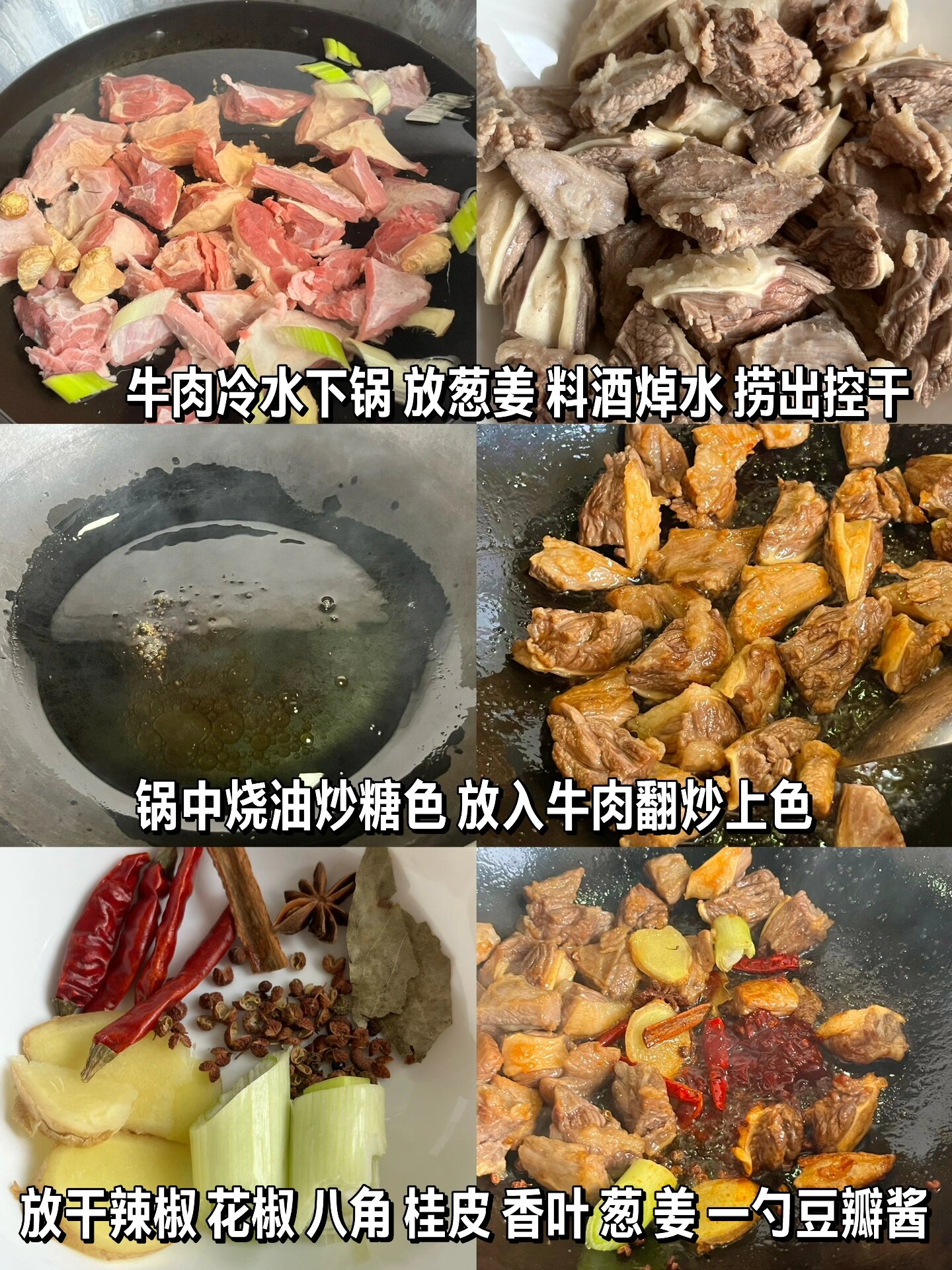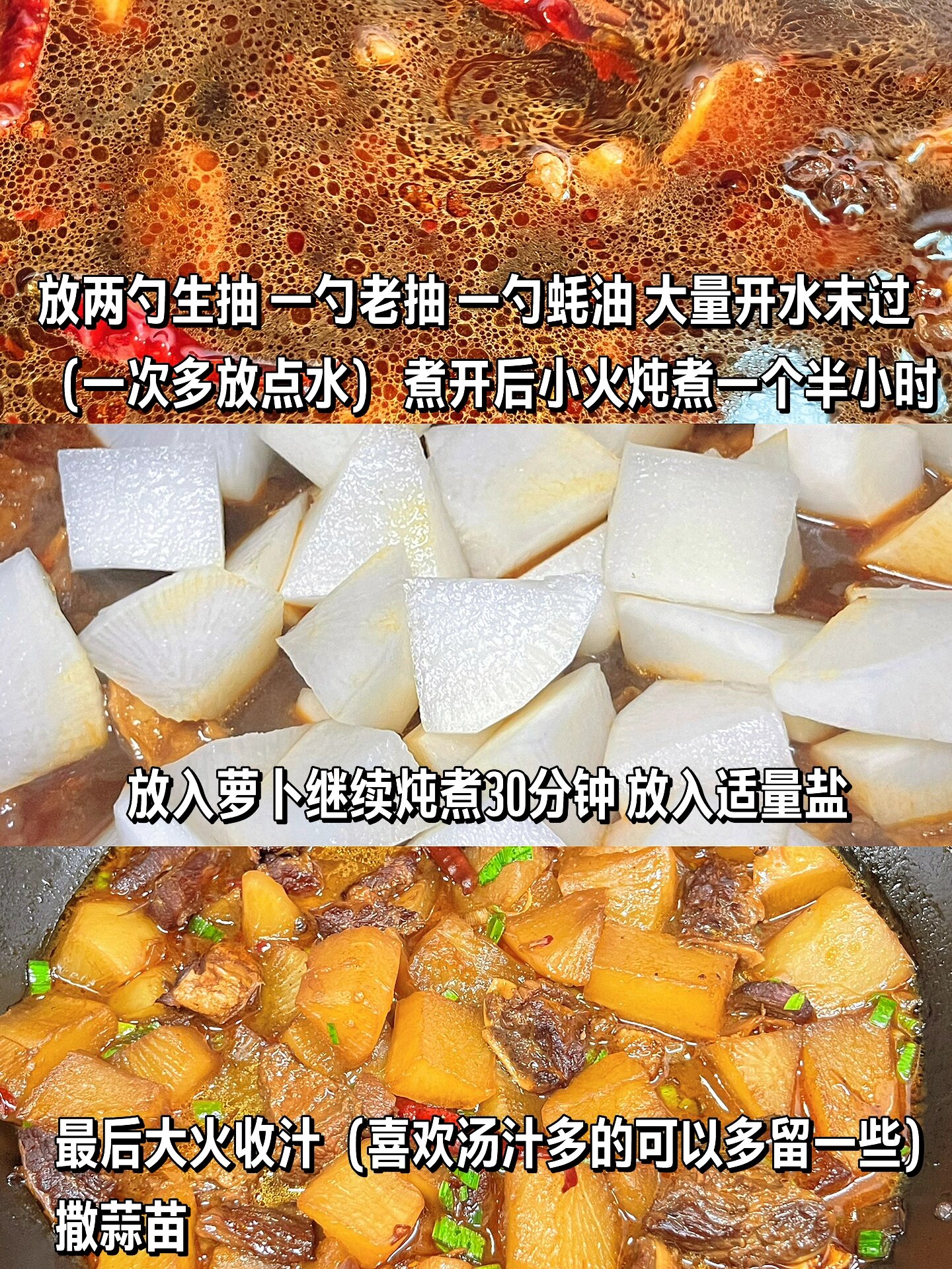萝卜炖牛肉!拌饭一绝!软烂入味! 冬天最爱的一道菜! 食材:牛肉(牛腩、牛肋条都可以)、白萝卜 步骤:1、牛肉冷水下锅,放葱、姜、料酒焯水,捞出沥开水分 2、锅中放油炒糖色,放入牛肉翻炒,放入干辣椒、花椒、八角、香叶、桂皮、姜、葱,一勺豆瓣酱翻炒 3、倒入开水末过牛肉(多放一些),放入两勺生抽、一勺老抽、一勺蚝油煮开后转小火炖煮一个半小时 4、放入萝卜、适量盐继续炖煮30分钟,稍微收汁(喜欢汤汁多的可以不收)撒蒜苗