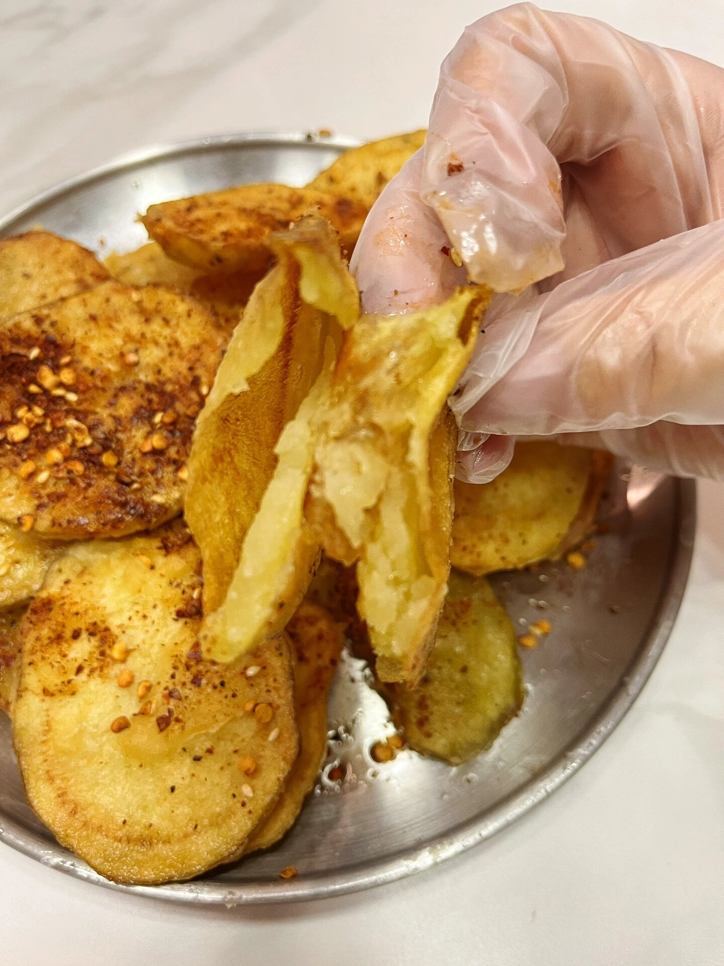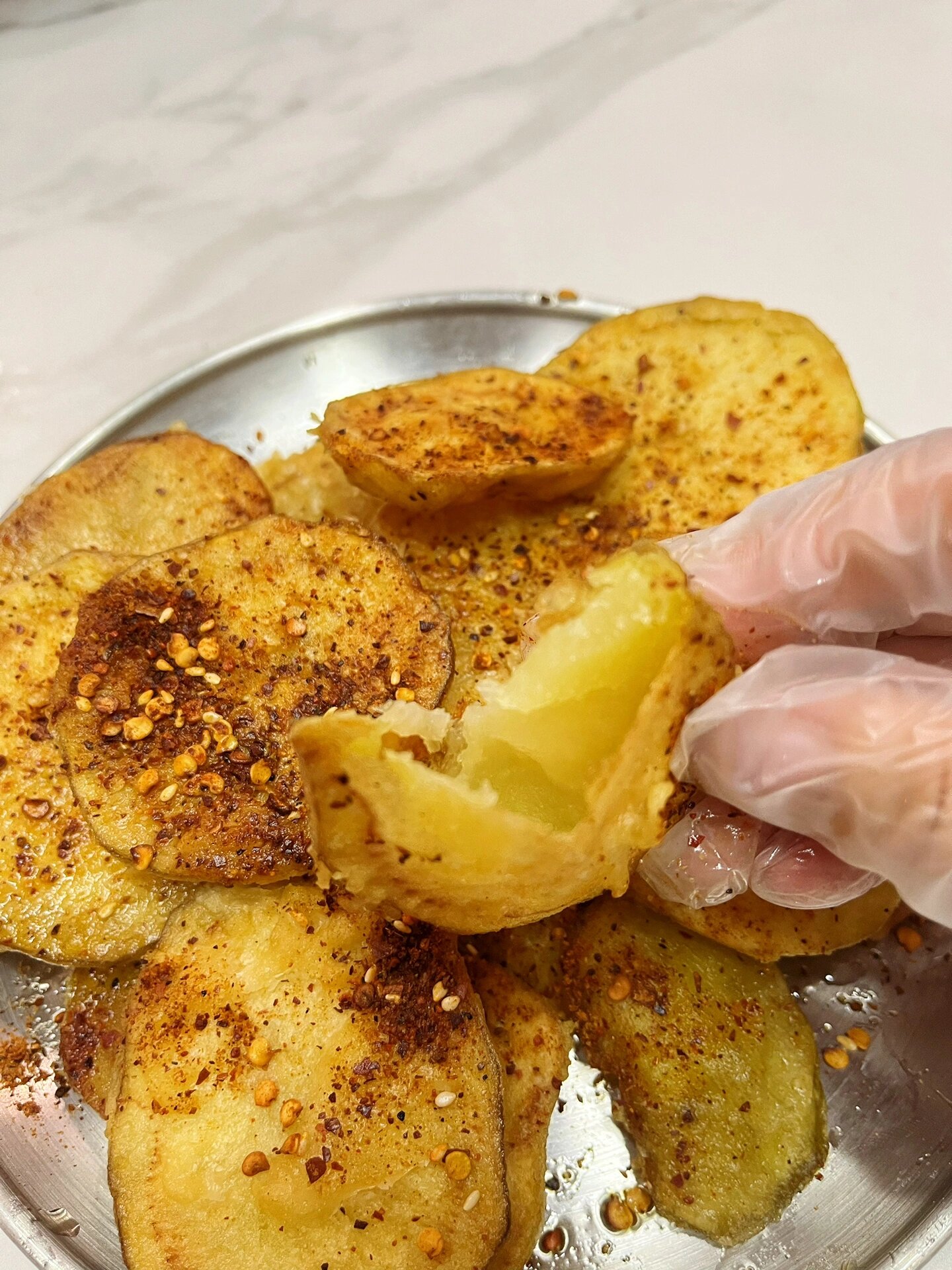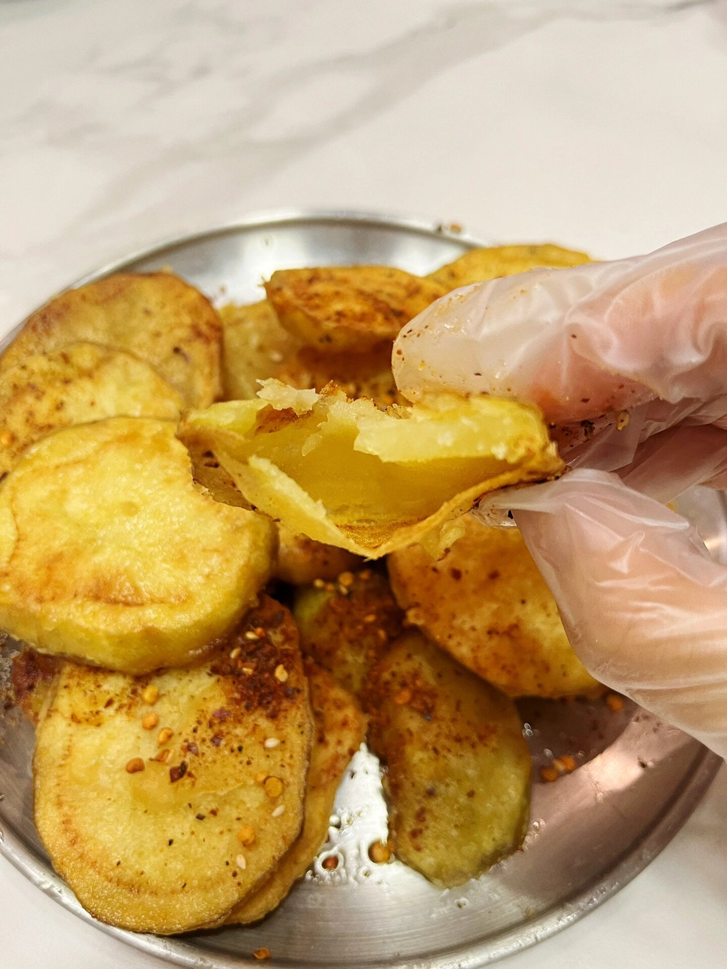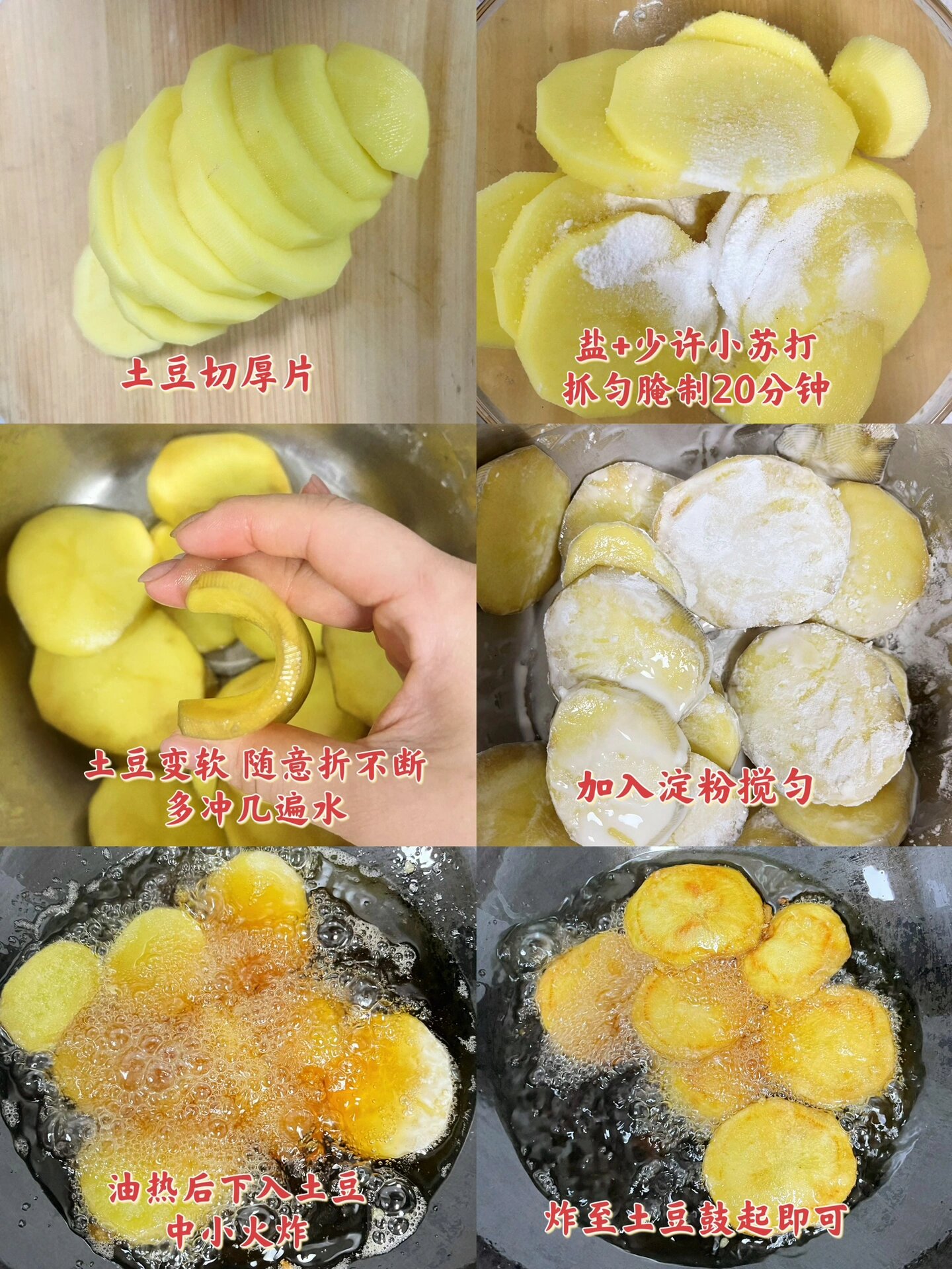 土豆爱好者必吃美食之气泡土豆 真绝 土豆片被炸到空心,外焦里嫩,看到别人吃的第一口我就立刻跑回家做了!!真的很绝 食材:土豆、小苏打、淀粉 做法:1、土豆片厚切+盐+一撮小苏打,抓拌均匀腌制20分钟 2、土豆腌软,可以随便折不断的程度就可 3、多冲几遍水,加上多点玉米淀粉,裹在土豆上 4、锅中多点油,油热后中火下入土豆片,炸至土豆鼓起即可 出锅后可以撒点喜欢的调料 空心的泡泡土豆真的太好吃啦!!