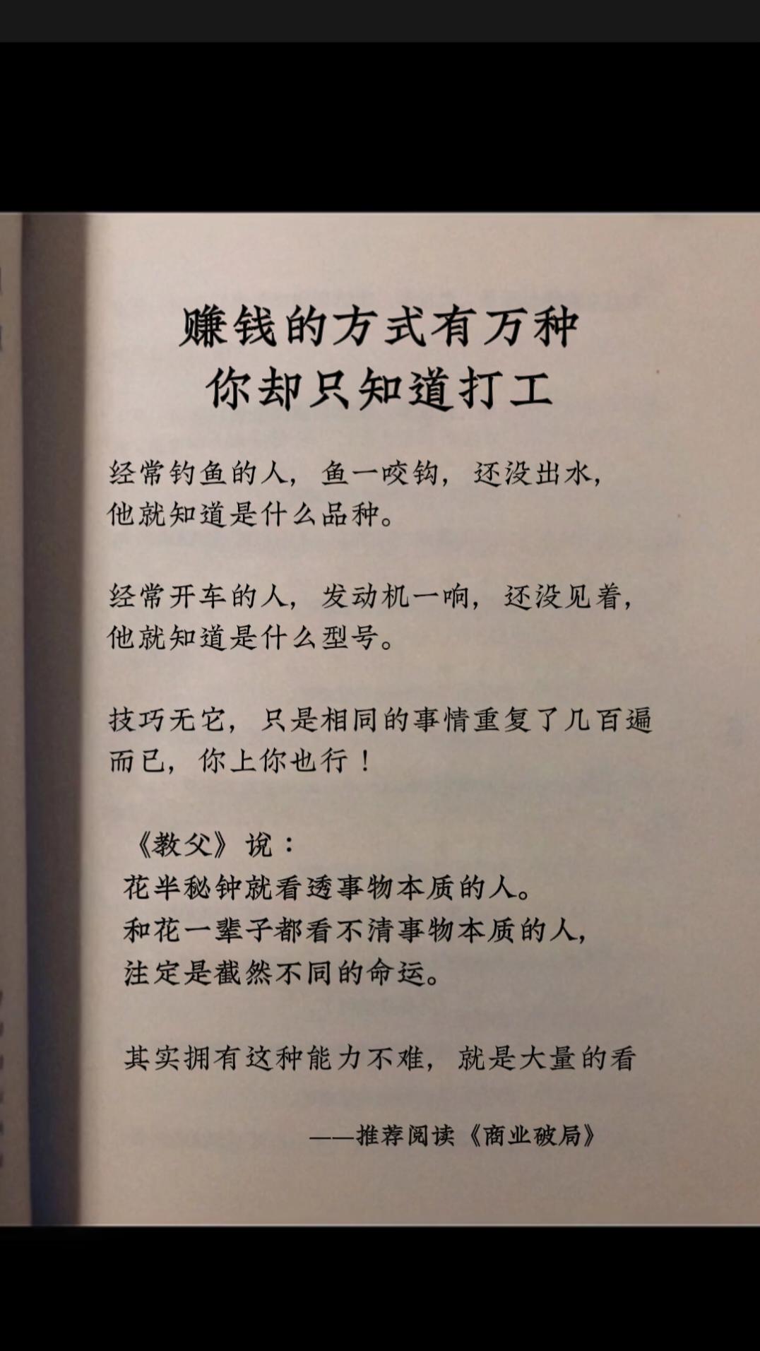 用别人的车子赚钱,滴滴做到了; 用别人的产品赚钱,阿里做到了; 用别人的饭店赚钱,美团做到了; …… 花半秘钟就看透事物本质的人。 和花一辈子都看不清事物本质的人, 注定是截然不同的命运。 想赚钱想翻身,从底层崛起#商业思维 #商业模式 #赚钱 #赚钱思维 #智慧人生