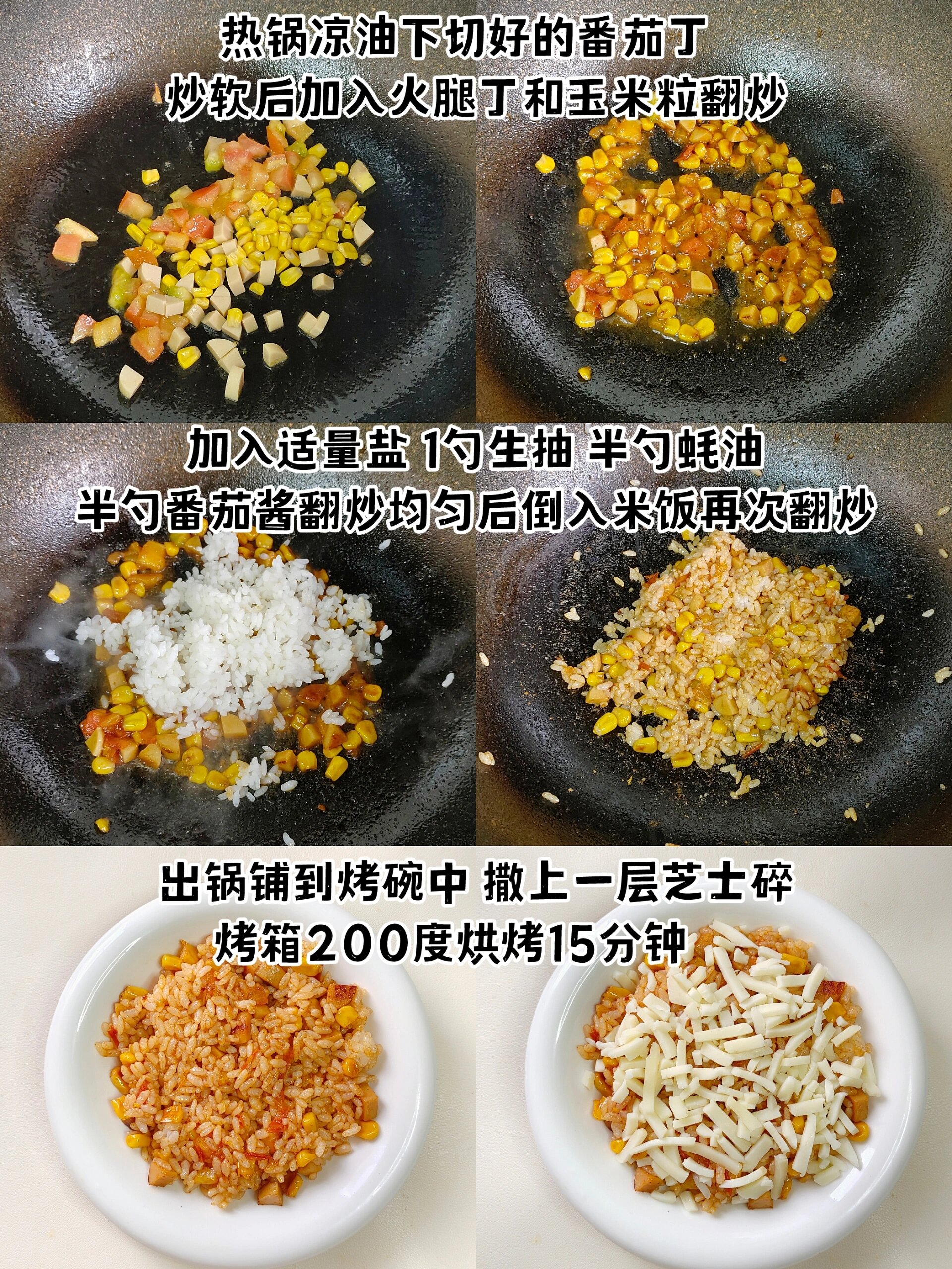 番茄芝士焗饭,家里有剩米饭的就像我这样做! 番茄芝士焗饭争着吃!奶香浓郁且瀑布拉丝!简单好做又好吃! 【食材】番茄、火腿、马苏大师马苏里拉干酪碎、玉米粒、米饭 【步骤】1、热锅凉油下切好的番茄丁,炒软后加入火腿丁和玉米粒翻炒 2、加入适量盐➕1勺生抽➕半勺蚝油➕半勺番茄酱翻炒均匀 3、倒入剩米饭再次翻炒均匀出锅铺到烤碗中,撒上一层芝士碎,烤箱200度烘烤15分钟 浓浓芝士味!还有酱汁包裹着米饭粒!一口下去也太安逸了!