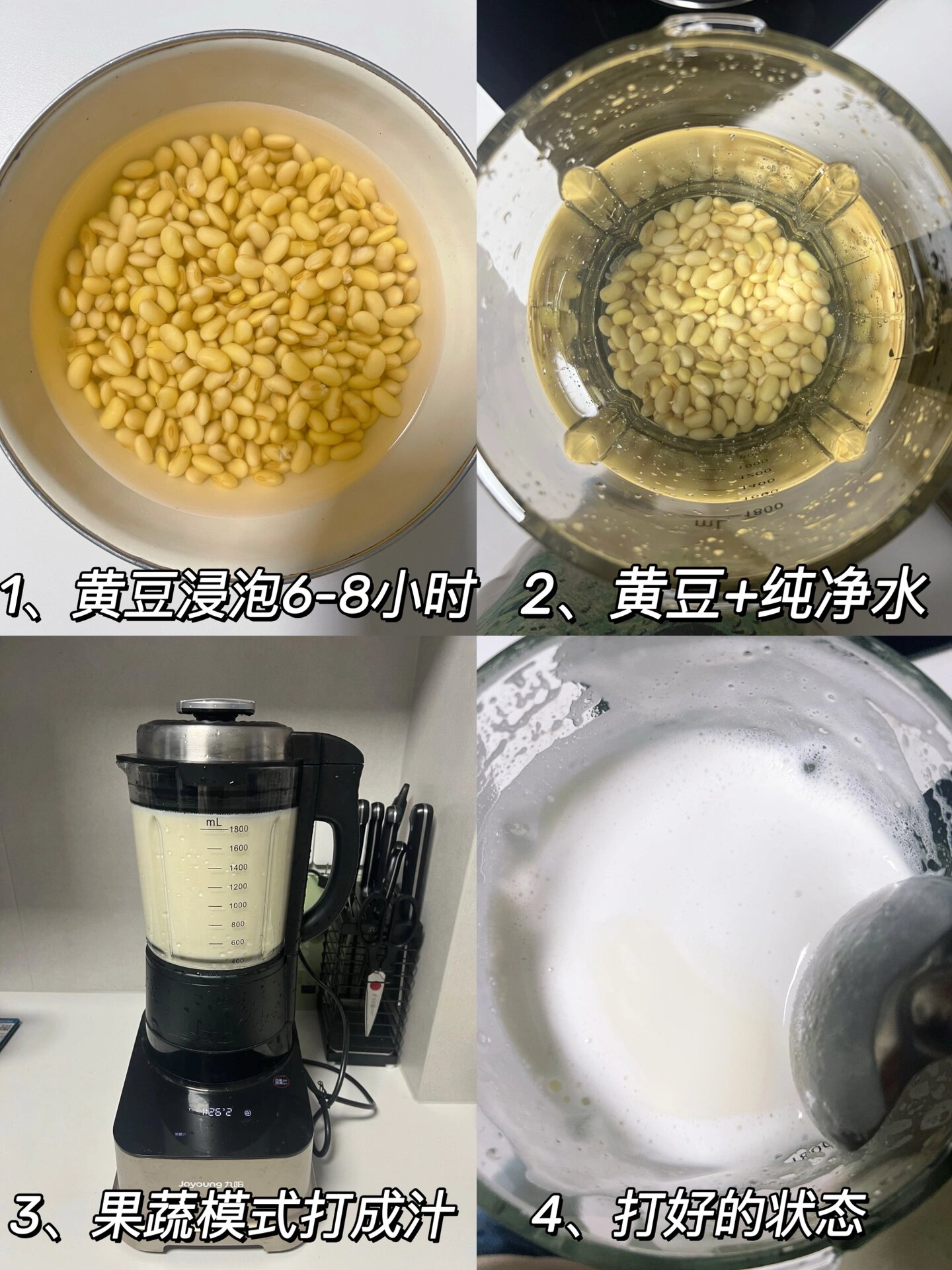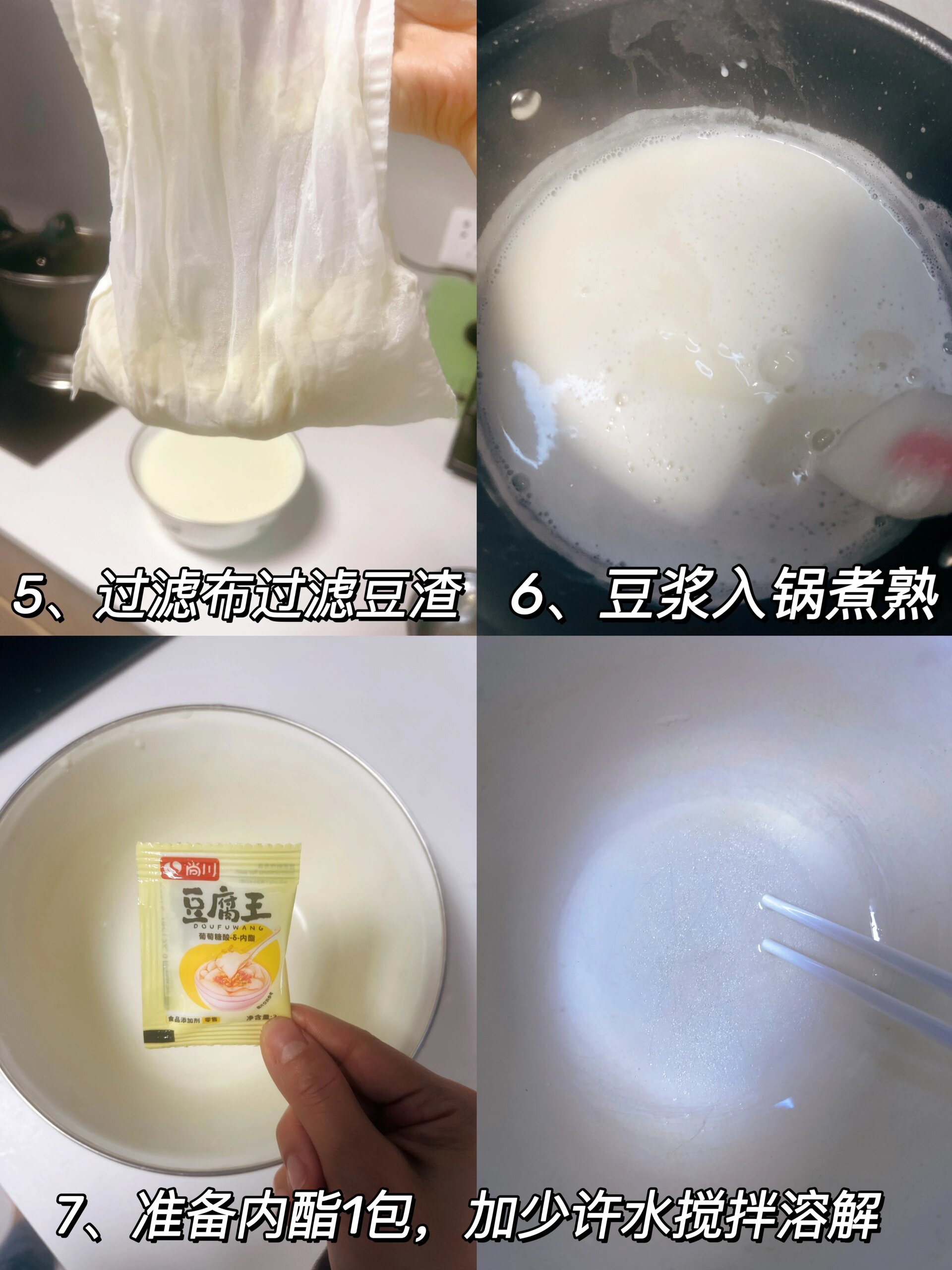 步骤:(图2-图4) 1、将160g干黄豆浸泡6-8小时。 2、泡好的黄豆+水1500ml放入破壁机选择果蔬模式,打成生豆浆。(大概3分钟) 3、用过滤布过滤掉豆渣,如果觉得渣多可多过滤一次,这一步是豆腐脑细腻的关键。 4、将豆浆入锅内煮熟。(豆浆80度就会沸腾,沸腾后继续煮5分钟左右才煮熟。)关火盖上盖子保温2分钟降温到80-90度。 5、保温期间,将1包3g的葡萄糖内脂放入容器内,放少许水搅拌溶解。 6、再将保温2分钟的热豆浆倒入容器中,处理掉上面的浮沫后盖上盖子静置15分钟即成豆腐脑。
