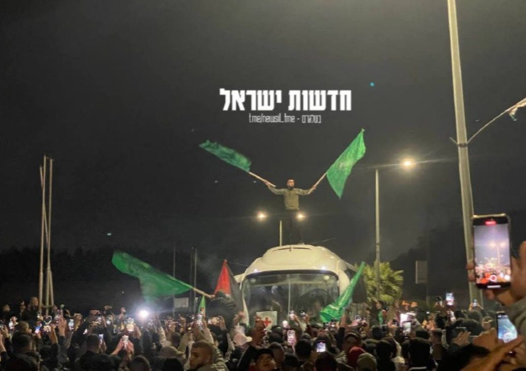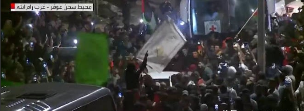 当地时间11月24日晚间,被以色列关押的巴勒斯坦囚犯的大巴车上悬挂着哈马斯旗帜。巴勒斯坦人欢呼并庆祝他们的抗争没有白费。