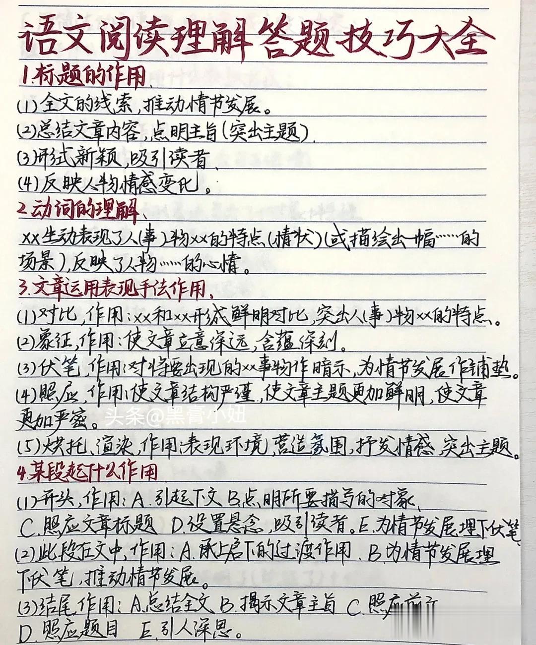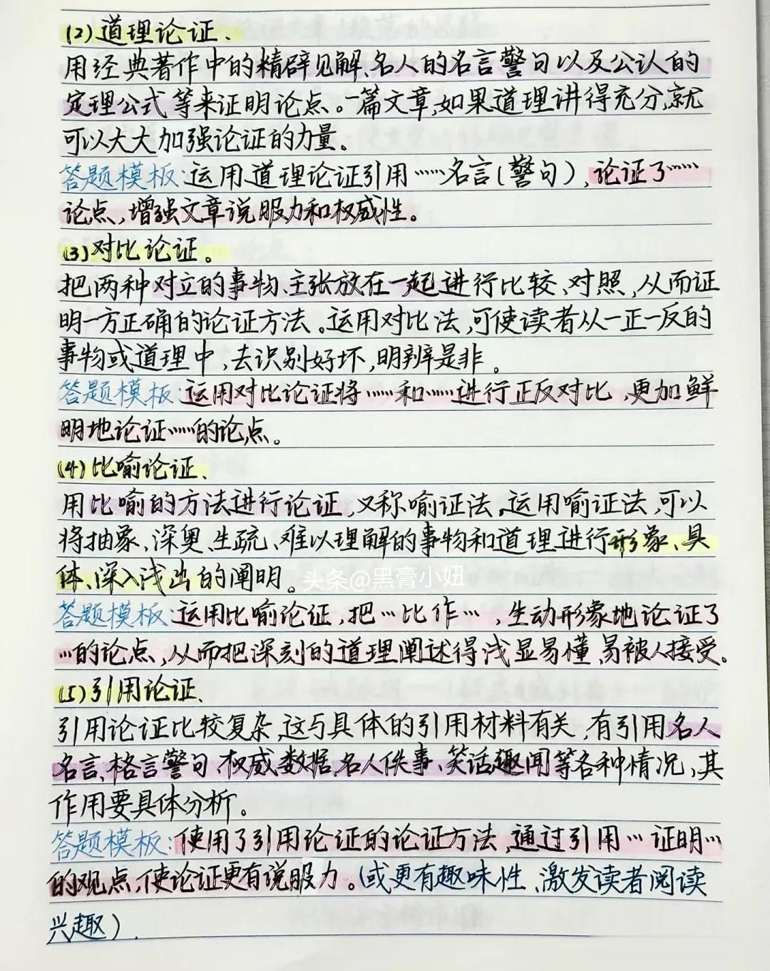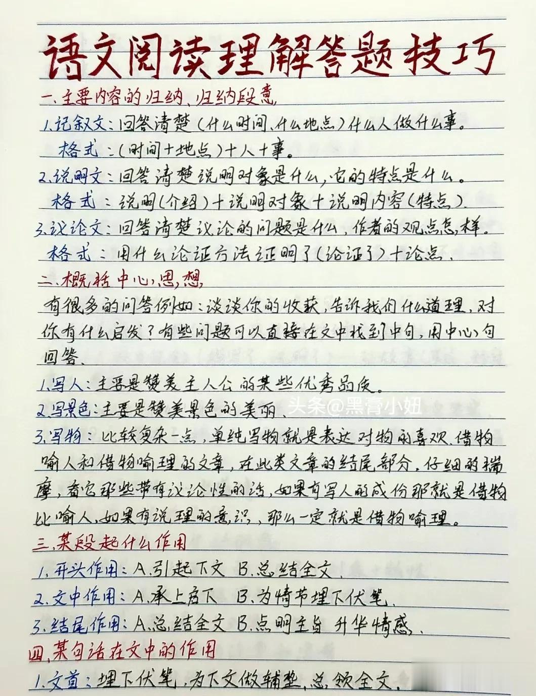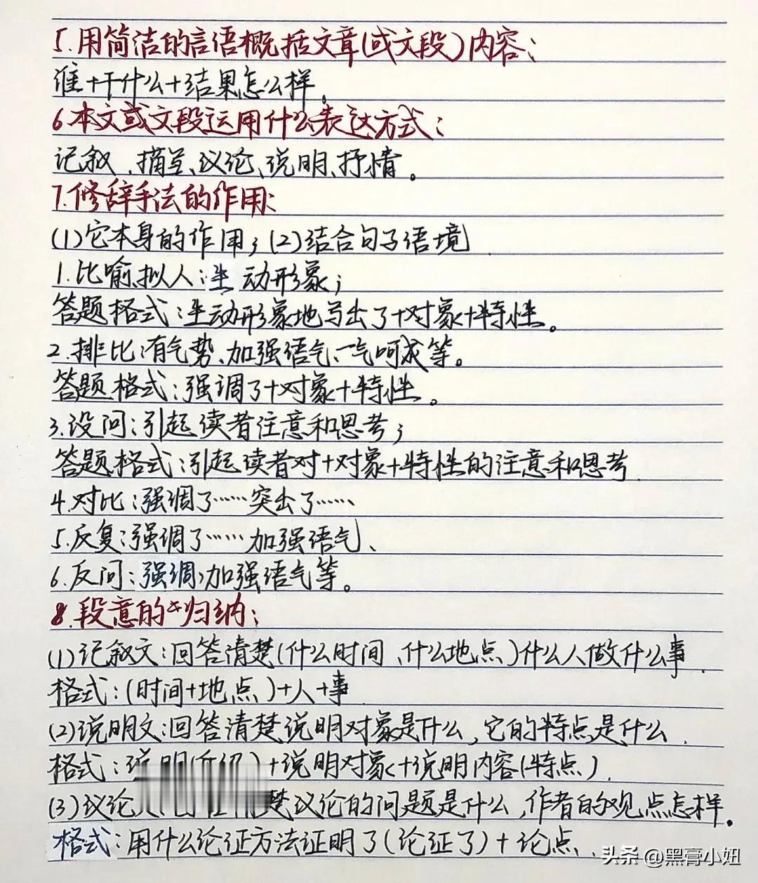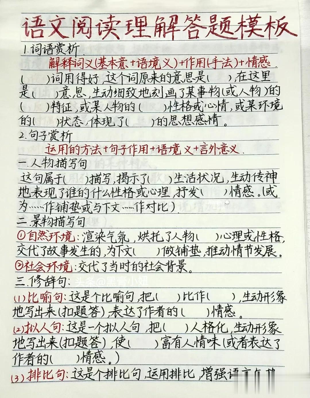 我的天呐!终于有人把语文阅读理解公式顺口溜、答题模板、文言文答题万能公式、议论文满分答题公式等全都手写整理出来了,真的太全面了,尖子班班主任都建议让孩子们把这些背下来,考试再也不怕文言文和阅读理解了! 尖子班班主任直言:语文成绩不理想,千万不要去补课,每天背三四个答题模板,坚持两个月,解题写答案的时候更快速更准确,成绩突飞猛进!真的超级有用呀,建议存起来慢慢看! 语文阅读答题模板公式