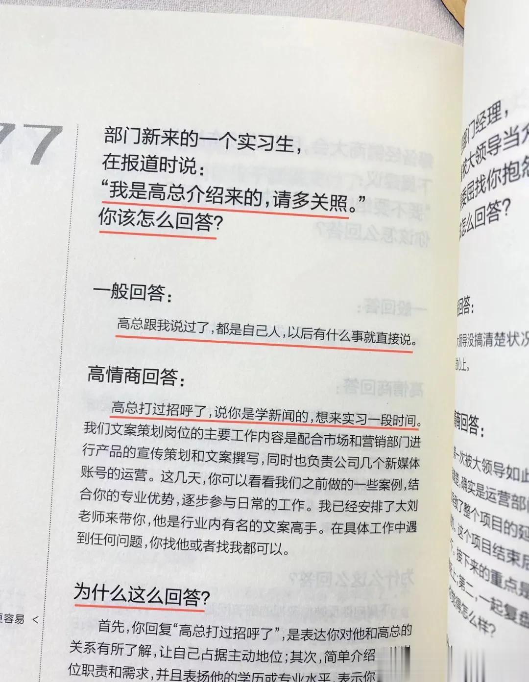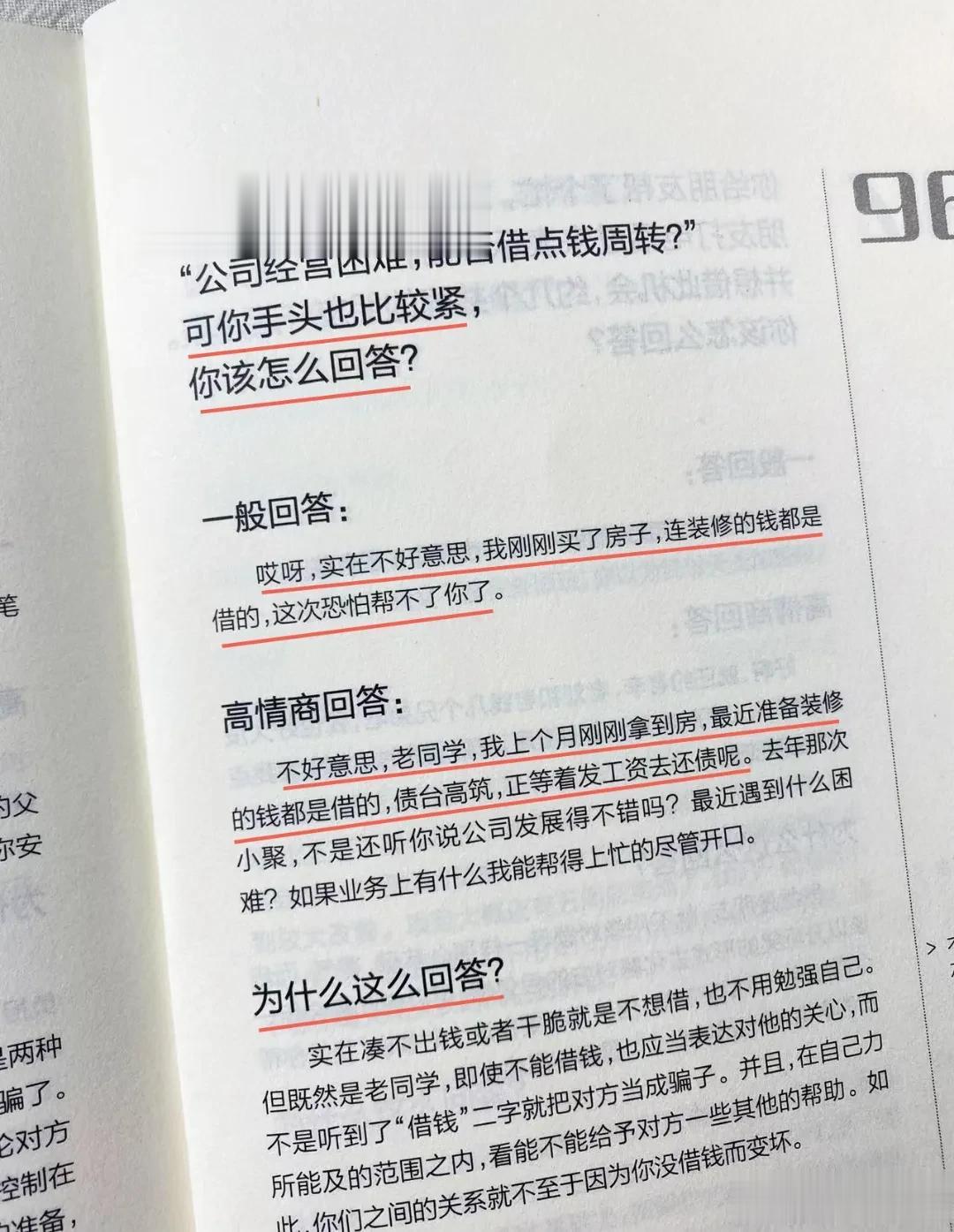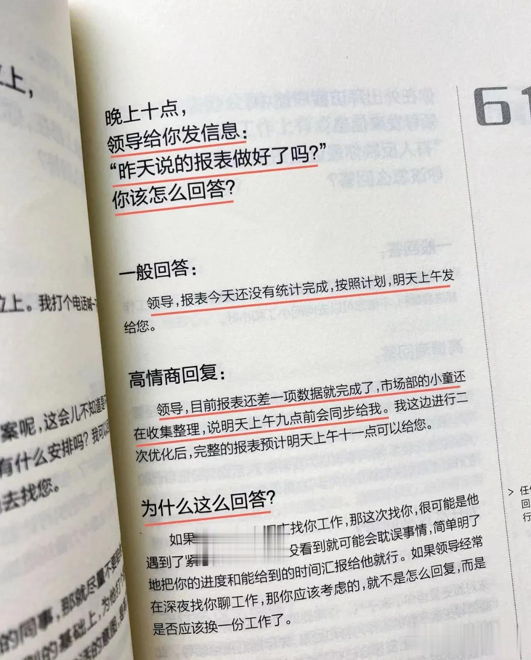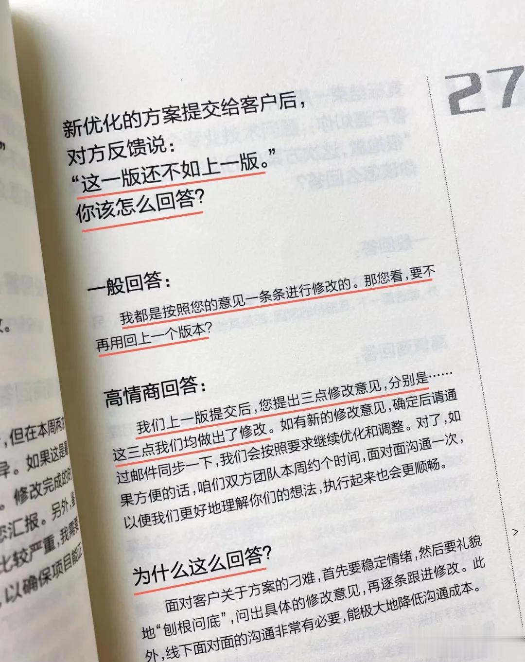 职场上,不要一开口就觉得很嫩,换种表达方式,让别人不敢小瞧你!那些在职场中混得好的人,早就摸清了领导的言外之意、弦外之音、识别同事的真情假意、避开职场的陷阱黑锅,在职场越混越好,深得领导厚爱!赶紧学起来!职场沟通技巧、化解尴尬、自我提升! 新优化的方案提交给客户后,对方反馈说: “这一版还不如上一版。”你该怎么回答? 晚上十点,领导给你发信息:“昨天说的报表做好了吗?”你该怎么回答? 部门新来的一个实习生,在报到时说:“我是高总介绍来的,请多关照。”你该怎么回答? 一位老同学找你说:“公司经营困难,能否借点钱周转?”可你手头也比较紧,你该怎么回答? 业务饭局上,客户端起酒杯说:“你不喝就是瞧不起我。”你该怎么回答? …… 说话不仅是一门学问,也是一门艺术。拥有好口才的人将会在职场、社交、恋爱、家庭中变得越来越成功。 职场这么回答你就赢了