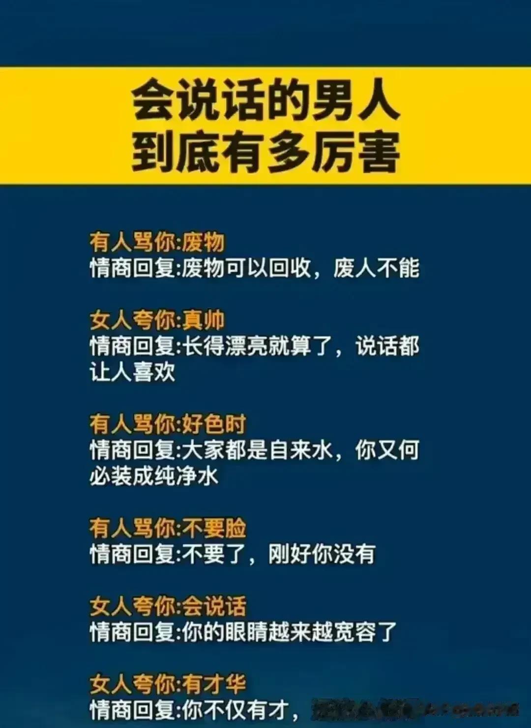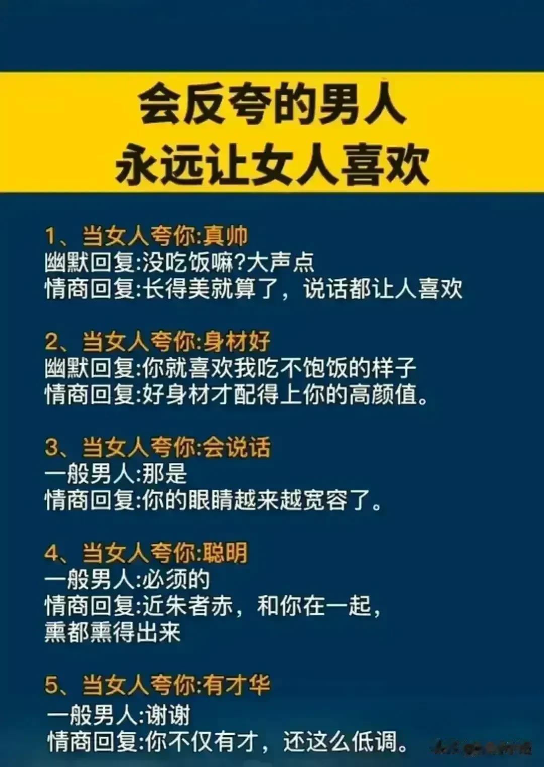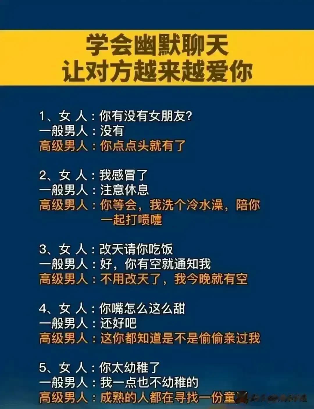 我滴天呐!原来会调情的男人,永远让女人上瘾,让对方越来越爱你!背下这份高情商幽默口才话术,让你的情商突飞猛进,不管和谁打交道,都能受到别人的喜欢,让你在生活和工作中聊出感情,聊出机遇!扩宽自己的人脉,越混越好,赶紧保存下来! 幽默的人往往具有大智慧,但幽默并非与生俱来的,幽默感是可以培养出来的,赶紧下方链接系统的学起来! 幽默沟通学沟通口才