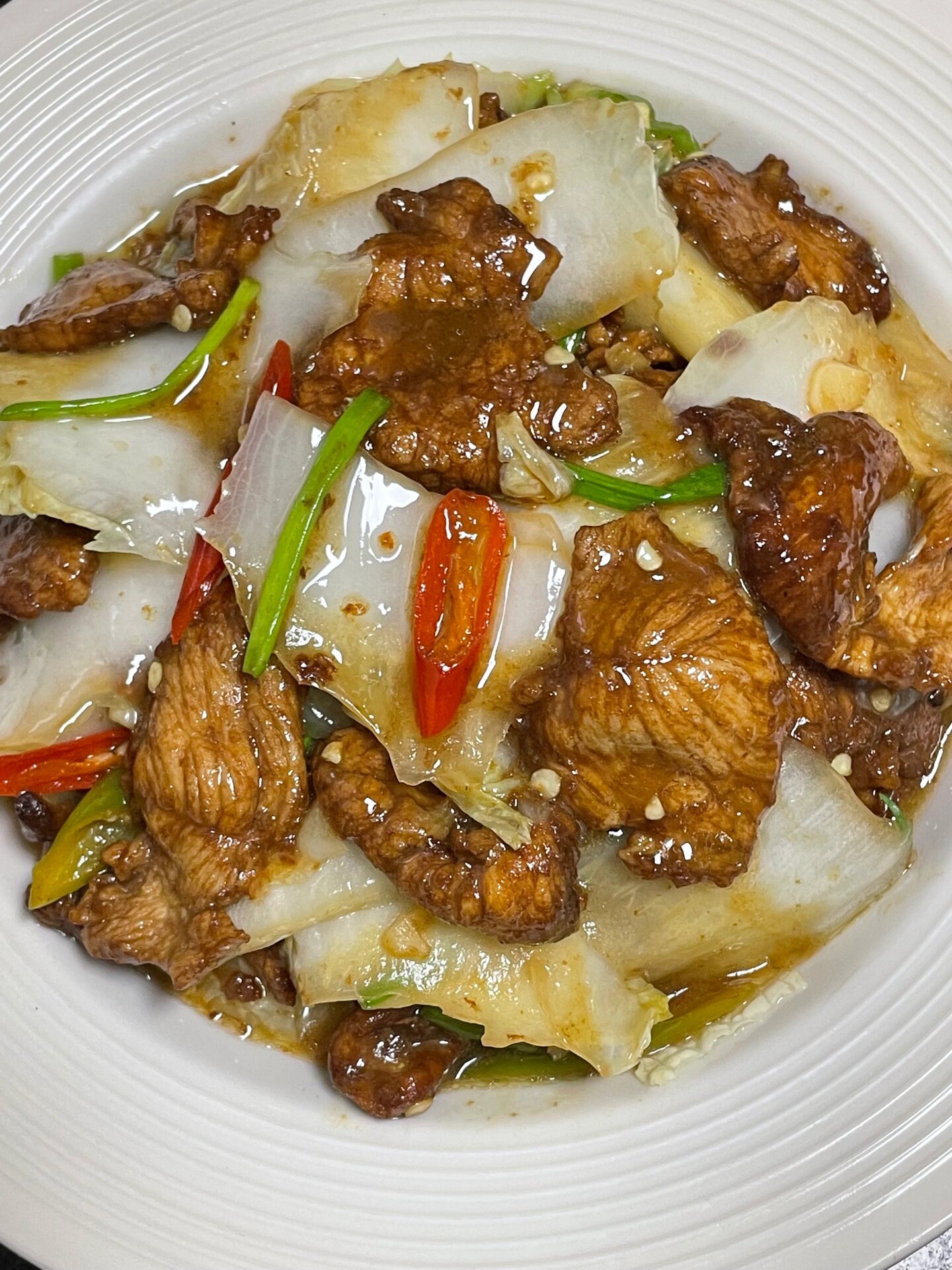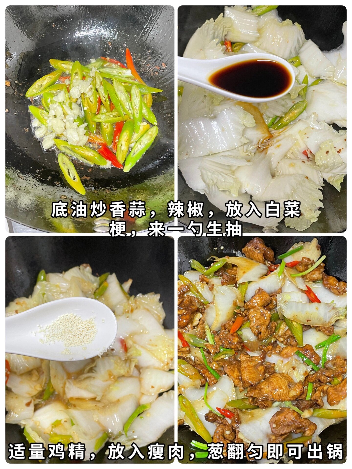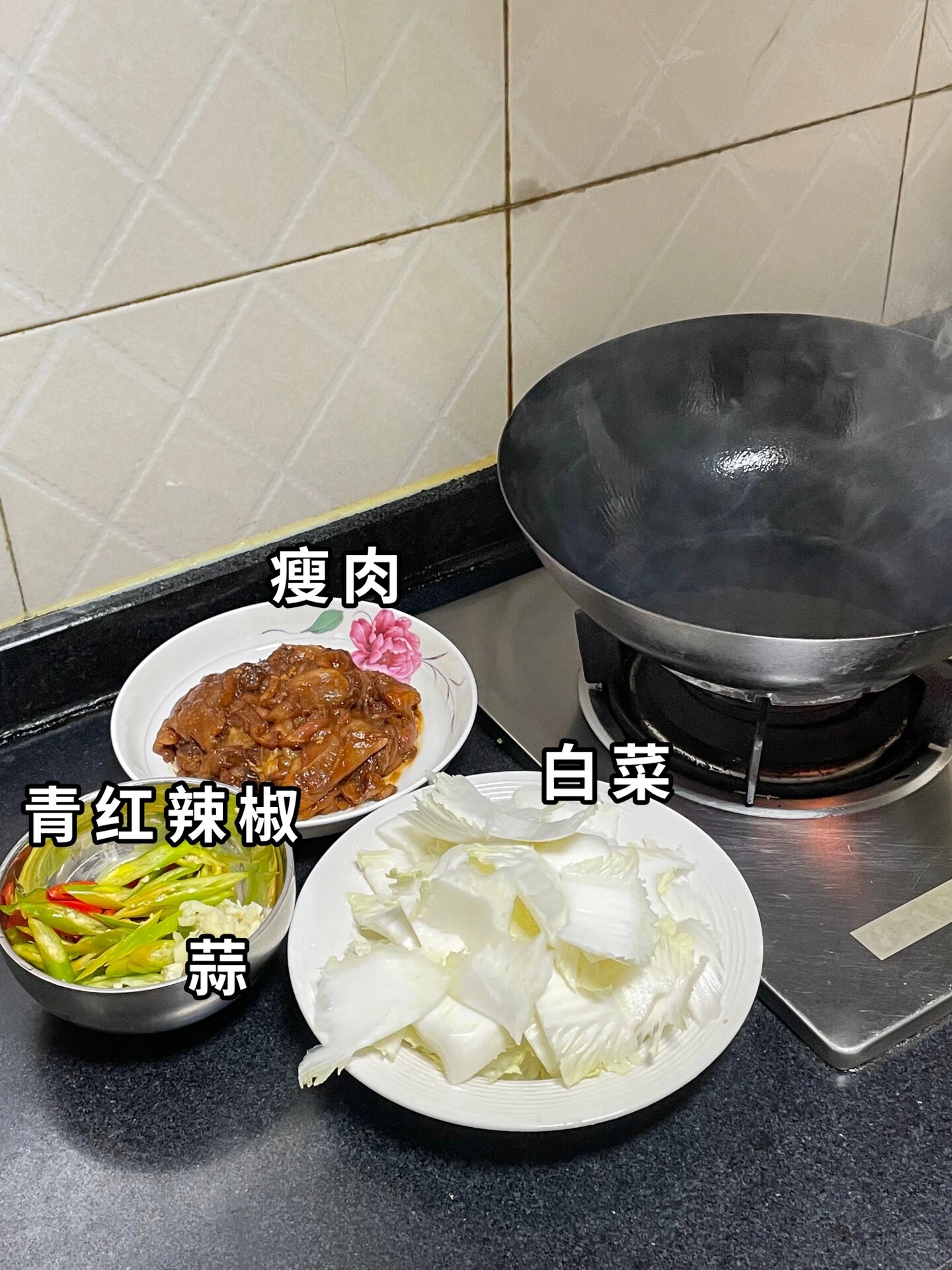 冬天又到了吃白菜的季节,很多朋友都喜欢吃白菜叶子,但不喜欢吃白菜梗。白菜梗不仅可以素炒,这样和肉炒其实也巨下饭的,今天给大家分享一下,喜欢的姐妹可以尝试做一下 食材:瘦肉,白菜 做法:1、瘦肉切片放入葱姜水、生抽、老抽、胡椒粉、淀粉、花椒抓匀腌制十分钟。 2、起锅烧油,油热将瘦肉滑熟,捞出备用。锅里留底油,将青红辣椒和蒜炒香,放入切好的白菜块。来一勺生抽,加上适量的鸡精翻匀,再放入我们滑熟的瘦肉和葱段。翻匀即可出锅。 这样的做出来的白菜炒肉既保留了白菜的脆爽,又有肉的香气,真的是巨下饭的哦。
