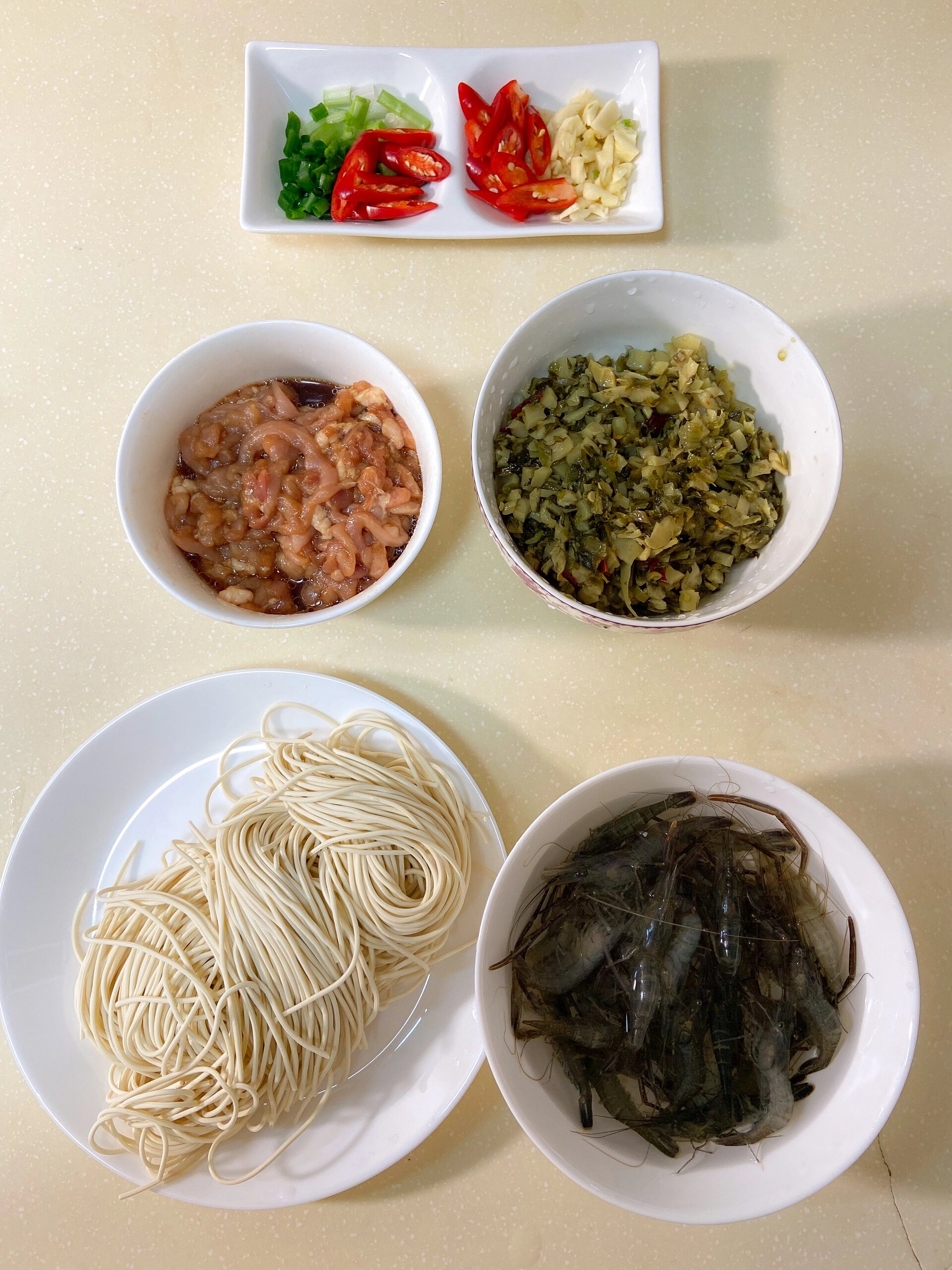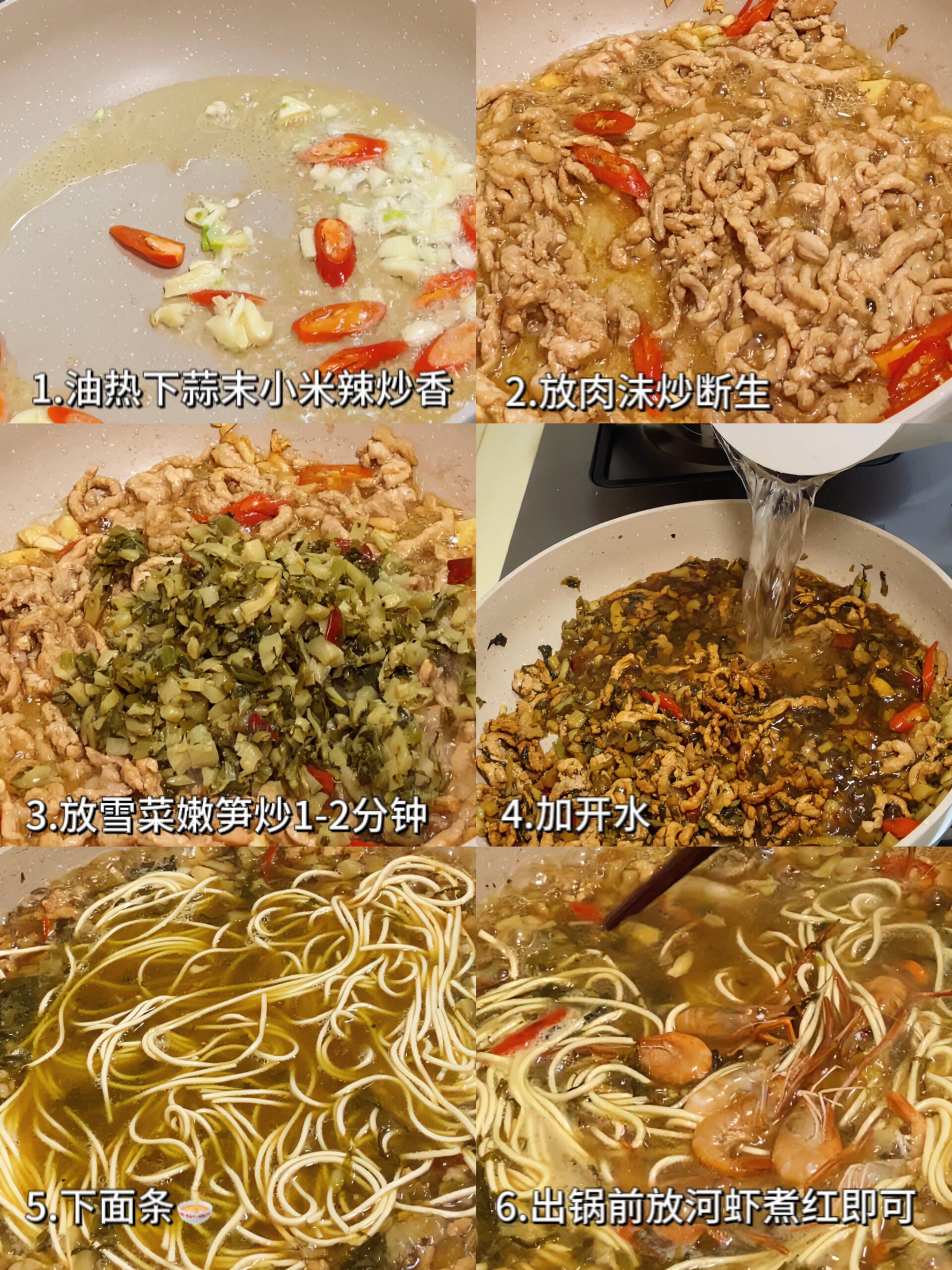 食材:雪菜嫩笋一包,肉丝5块钱的,小河虾,面条