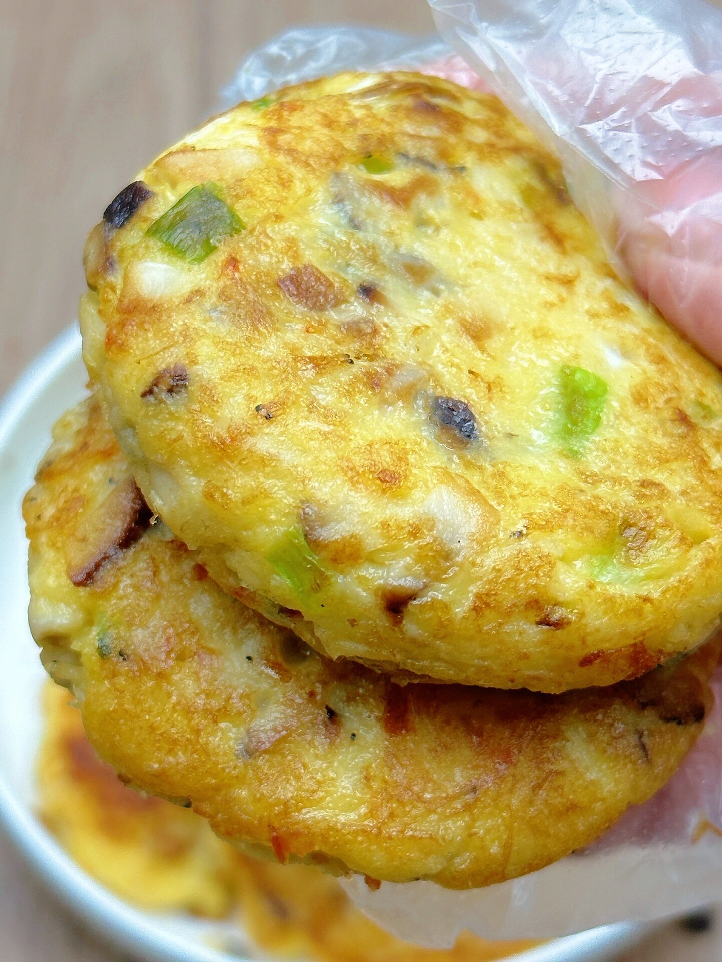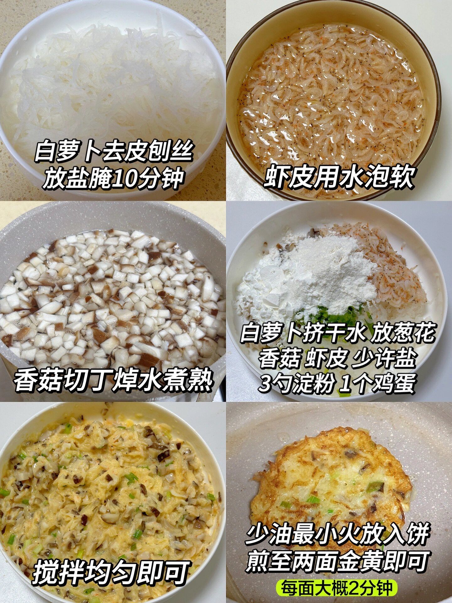 冬季要多吃萝卜,香煎萝卜饼!一个才20大卡 又到了吃白萝卜的季节啦~今天给姐妹们分享一个我从小到大都喜欢吃的香煎萝卜饼,清甜软糯,做法简单,一大盘也才200多大卡,减脂期的姐妹们赶紧安排啦~ 食材:虾皮、白萝卜、香菇、葱花、淀粉、鸡蛋 做法:如图所示~ 1、白萝卜去皮刨丝,放盐腌制10分钟捏干水分 2、香菇切丁焯水煮熟,虾皮泡水弄软 3、食材全部放一起,放葱花,3勺淀粉➕1个鸡蛋➕少许盐搅拌均匀 4、锅里少油最小火放入饼,煎制两面金黄即可开吃(第一面煎2~3分钟再翻面哟,不然容易不成型)