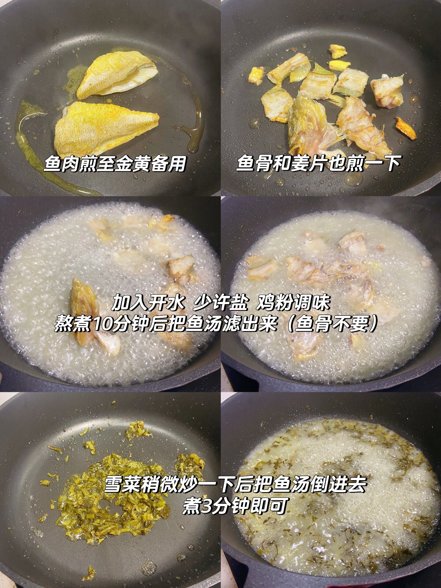 把熬好的鱼汤滤出来备用,锅内加少许油,把雪菜炒一下。倒入鱼汤煮3分钟,让雪菜的味道充分融入鱼汤中。