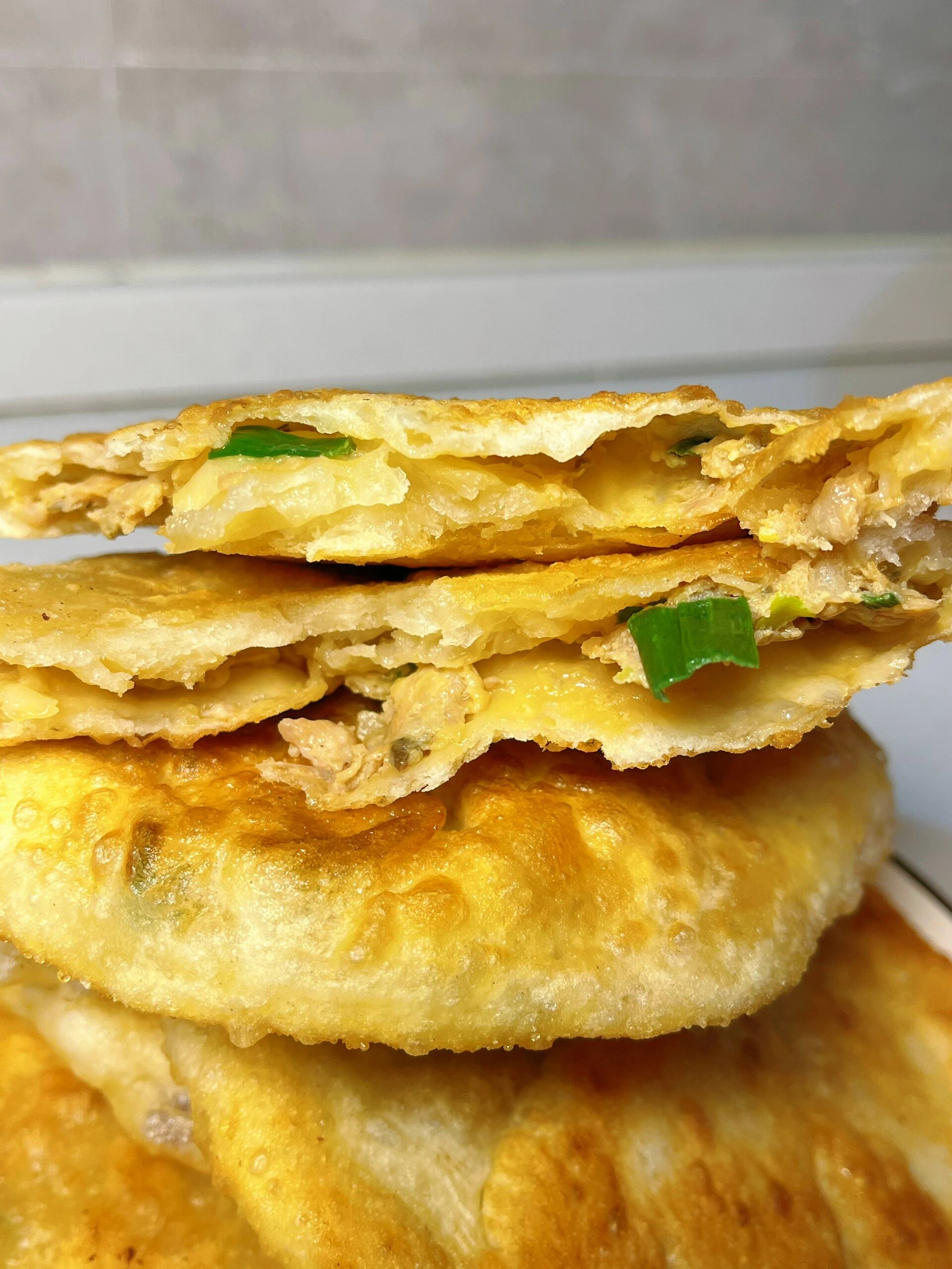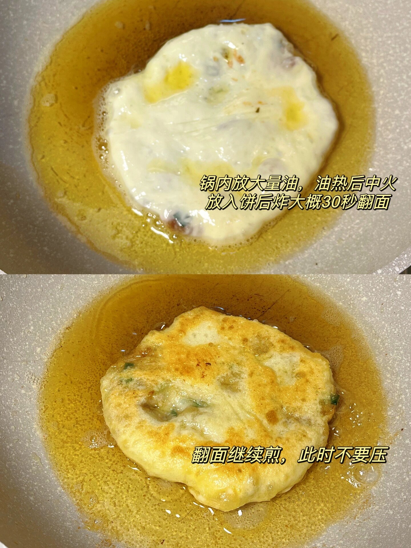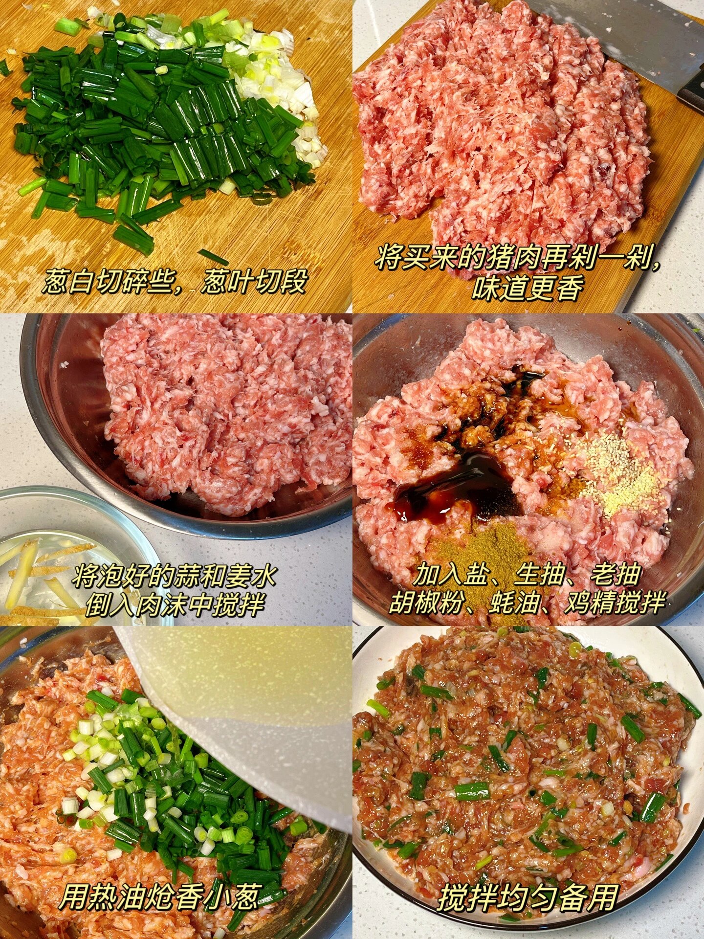 注意点:调肉馅时,小葱一定要用热油炝香,这样整个饼会更香
