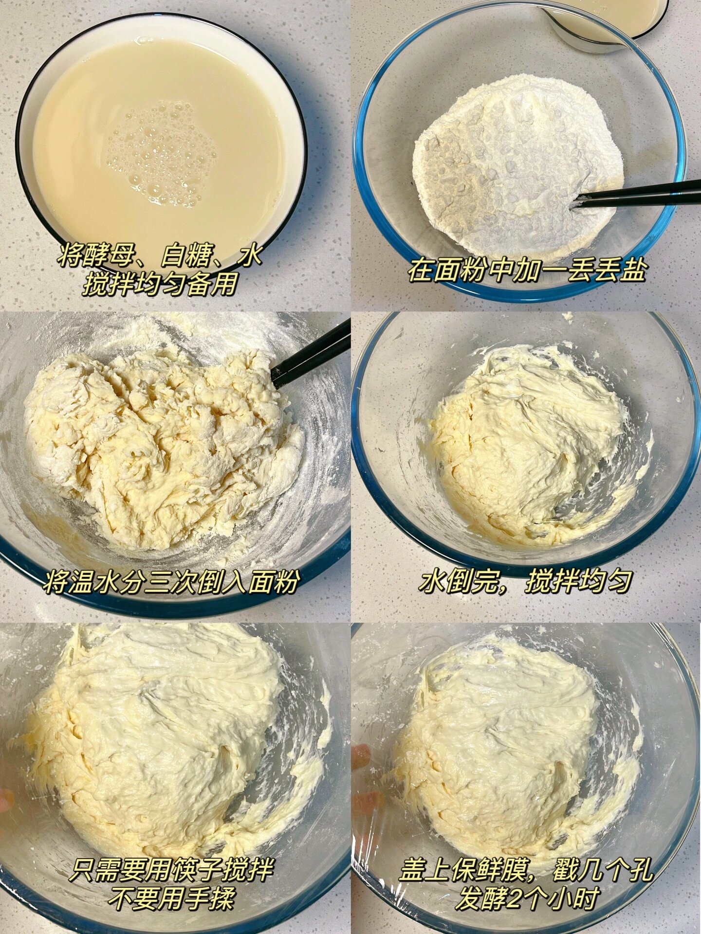 一定要用筷子搅拌面粉,如果不想糊一手的话,就别动手啦!本身这个比例水就是比较多的,烤出来饼会比较蓬松,所以用筷子稍微搅拌均匀就可以发酵了