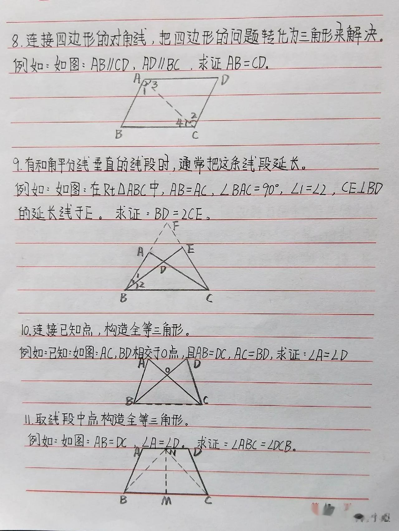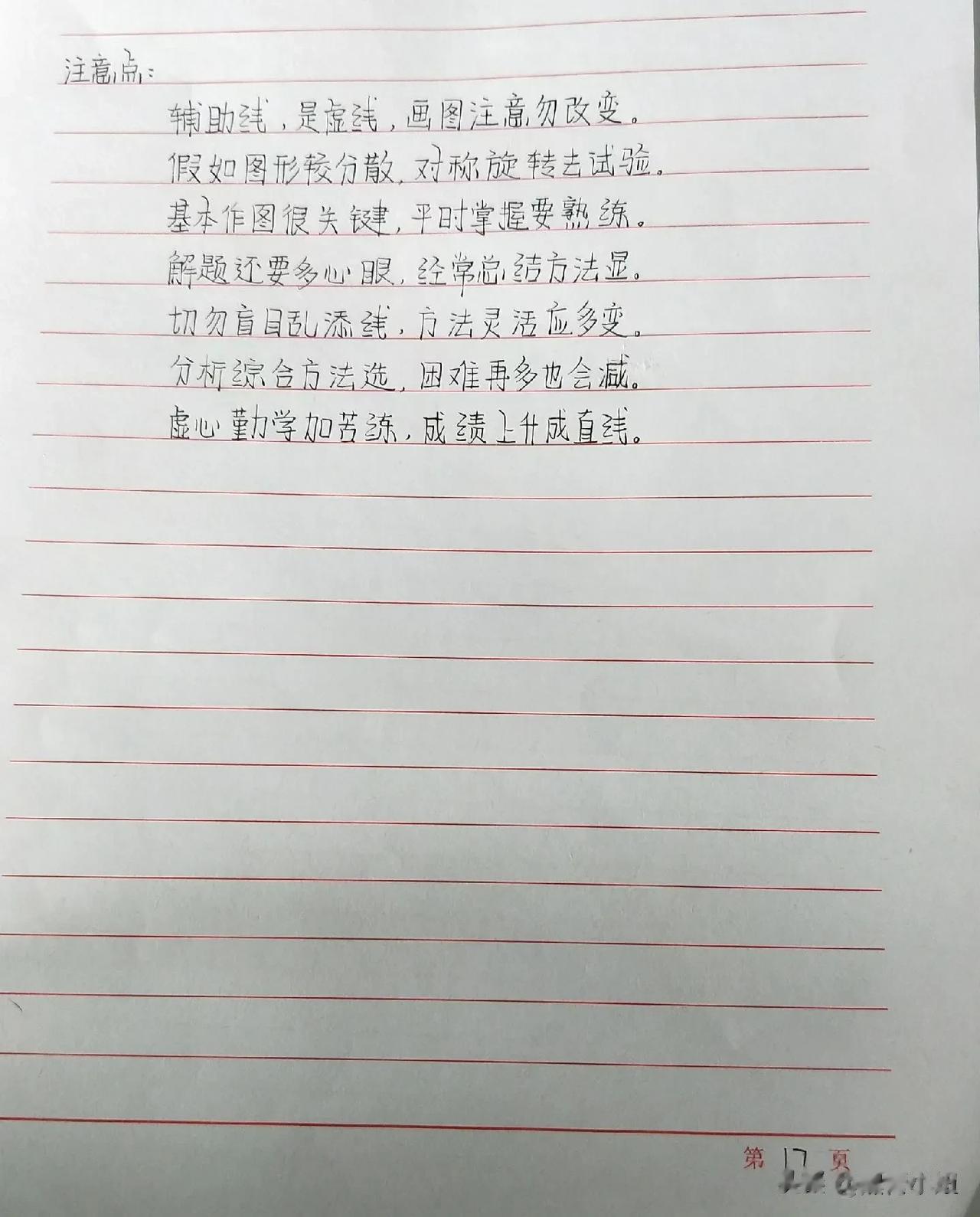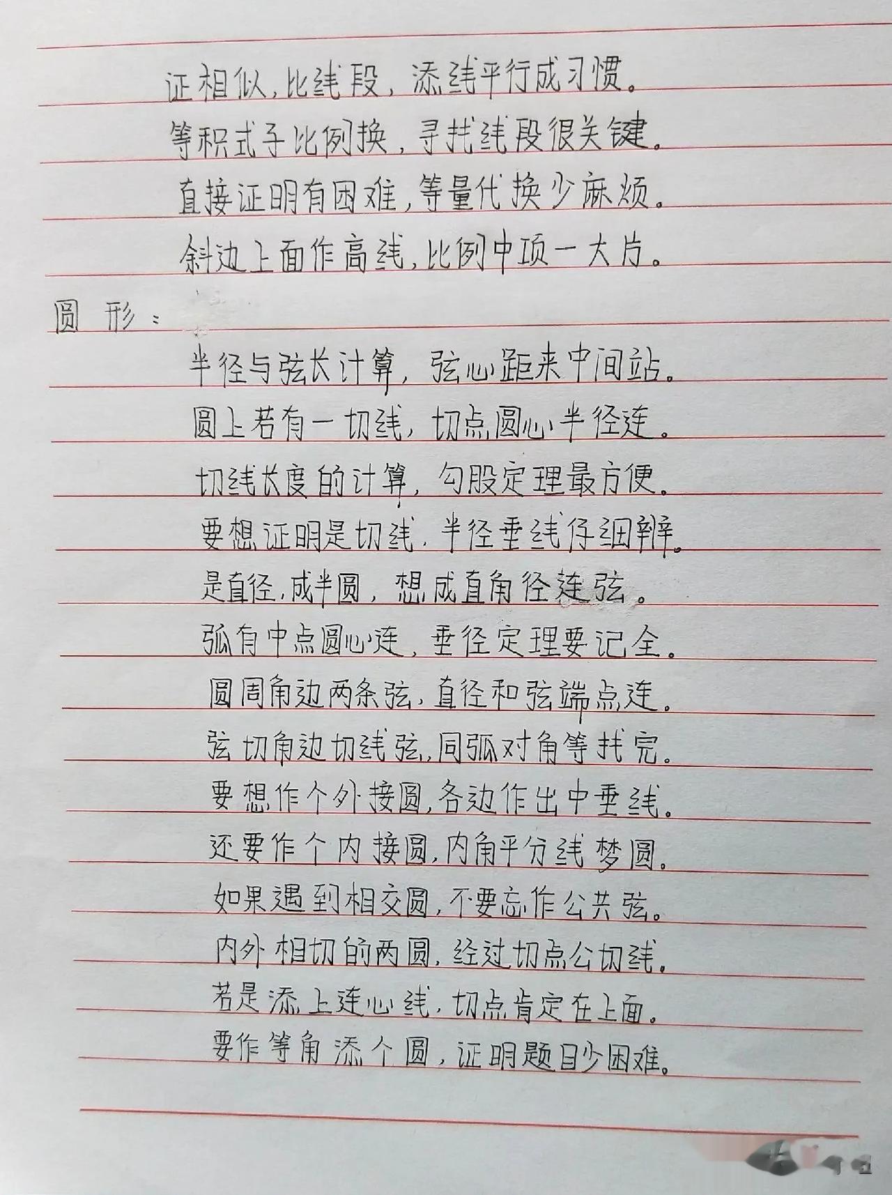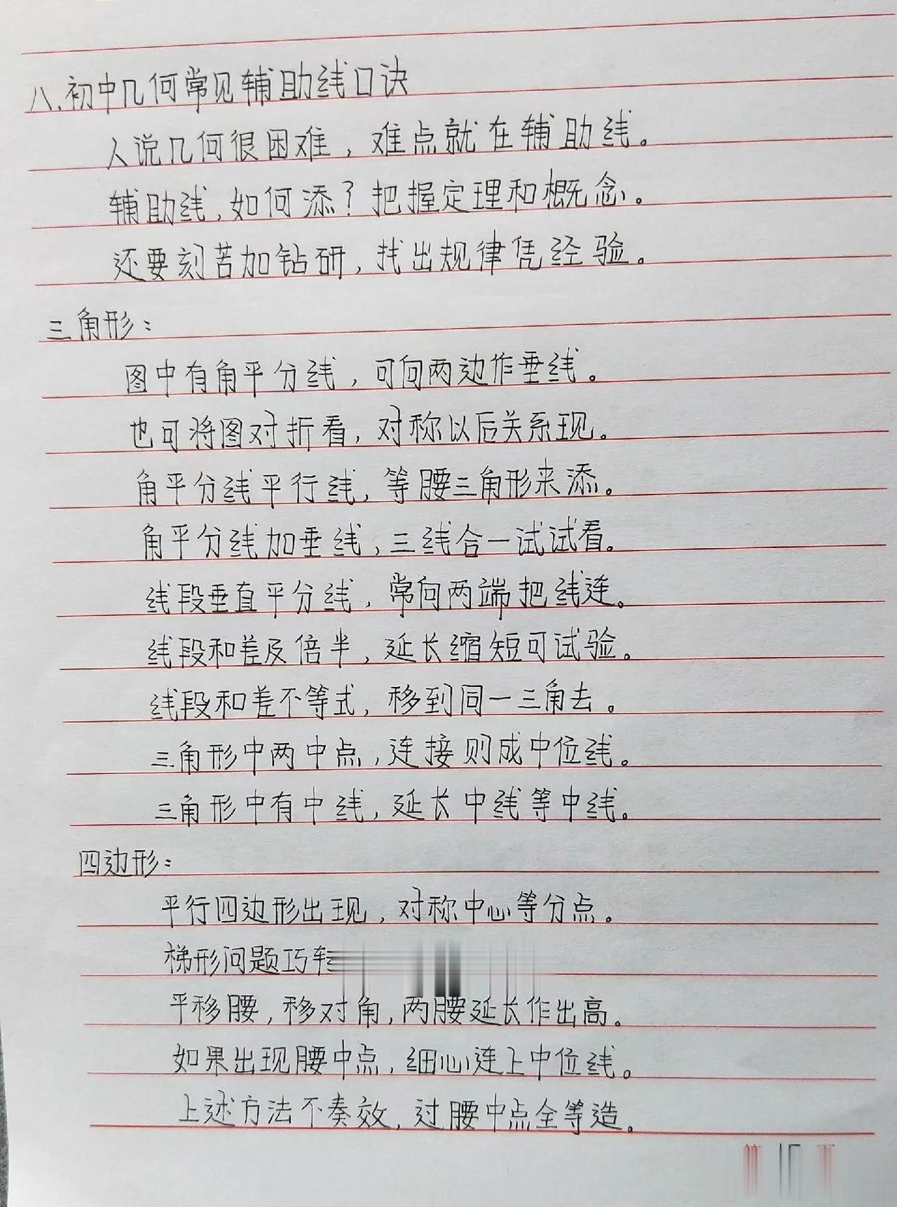 口诀一背,做题全对!一位中考状元坦言:想要几何部分做题又快又准,一定要把添加辅助线的技巧和口诀背下来,全都手写在这18张纸上,吃透能更好地理解几何问题,并找到解决问题的方法。家有初中生的赶紧收藏保存下来!全是学霸亲自总结出来的学习方法,满满的干货! 初中几何是占据初中数学的半壁江山,掌握技巧做题事半功倍,还是需要通过不断的练习和总结才能拿高分!更多几何方法和练字习,下方链接走起! 初中几何模型解题大招