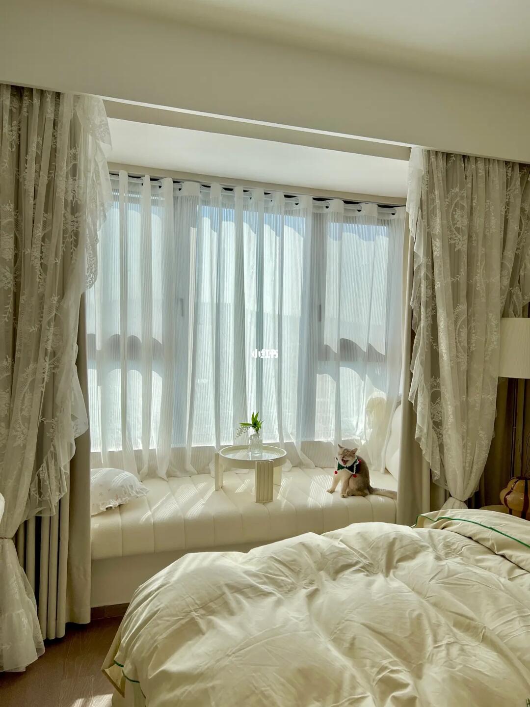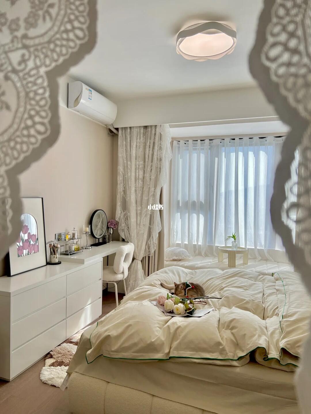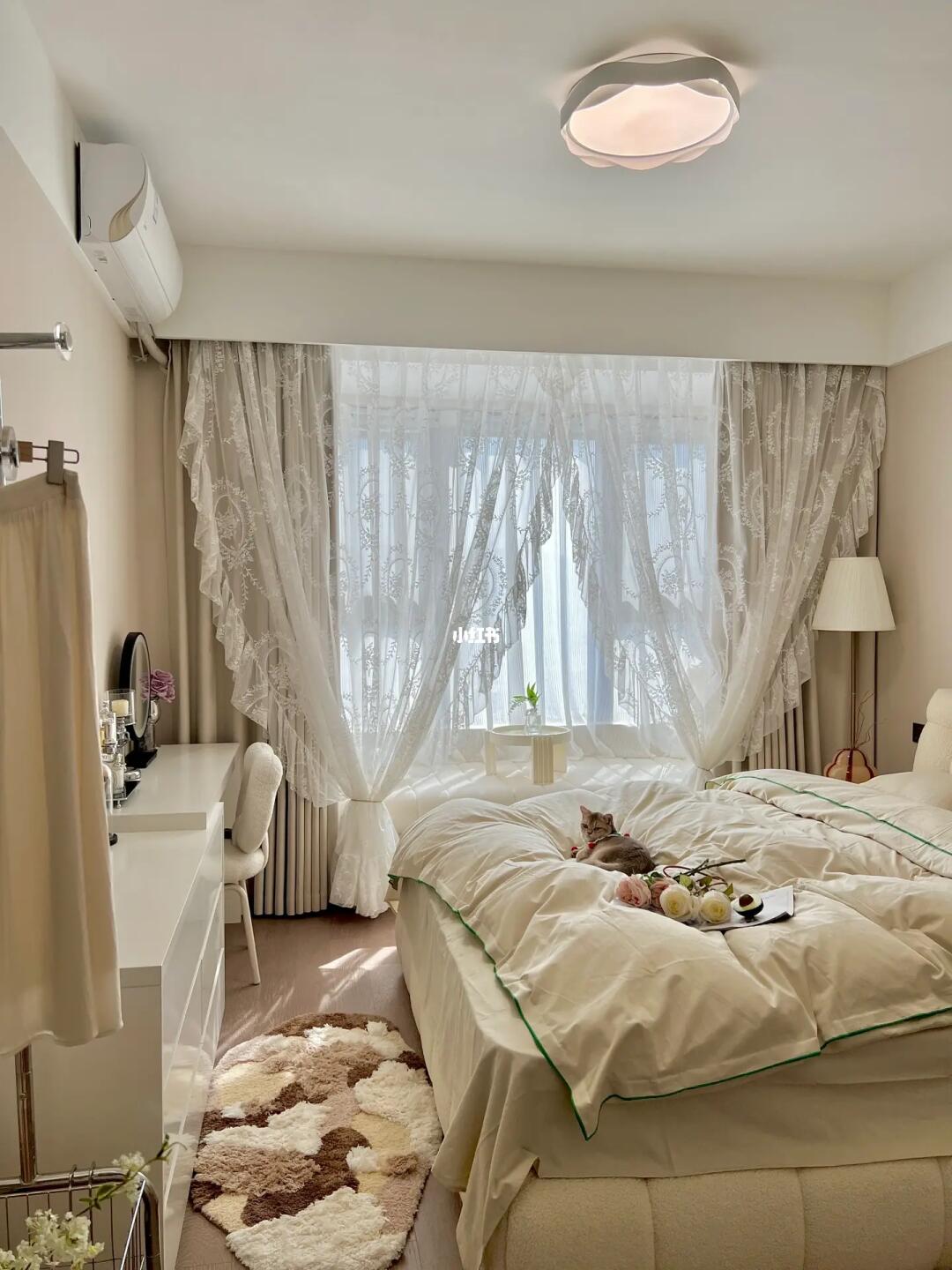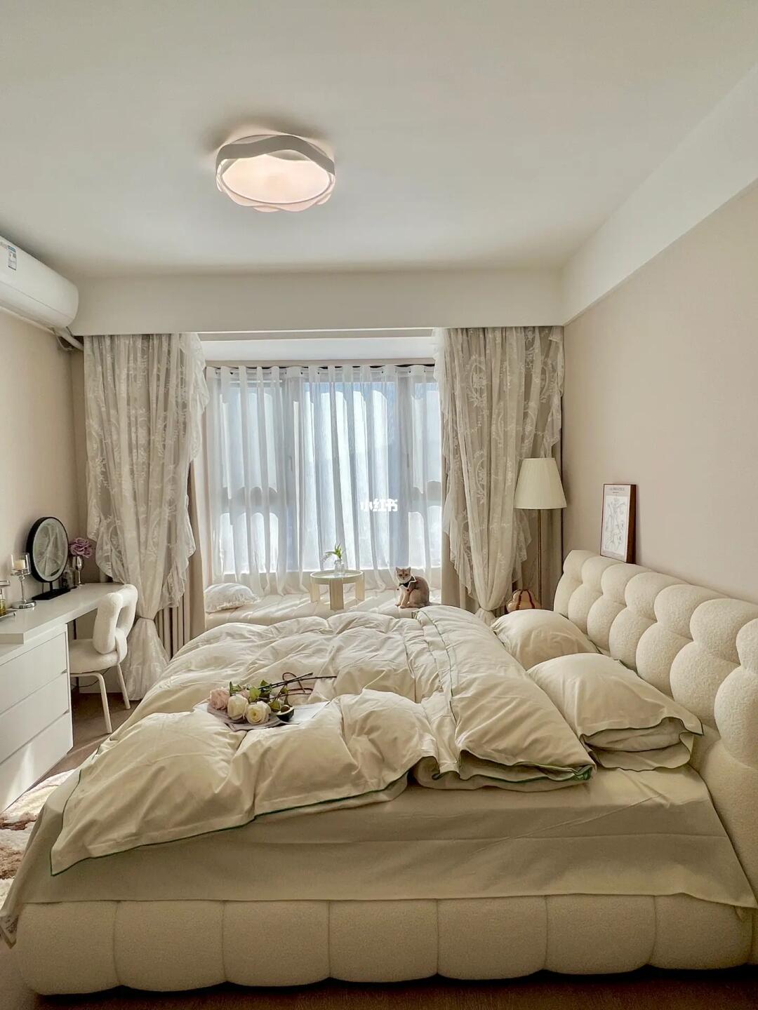 好喜欢我的13平米小卧室 奶呼呼的太好宅啦~ 尤其是阳光洒在飘窗垫的时候 整个人都被治愈了☀️ · 给软软的棉花糖床换上新的四件套 在奶油花边吸顶灯的照射下 房间的每一处角落都美到了心里 其实,卧室不需要多复杂的装饰 阳光就是最好的风景🌅
