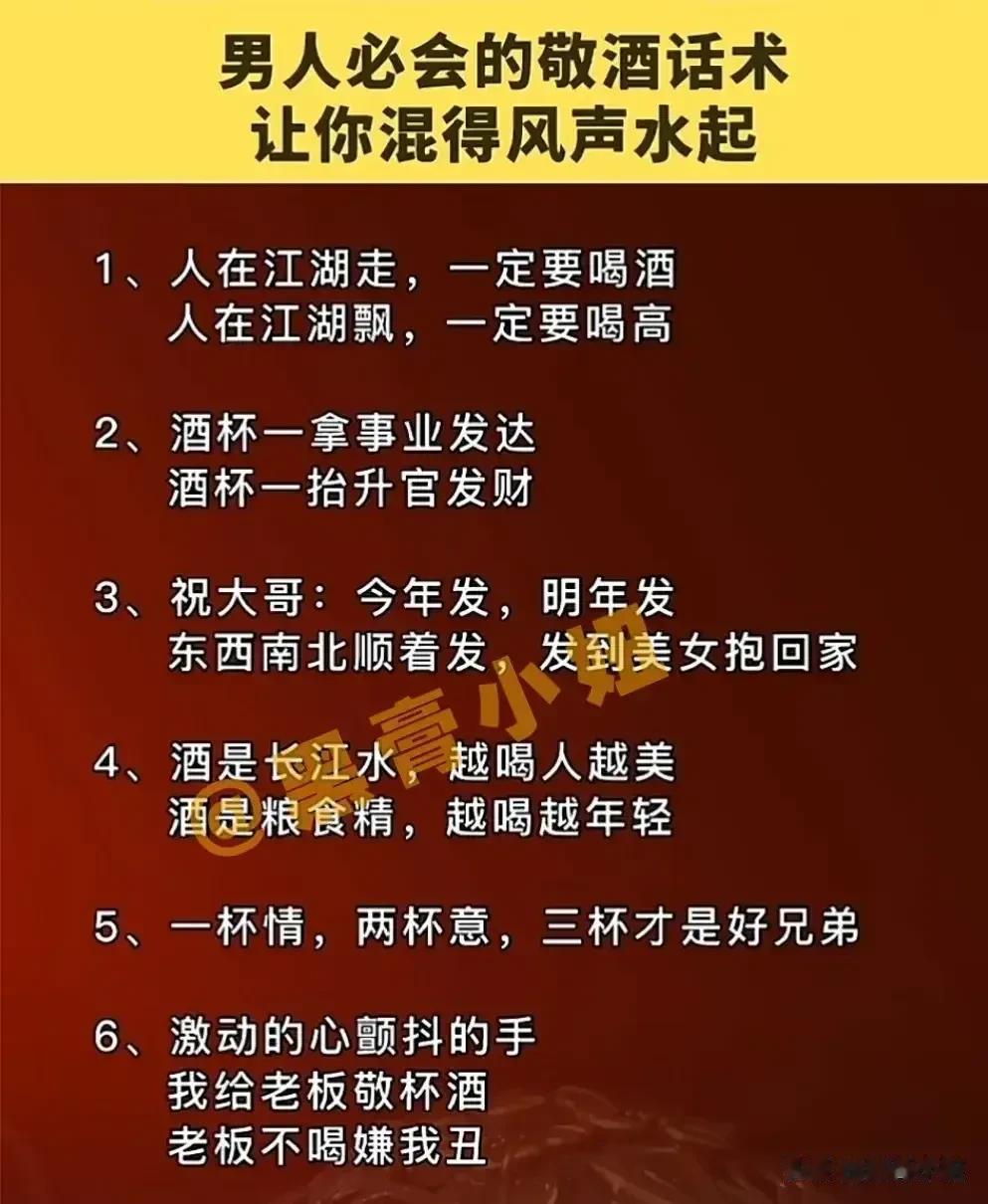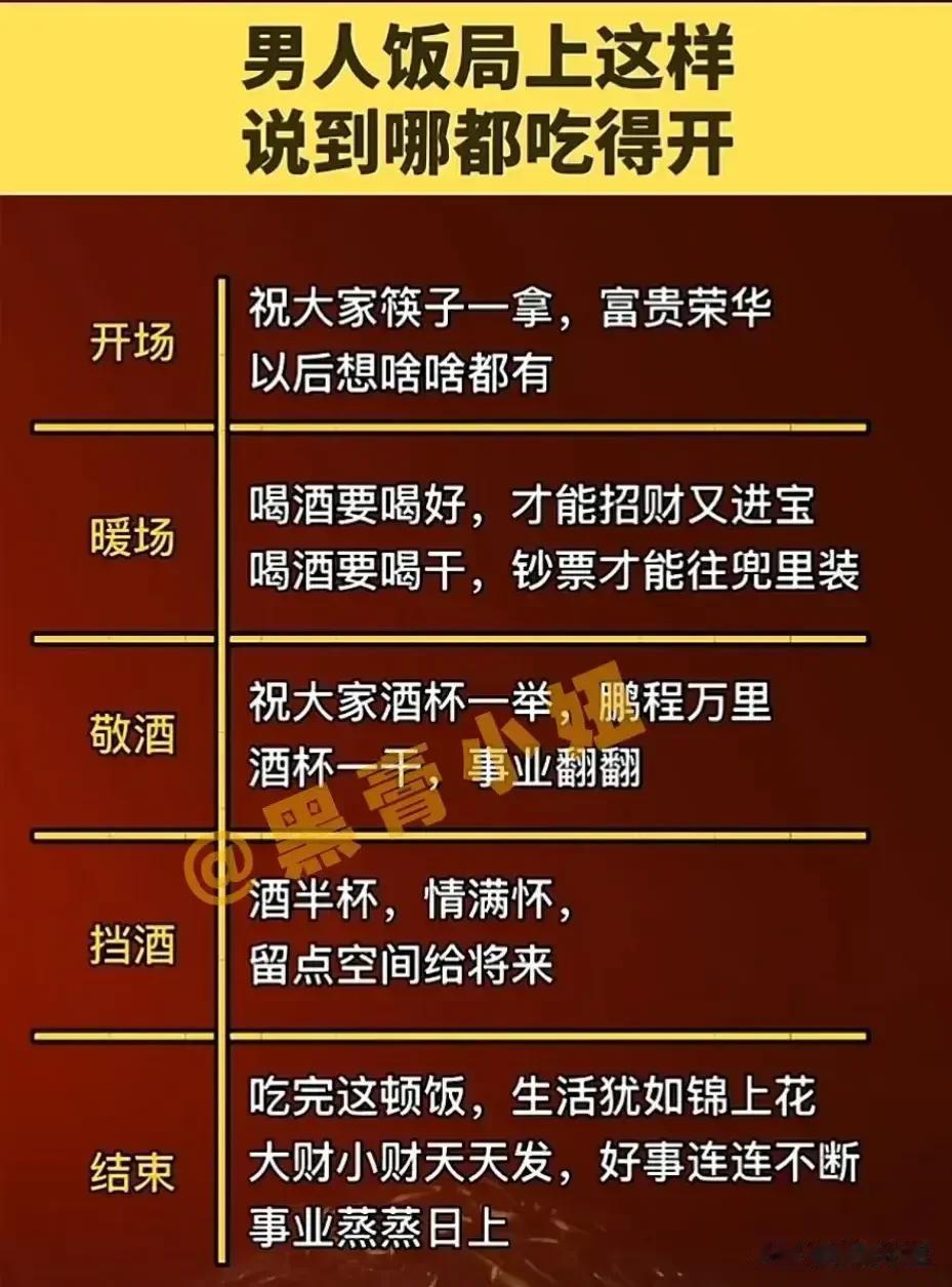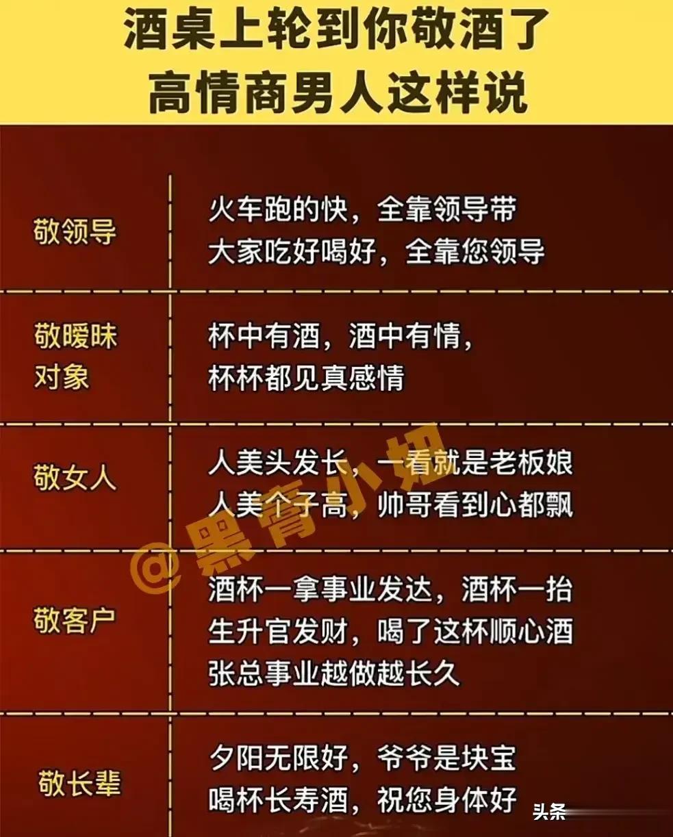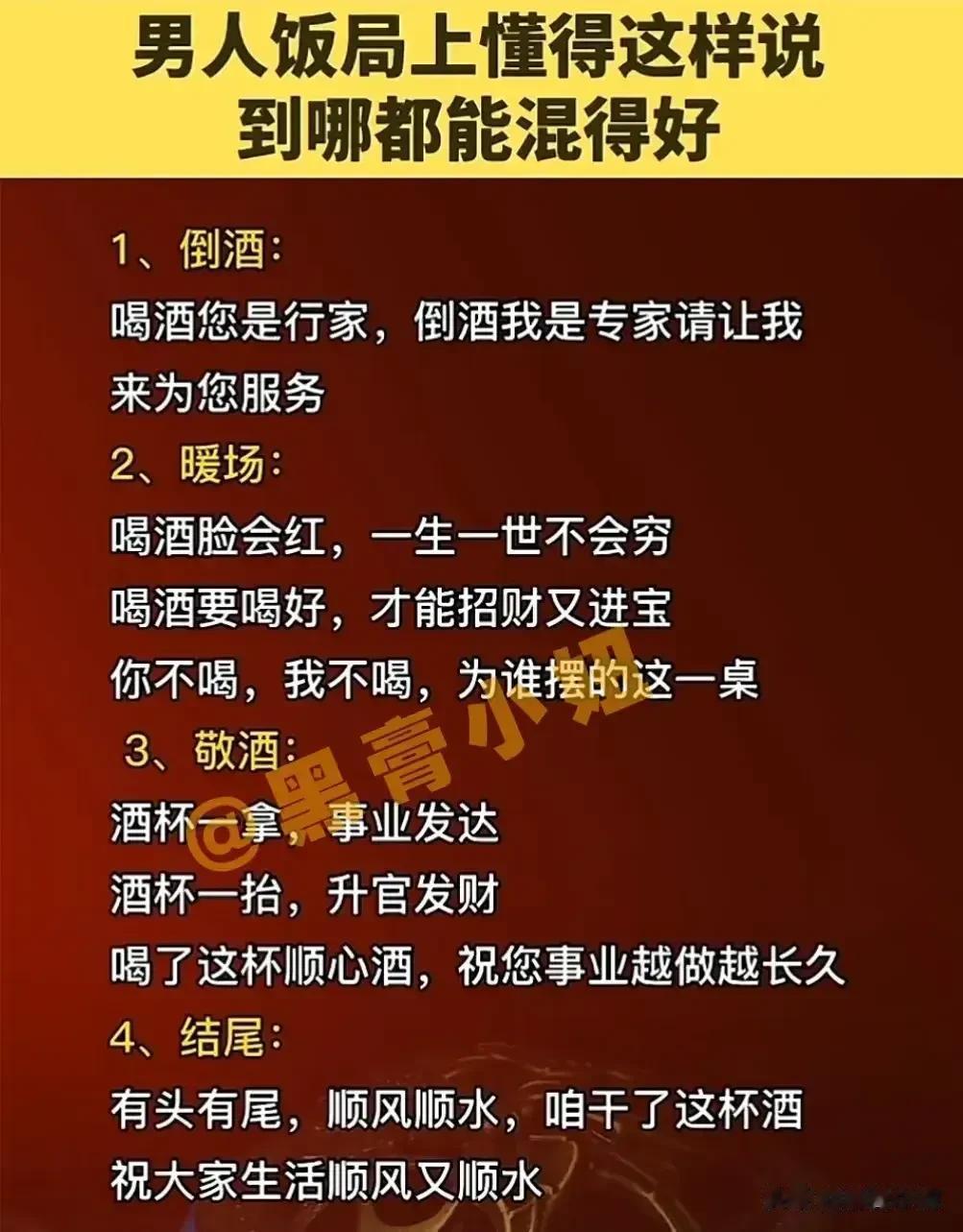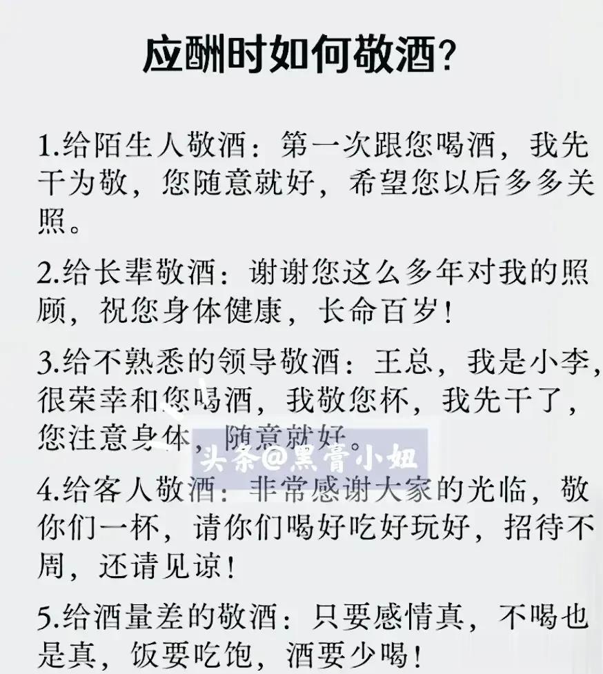 天啦!到今天才知道,在酒局应酬中混得好的人,原来早就对这些应酬规矩和祝酒词倒背如流了,这是我见过整理最全的,不管是敬长辈、敬客户、敬领导,还是挡酒话术,或是调节气氛,办事话术,都在这里了。背下来,轻松应对各种饭局酒局应酬! 中国是一个讲关系、讲人情的社会,你会应酬会说话会做人,自然就顺风顺水!不管是生活还是职场中,应酬都是无法逃避的,只要掌握了这套应酬说话办事技巧,都能让你左右逢源,事半功倍!赶紧学起来! 中国式应酬社交礼仪