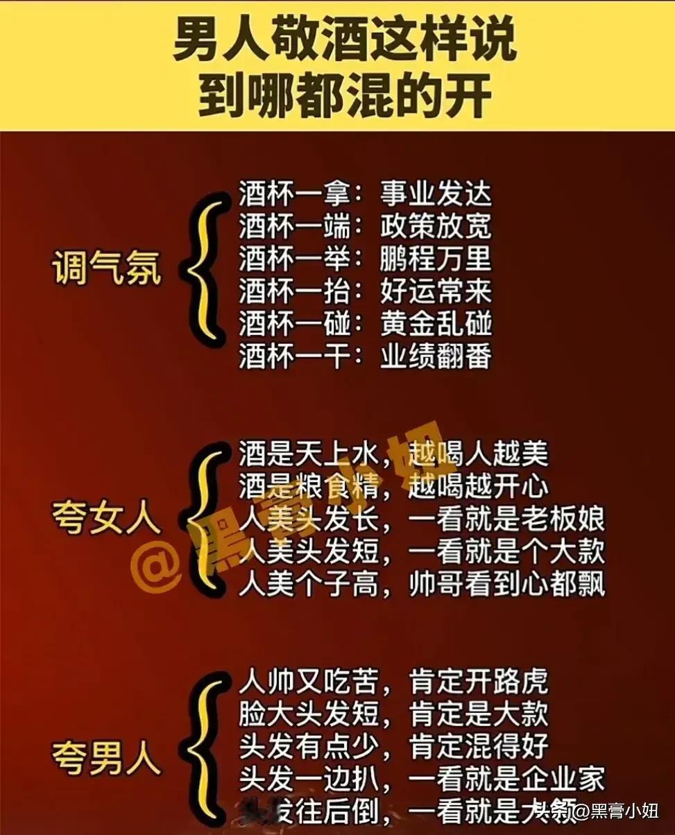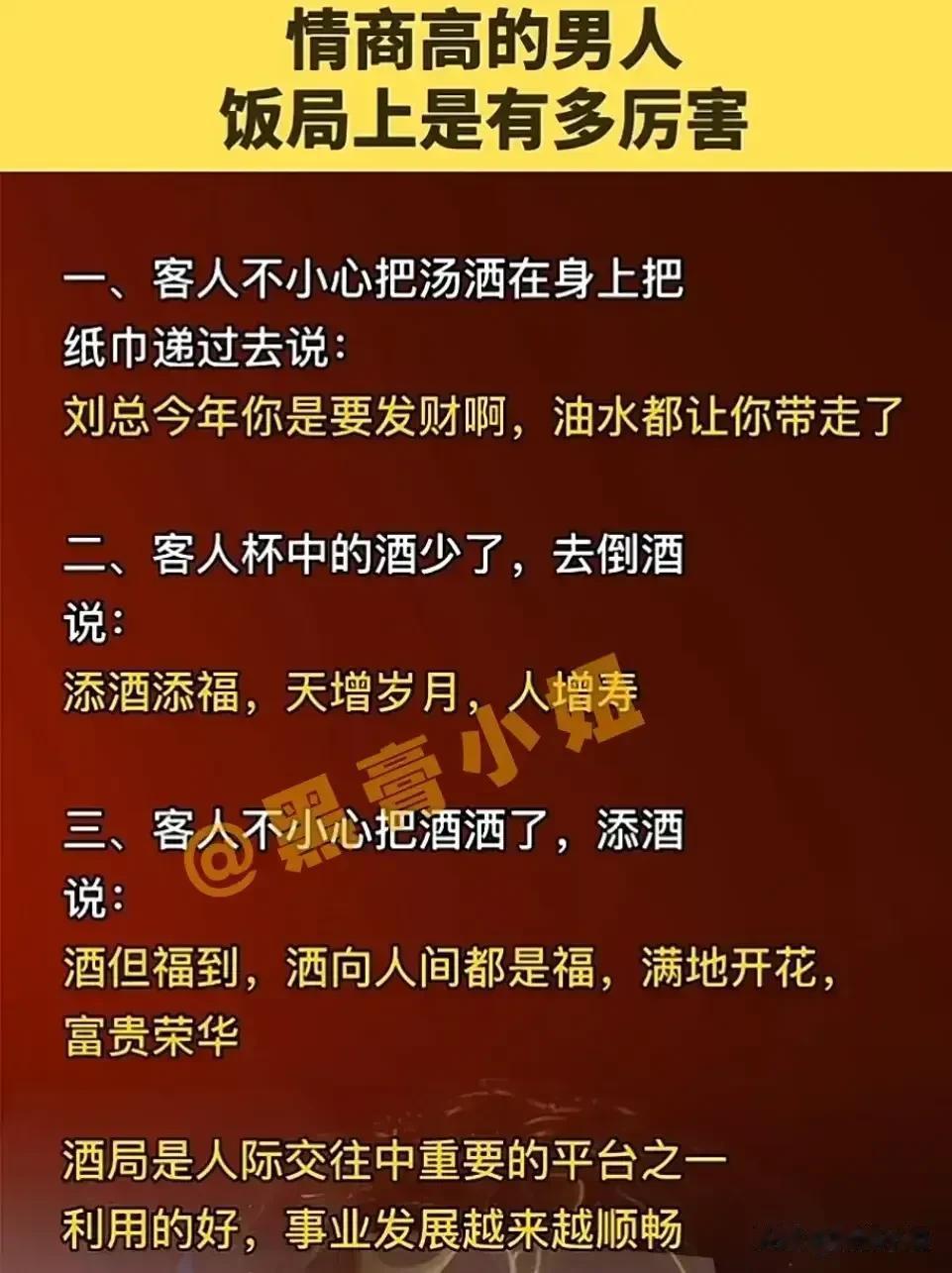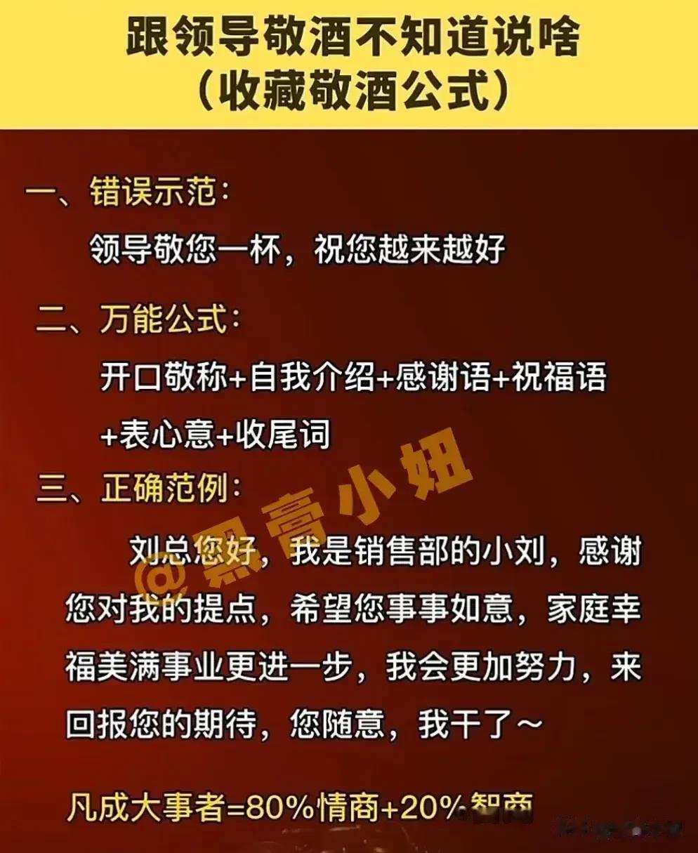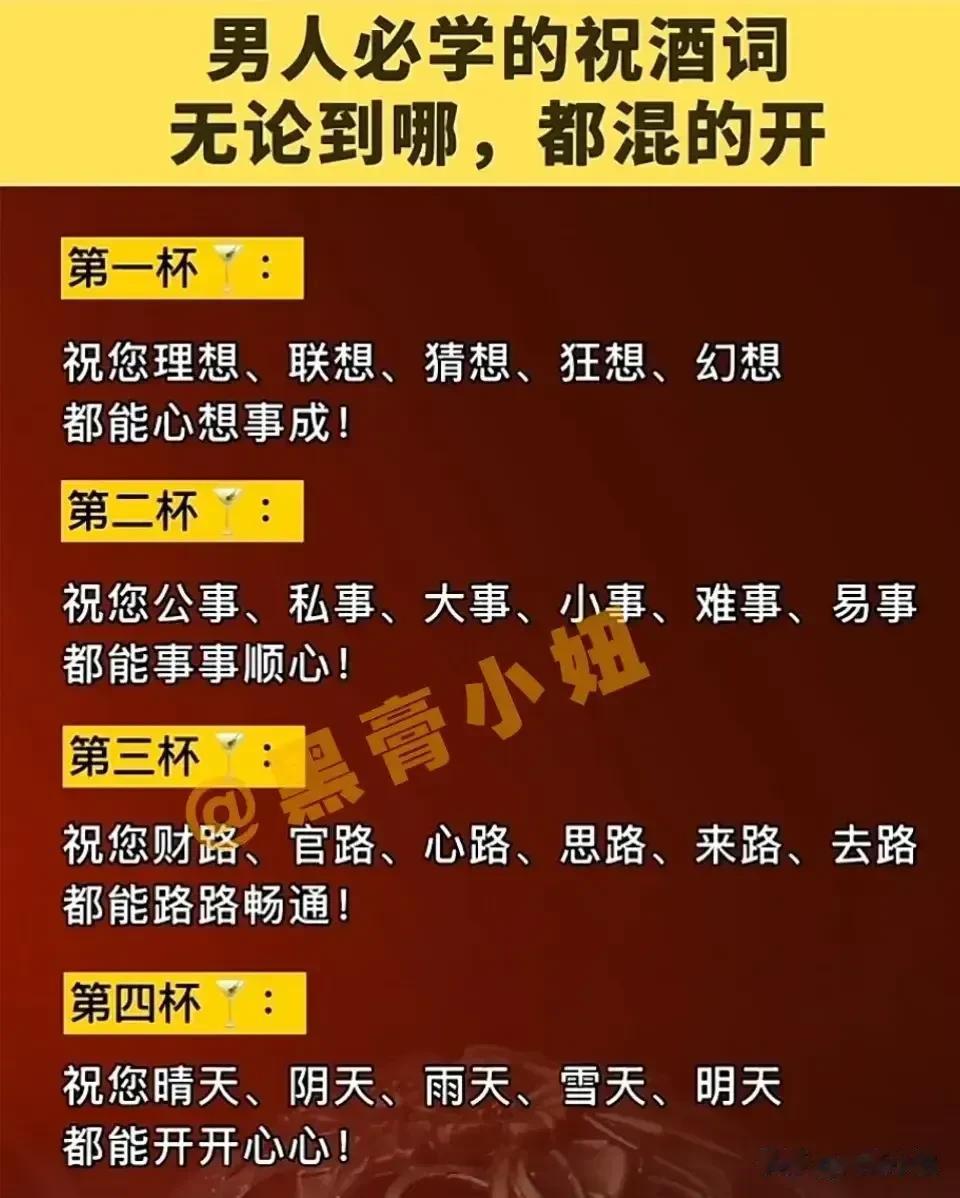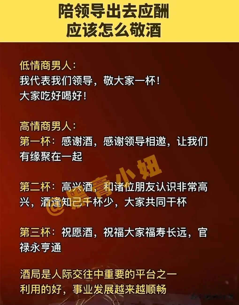 天啦!到今天才知道,在酒局应酬中混得好的人,原来早就对这些应酬规矩和祝酒词倒背如流了,这是我见过整理最全的,不管是敬长辈、敬客户、敬领导,还是挡酒话术,或是调节气氛,办事话术,都在这里了。背下来,轻松应对各种饭局酒局应酬! 中国是一个讲关系、讲人情的社会,你会应酬会说话会做人,自然就顺风顺水!不管是生活还是职场中,应酬都是无法逃避的,只要掌握了这套应酬说话办事技巧,都能让你左右逢源,事半功倍!赶紧学起来! 中国式应酬社交礼仪