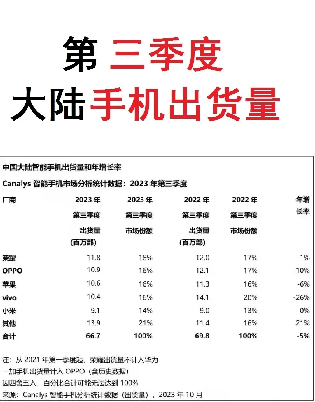 根据第三方调研架构Canalys发布的数据报告显示,第三季度国内手机市场,苹果也只是以1060万销量屈居第三。而荣耀则是以18%的市场占有率排名第一,出货量是1180万。同时OPPO包含一加手机排名第二,出货量是1090万台,此外vivo和小米分别是第四和第五。