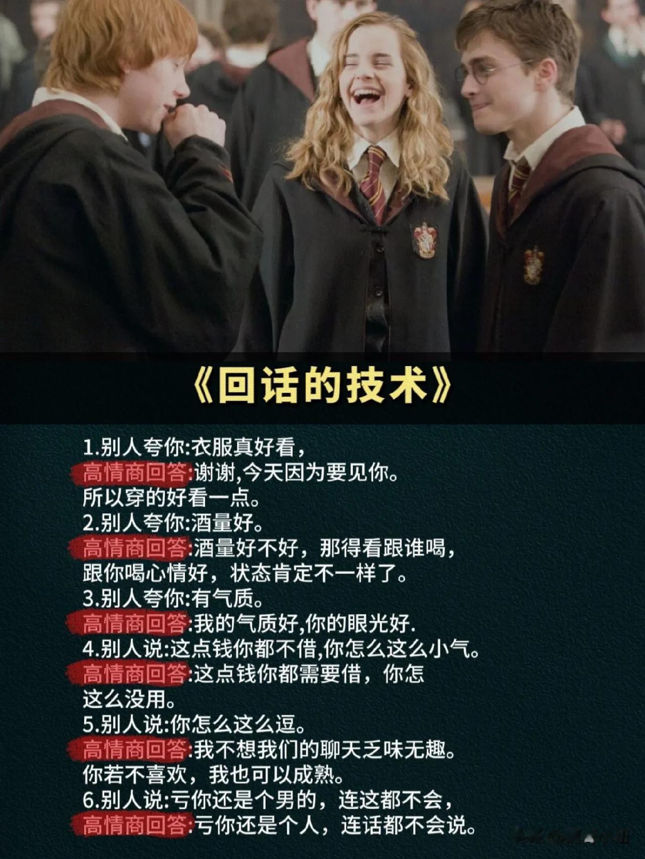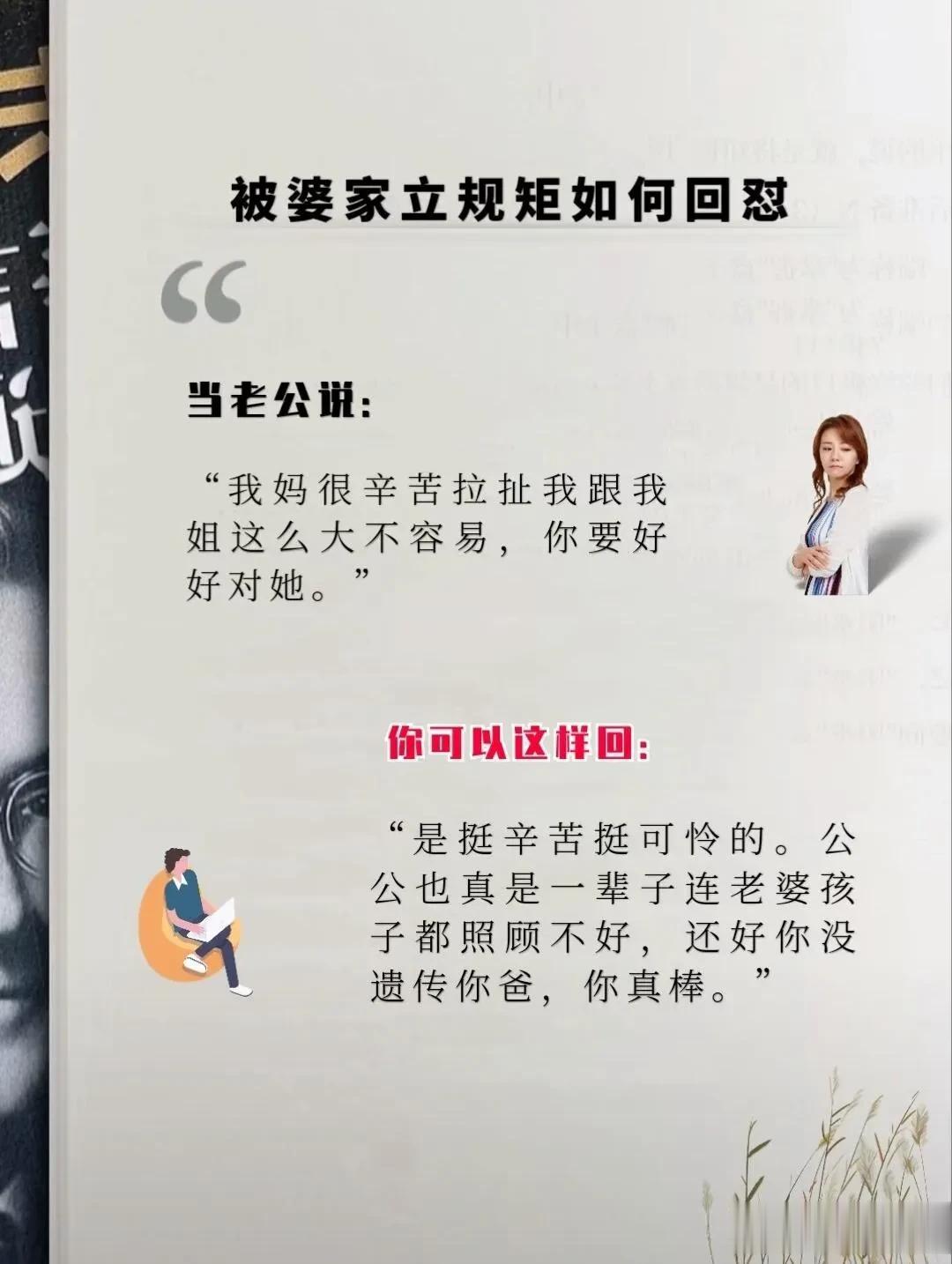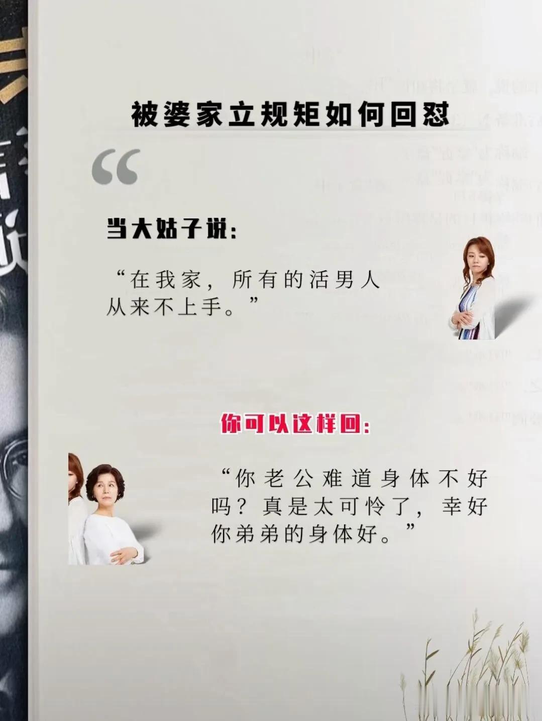 天呐!这才是回话界的天花板,被婆家立规矩,高情商回怼!掌握回话技巧,不管什么场合都不吃亏! 果然会说话是本事,口才决定你一生的成败!不会说话,常常得罪人,比如客户说你们的产品太贵了,低情商的回答:一分价钱一分货,您不能只看价格。 高情商的回答方式是:好东西自然贵,以您的身份,我给您便宜,估计您也看不上。 当老公说: “我妈很辛苦拉扯我跟我姐这么大不容易,你要好好对她。” 你可以这样回: “是挺辛苦挺可怜的。公公也真是一辈子连老婆孩子都照顾不好,还好你没遗传你爸,你真棒。” 当大姑子说:“在我家,所有的活男人从来不上手。” 你可以这样回:“你老公难道身体不好吗?真是太可怜了,幸好你弟弟的身体好。” 当有人骂你:不要脸时,怎么回? 高情商回答:不要了,刚好你没有。 当有人骂你:老男人, 高情商回答:哪像你啊,年轻的跟孙子一样。 …… 得体的回话能让对方满意又高兴,巧妙的回话也能让对方哑口无言。生活工作中如果你也有类似困扰,赶紧学一学回话的技术!狠狠提升情商与口才! 回话的技术沟通智慧