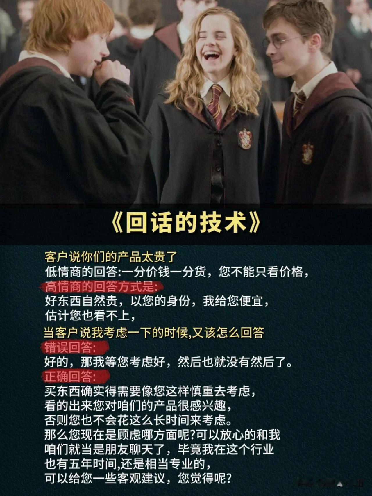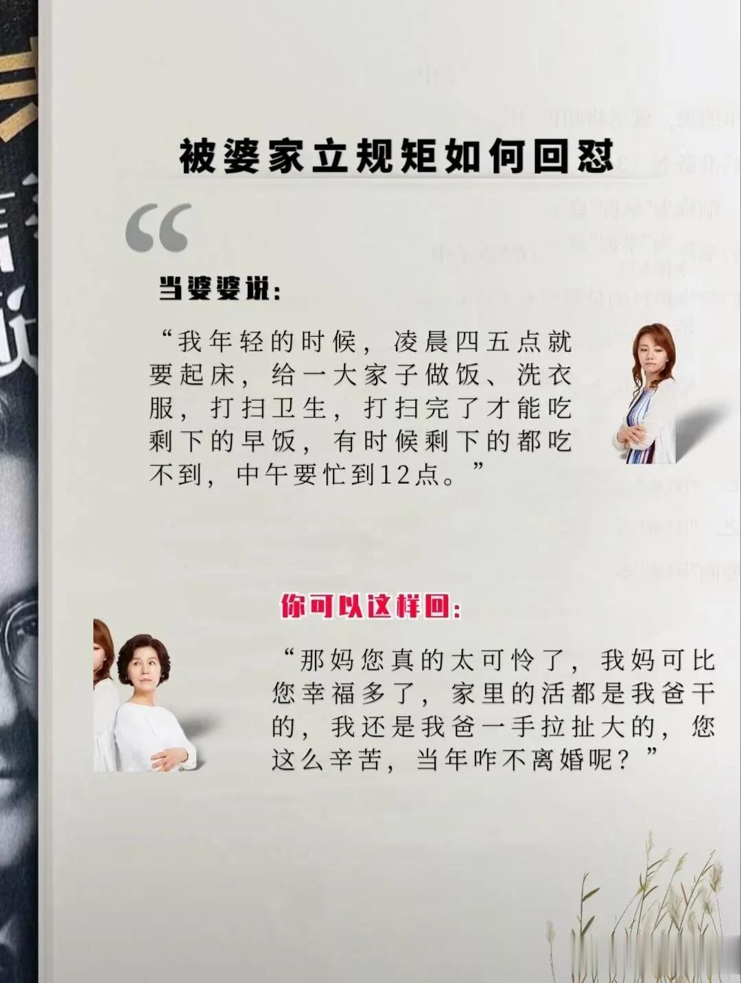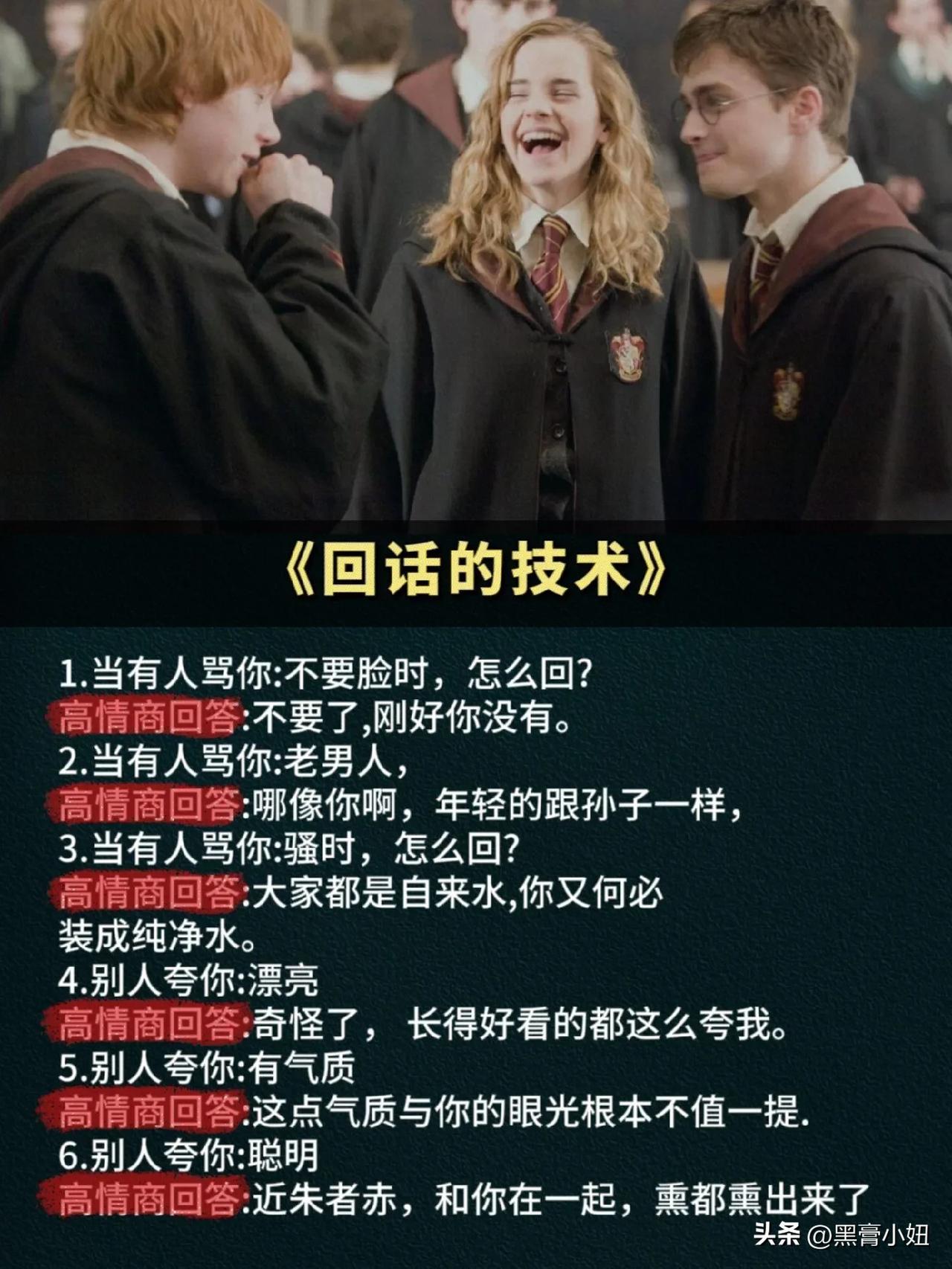 天呐!这才是回话界的天花板,被婆家立规矩,高情商回怼!掌握回话技巧,不管什么场合都不吃亏! 果然会说话是本事,口才决定你一生的成败!不会说话,常常得罪人,比如客户说你们的产品太贵了,低情商的回答:一分价钱一分货,您不能只看价格。 高情商的回答方式是:好东西自然贵,以您的身份,我给您便宜,估计您也看不上。 当老公说: “我妈很辛苦拉扯我跟我姐这么大不容易,你要好好对她。” 你可以这样回: “是挺辛苦挺可怜的。公公也真是一辈子连老婆孩子都照顾不好,还好你没遗传你爸,你真棒。” 当大姑子说:“在我家,所有的活男人从来不上手。” 你可以这样回:“你老公难道身体不好吗?真是太可怜了,幸好你弟弟的身体好。” 当有人骂你:不要脸时,怎么回? 高情商回答:不要了,刚好你没有。 当有人骂你:老男人, 高情商回答:哪像你啊,年轻的跟孙子一样。 …… 得体的回话能让对方满意又高兴,巧妙的回话也能让对方哑口无言。生活工作中如果你也有类似困扰,赶紧学一学回话的技术!狠狠提升情商与口才! 回话的技术沟通智慧
