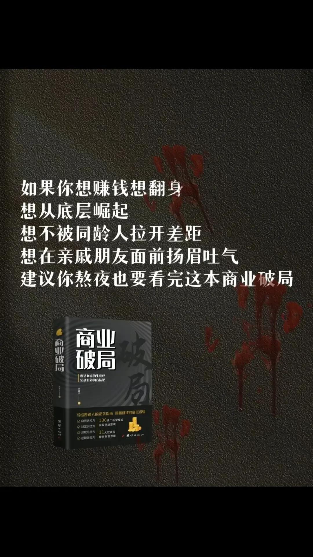 天呐!真的万万没想到,搞钱还有万能公式!一位身价过亿的商人直言:赚钱的方式有一万种,你却只知道打工,一切不触及底层改变的努力都是徒劳!认真看完这些搞钱的方式方法,成就不一样的自己,让你的财富稳步增值! 现在做生意赚差价的时代已经结束,未来赚的是现金流,玩的是模式。想要迅速提升自己,一定要读这本《商业破局》。因为真正的高手,都有破局思维,在搞钱路上助你如鱼得水!下方链接走起! 商业破局普通人逆袭