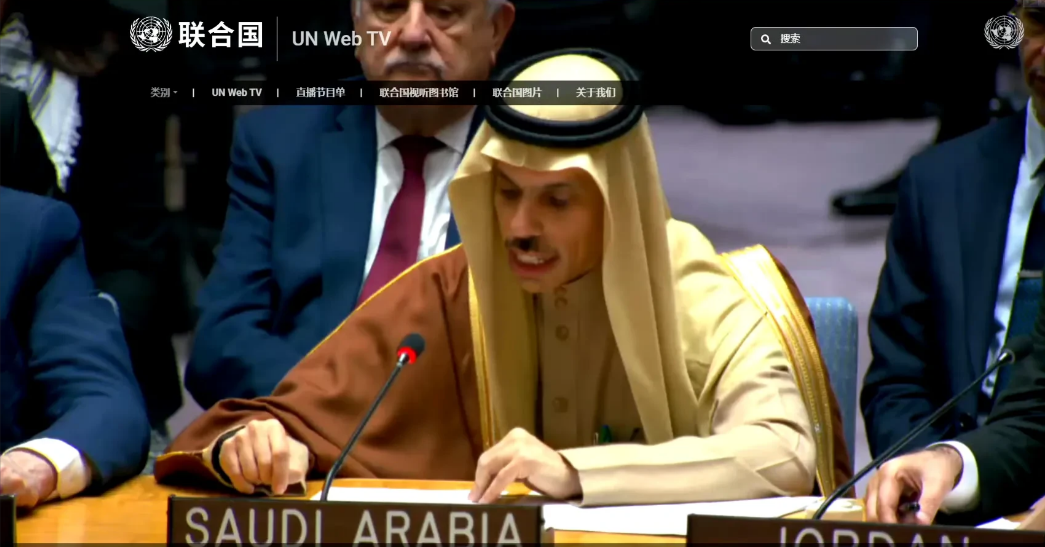 在轮到沙特阿拉伯外交大臣费萨尔·本·法尔汉·阿勒沙特(见图8)发言时,他主要讲的是“两国方案”。
