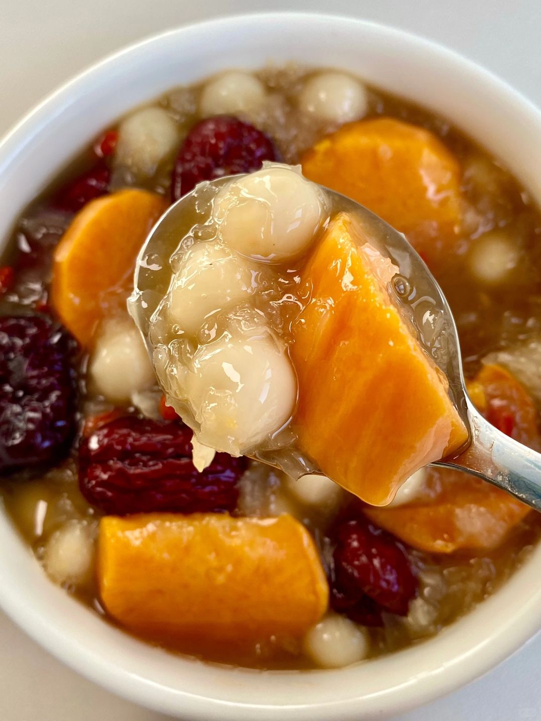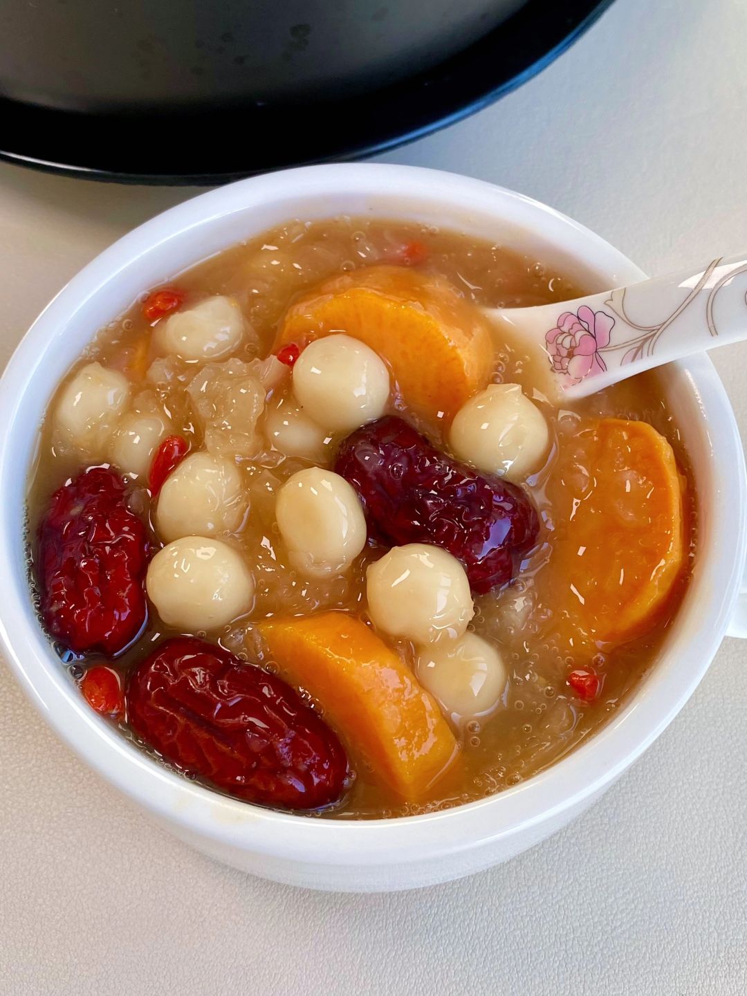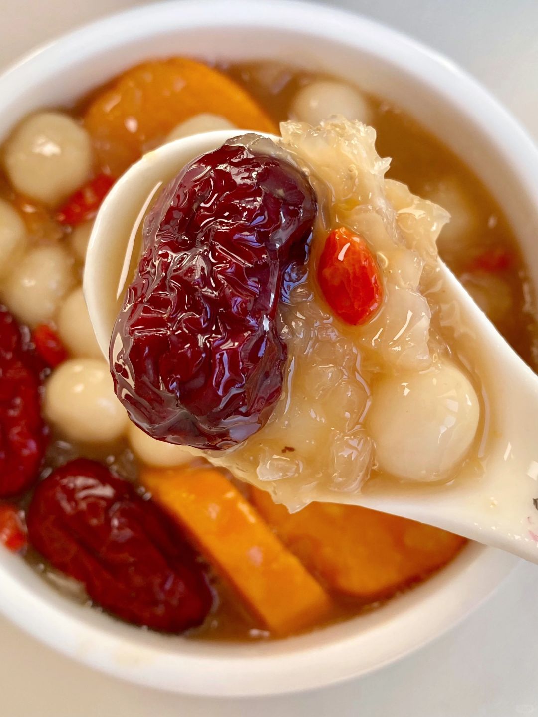 🥣做法:小圆子煮熟过冷水备用,红枣和银耳兑水煮15分钟,倒入红薯煮熟,加入小圆子、红糖和枸杞,搅拌均匀即可!