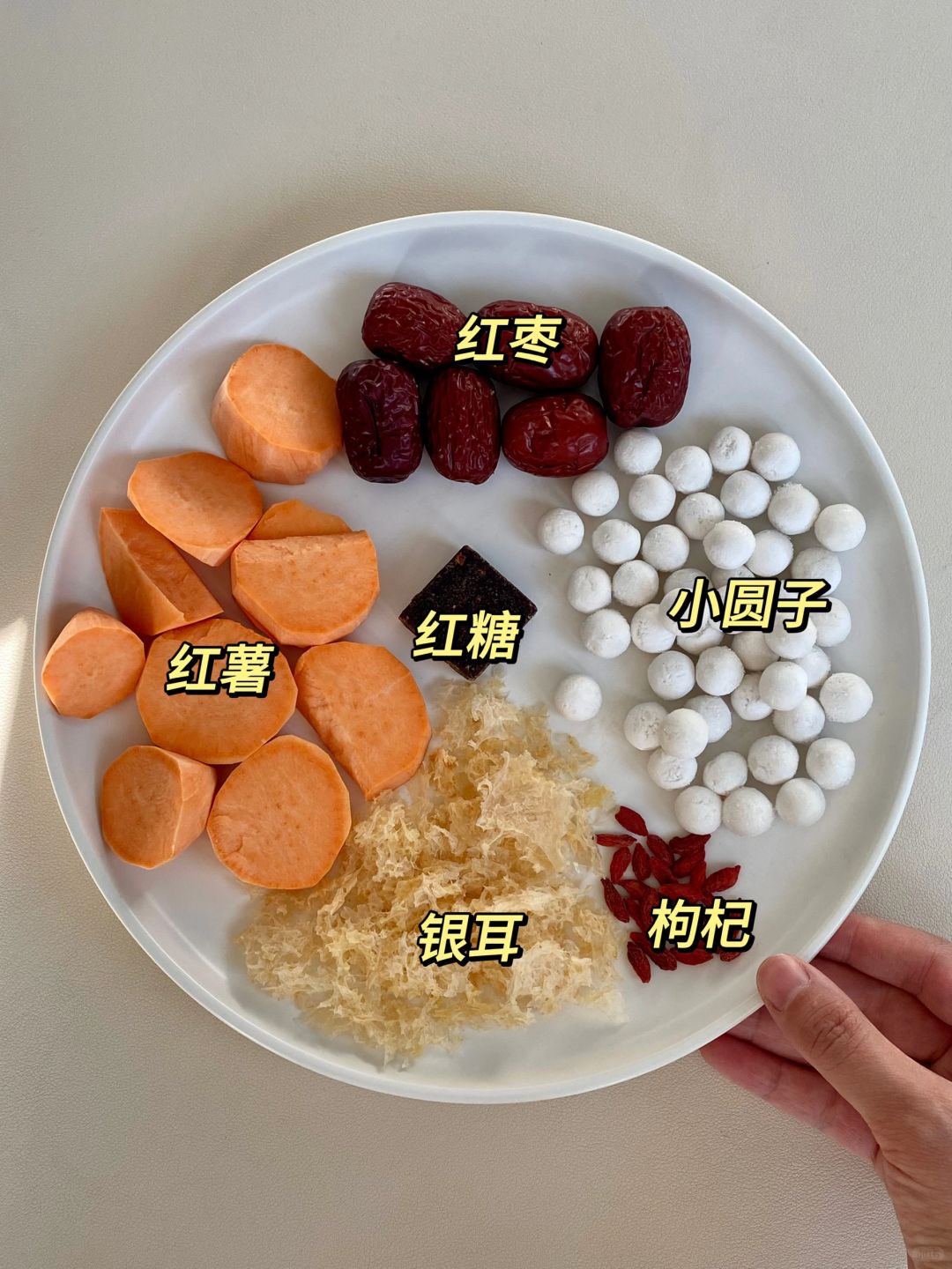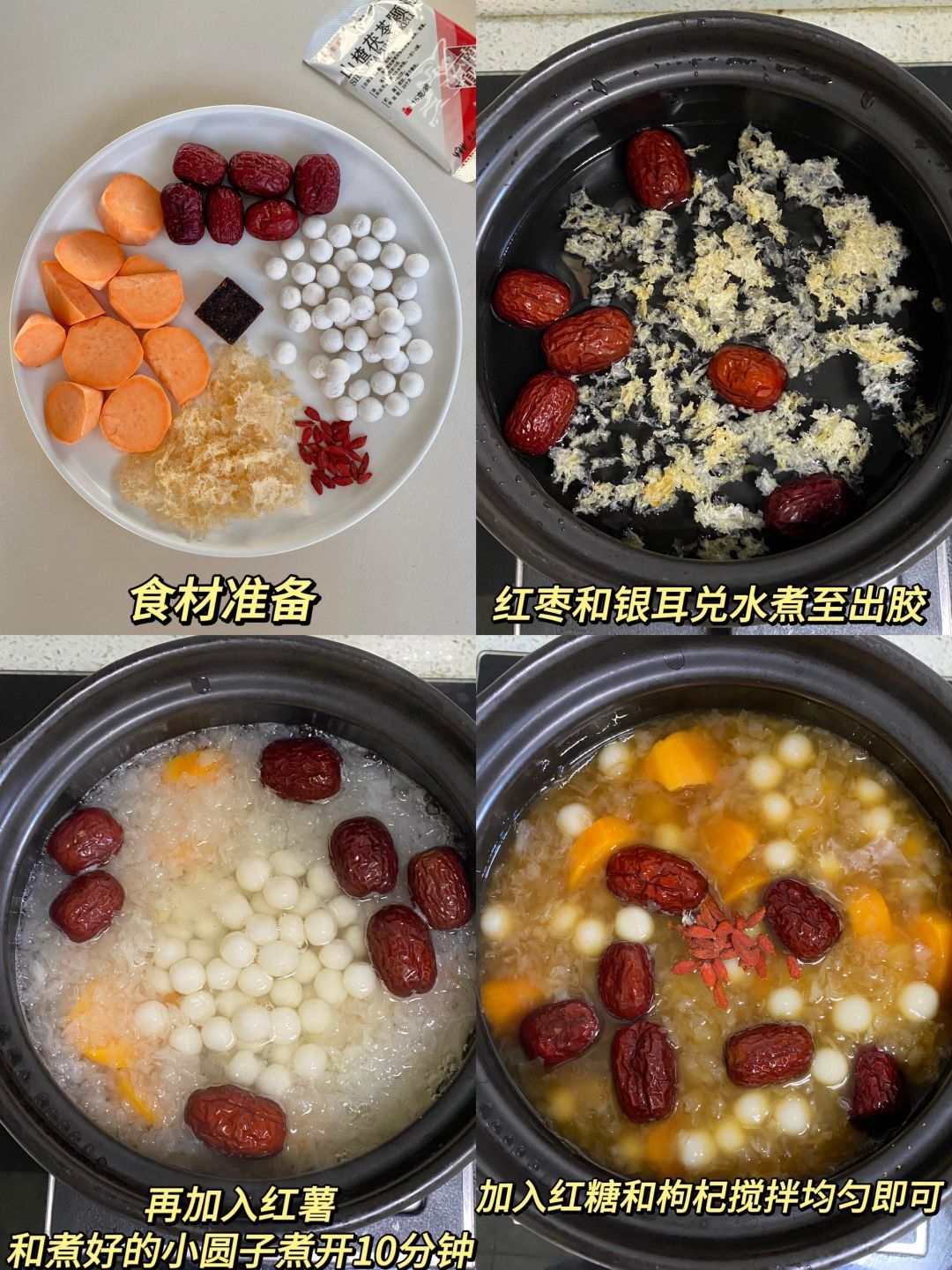 📝食材:红薯、银耳、小圆子、红枣、枸杞、红糖
