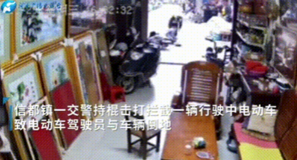 可该交警看到远处有一辆电动车的驾驶员未佩戴头盔后,立即拿出并伸出警用甩棍,用力打在驾驶员的身上,导致驾驶员连人带重重摔倒在地上。