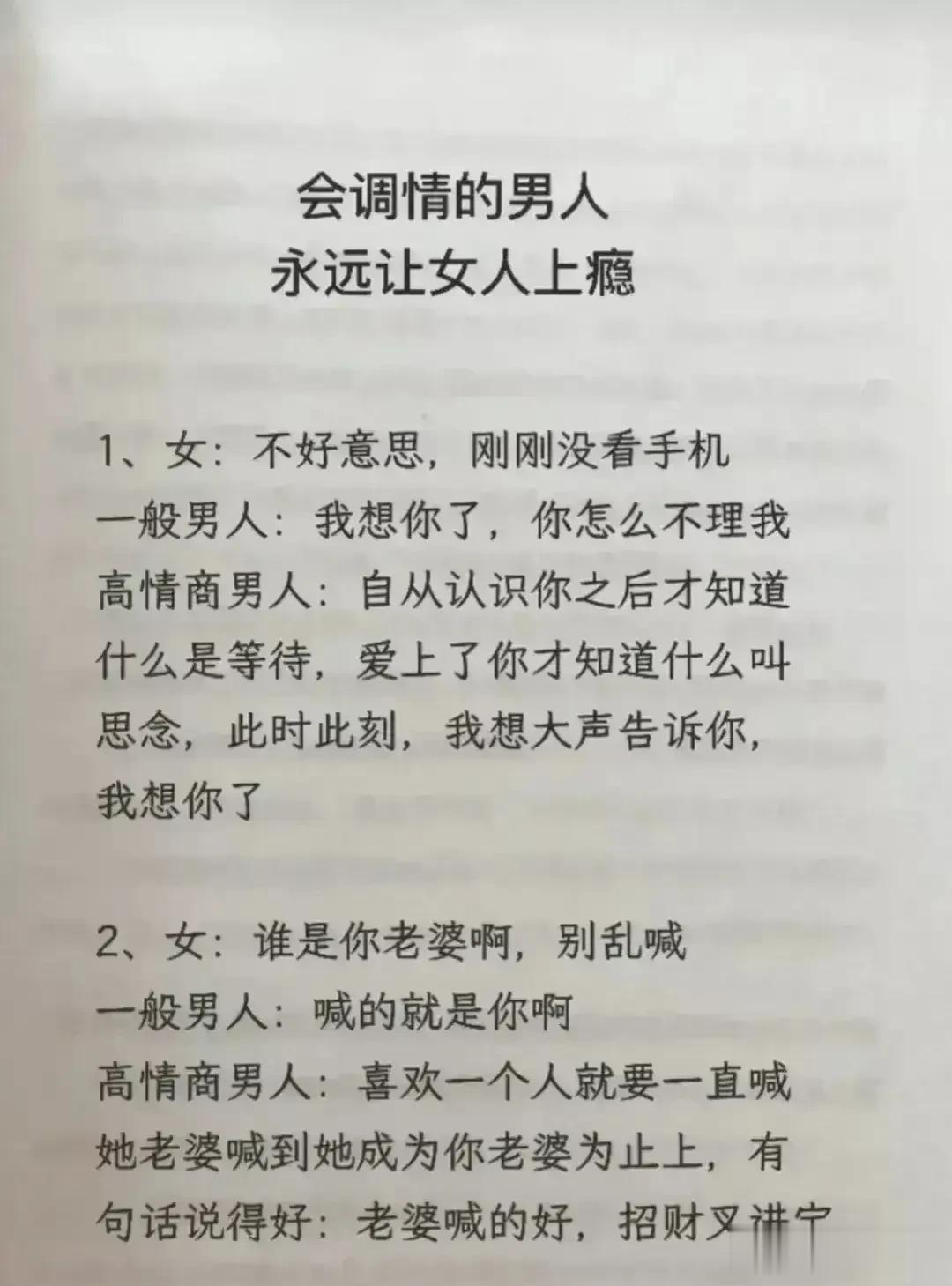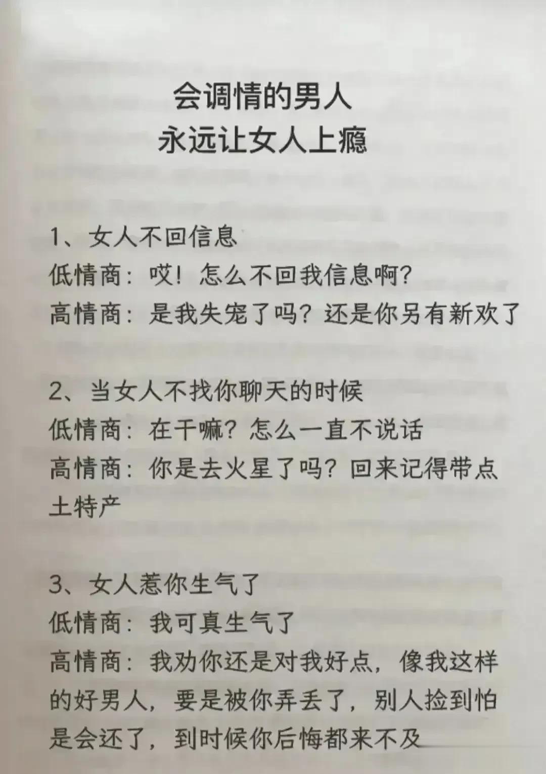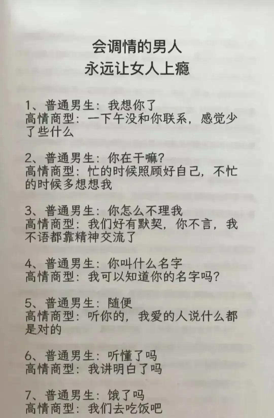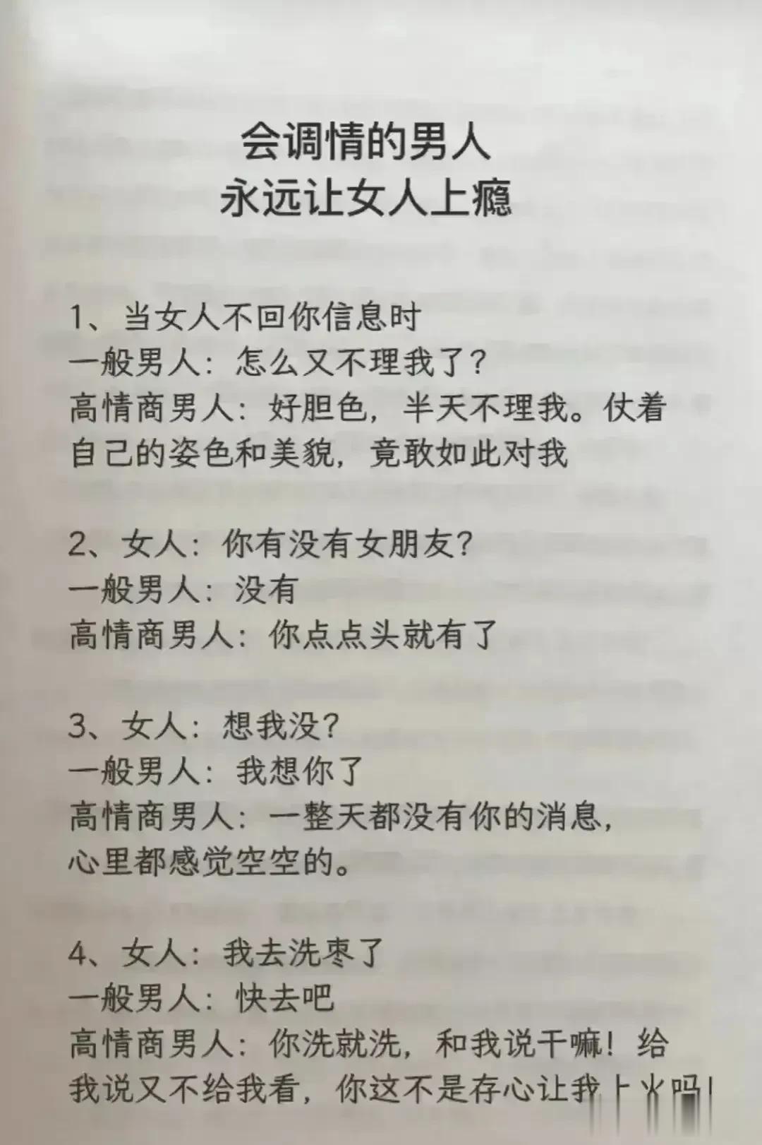 天呐!会调情的男人,永远让女人上瘾,想要提升自己的魅力,就要学会幽默聊天技巧!每天看一遍,让你的情商突飞猛进,一开口就让对方喜欢你,生活事事如意,职场步步高升!赶紧保存下来!提升自己的幽默口才和接话技巧,你将受益终身! 不管和谁打交道,幽默又会接话的人,能让人越聊越开心,轻松聊出感情聊出机遇,让你朋友越来越多,混得越来越好! 幽默口才好好接话