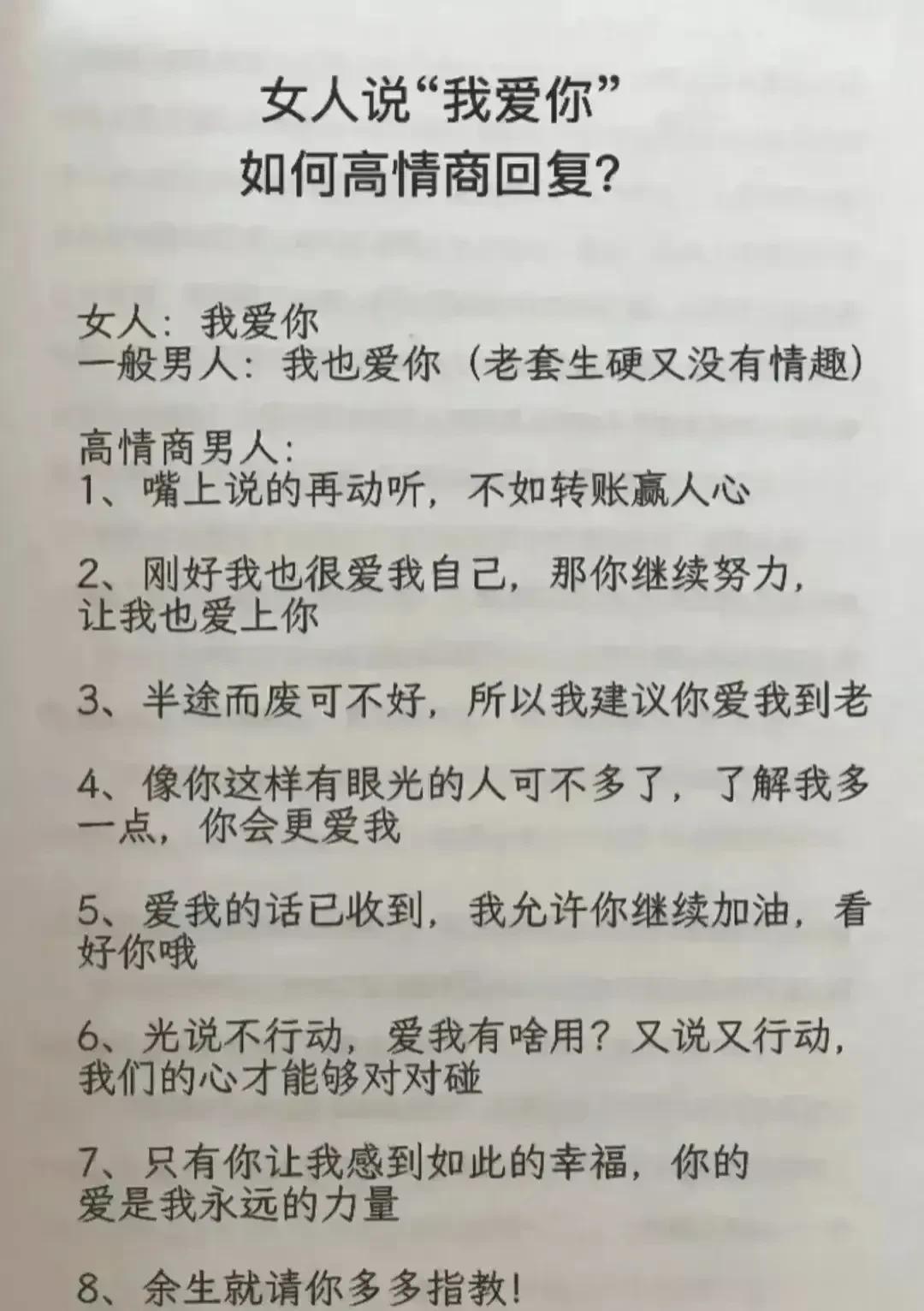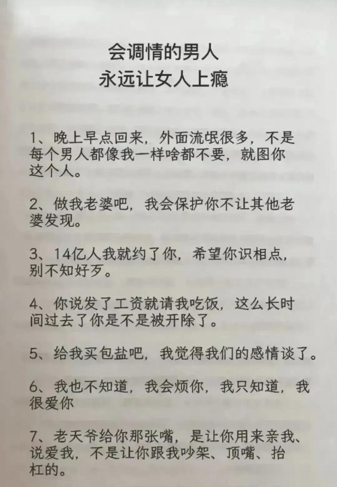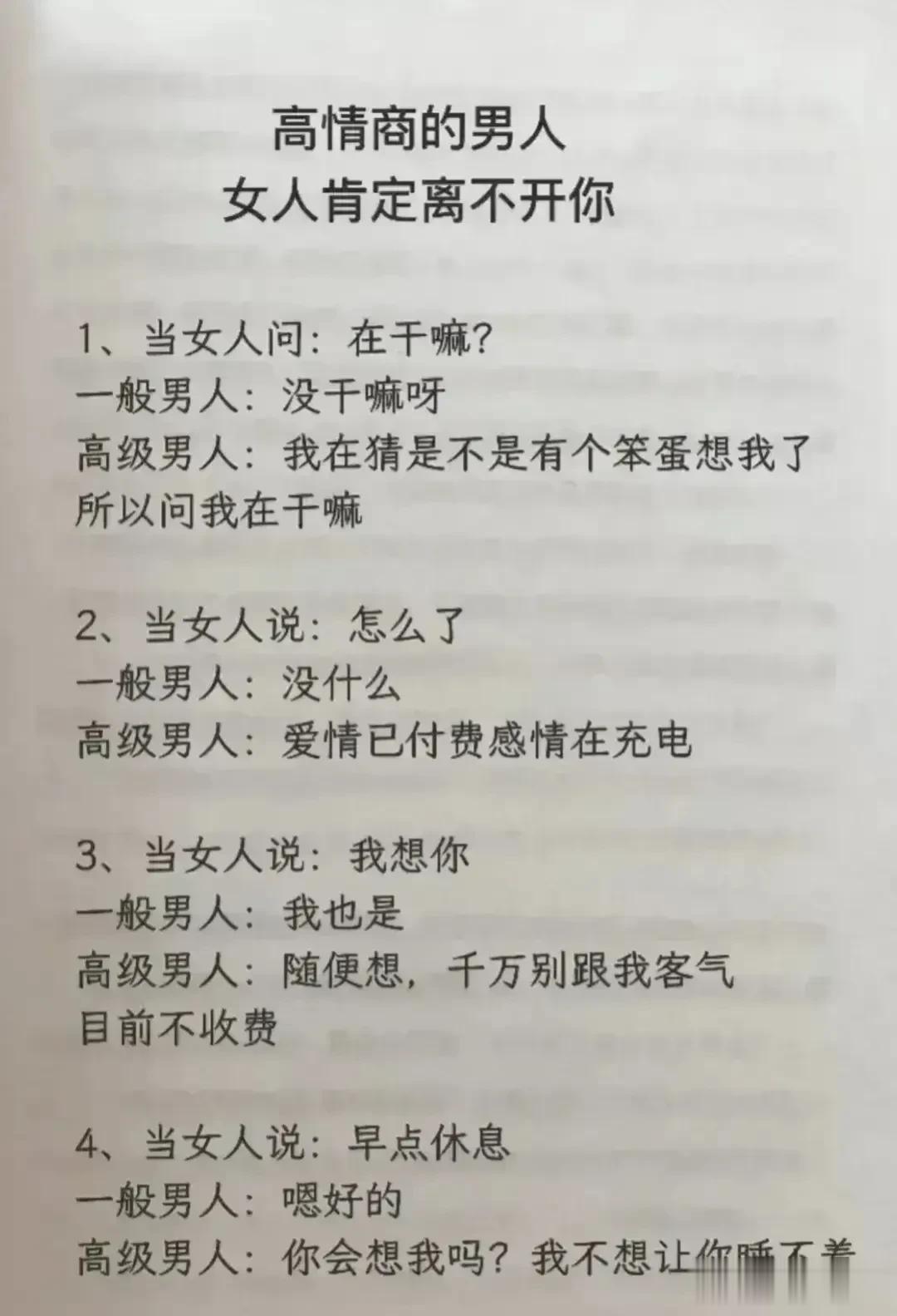 天呐!会调情的男人,永远让女人上瘾,想要提升自己的魅力,就要学会幽默聊天技巧!每天看一遍,让你的情商突飞猛进,一开口就让对方喜欢你,生活事事如意,职场步步高升!赶紧保存下来!提升自己的幽默口才和接话技巧,你将受益终身! 不管和谁打交道,幽默又会接话的人,能让人越聊越开心,轻松聊出感情聊出机遇,让你朋友越来越多,混得越来越好! 幽默口才好好接话