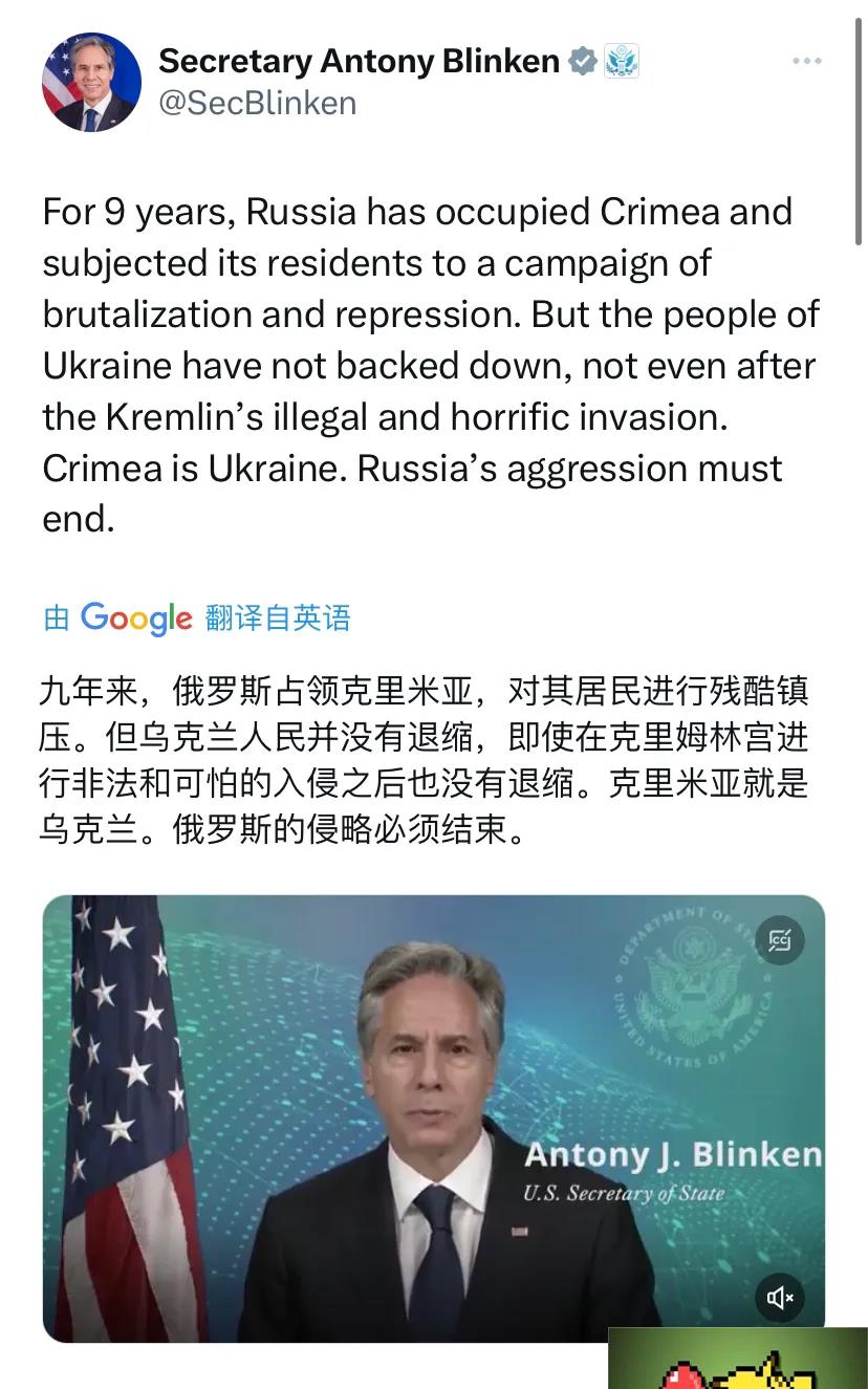 布林肯的话还透露出一个信息:在全球范围内,仅有十多个国家支持乌克兰在克里米亚问题上的立场。