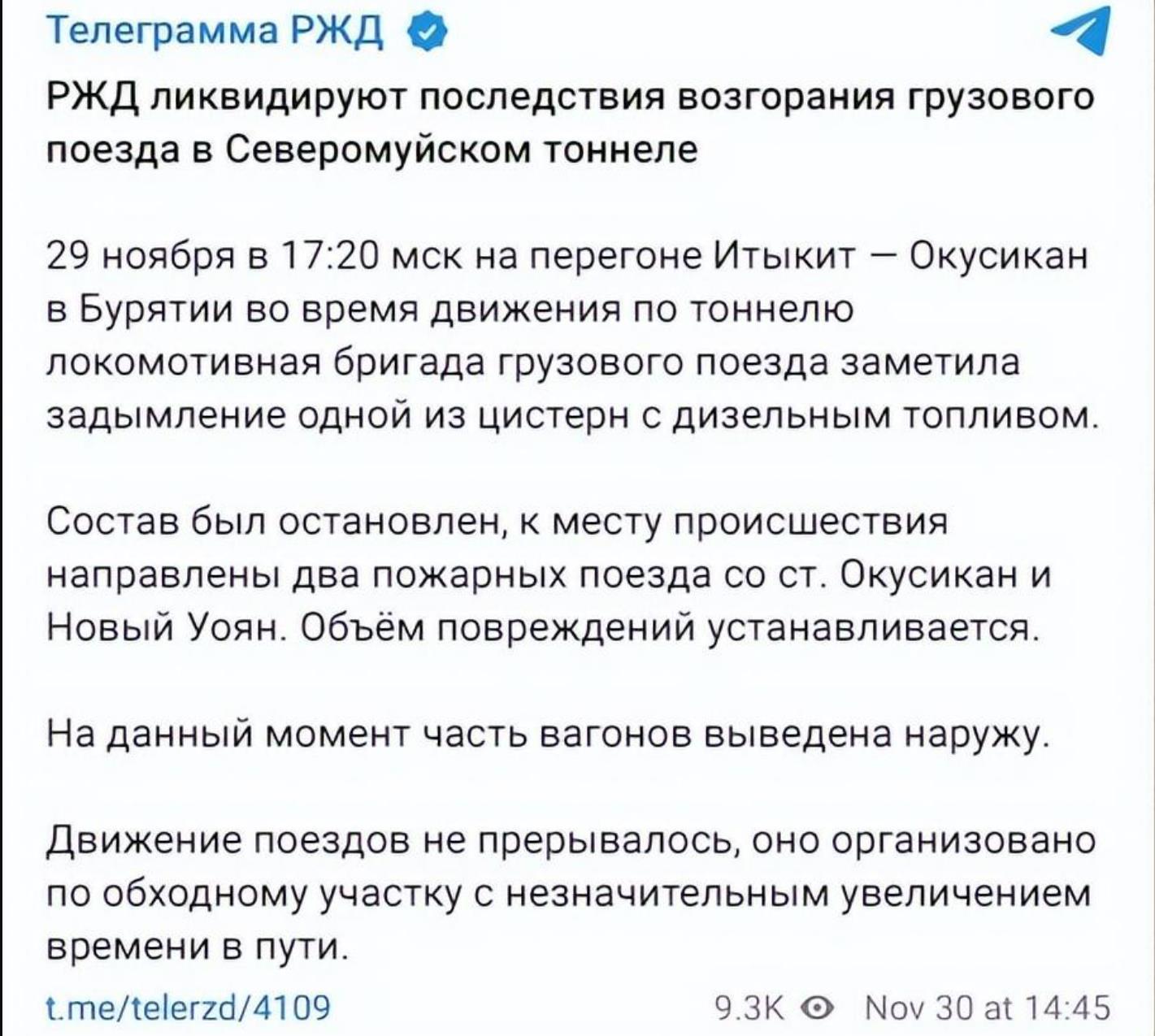 根据乌克兰方面的叙述,在11月30日的夜间,俄罗斯布里亚特共和国境内的贝阿铁路(贝加尔-阿穆尔)的战略要地——北莫伊斯基隧道发生了大爆炸,乌克兰情报局的特工对一列行驶中的货运列车实施了爆炸,导致这条重要的战略隧道被破坏。