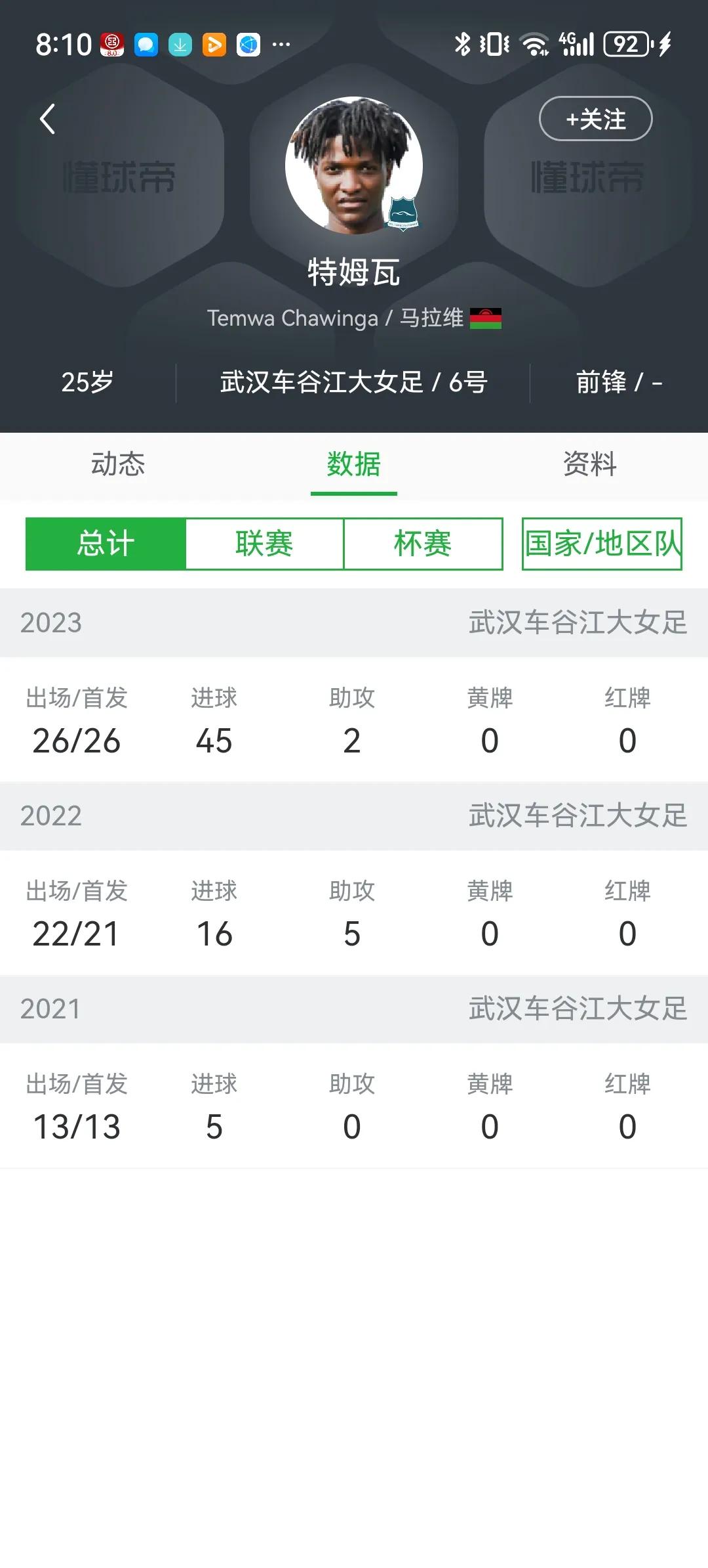 武汉女足外援特姆瓦这赛季进球数据非常炸裂,20场中女超打进30球,6场足协杯打进15球,加起来26球45球!要知道中女超射手榜第二名才只有16球,几乎只有她的一半!第3名更只有8球。截至目前,这名马拉维的超级外援射手还没有为马拉维回家效力过,已来中国三年的她所以再过两年就具备归化的资格了!不知道中国女足是否考虑归化她呢?目前中国女足也非常缺射手!