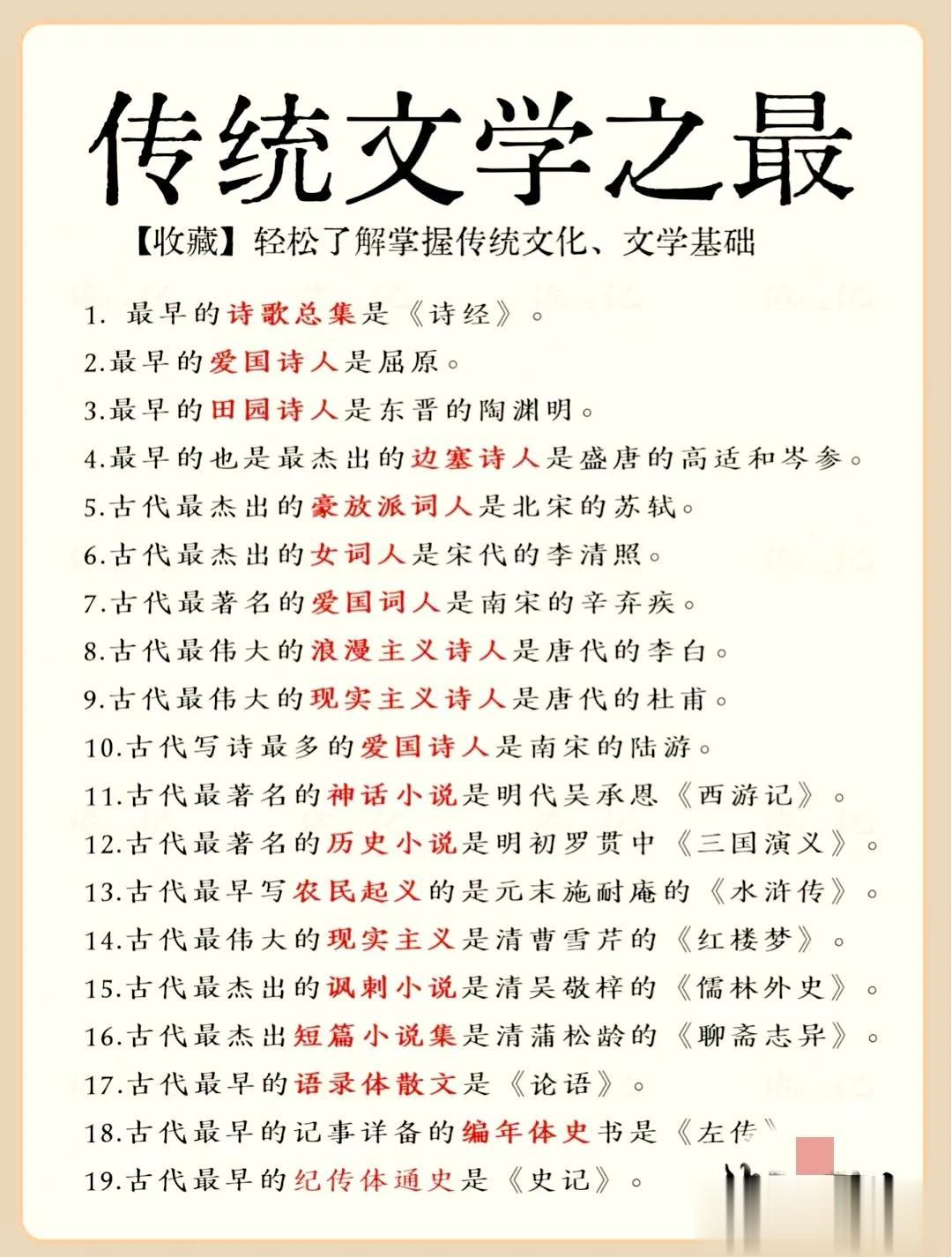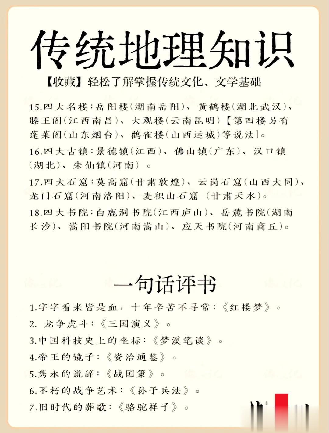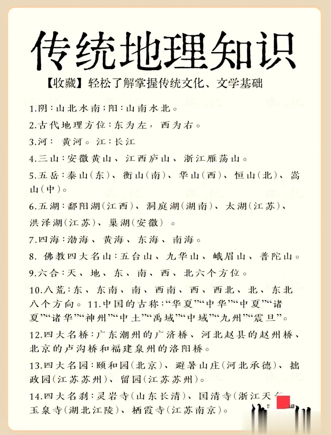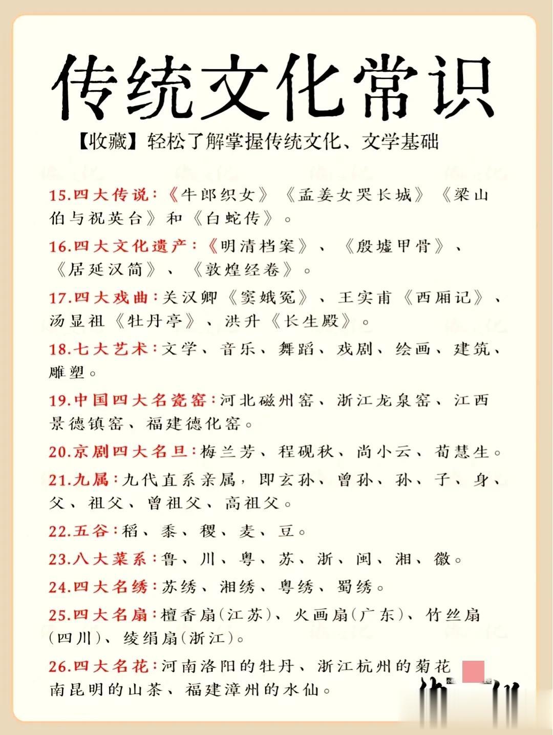 一站式掌握传统文化知识!这是我见过整理最全的,这些文化常识蕴藏着浓厚的文化底蕴,是老祖宗的智慧结晶。什么五行、岁寒三友、花中四君子、文人四友、文房四宝、12个月的雅称等,都是中小学生常考的文化常识,不管是学生考试还是公务员考试都是必考的一个知识点,尽早让孩子背熟,不但积累了知识,还可以提高成绩。 必背文学文化常识速记