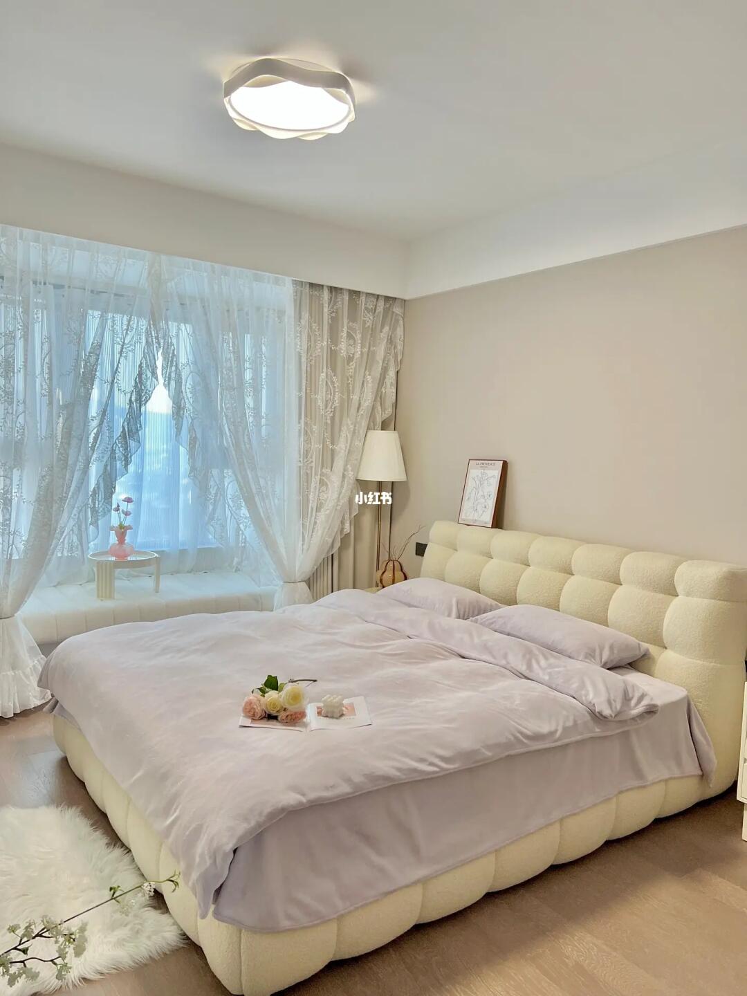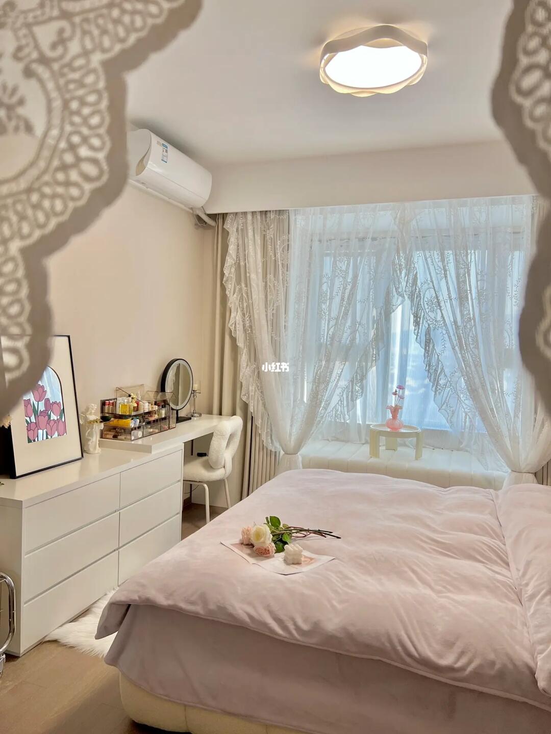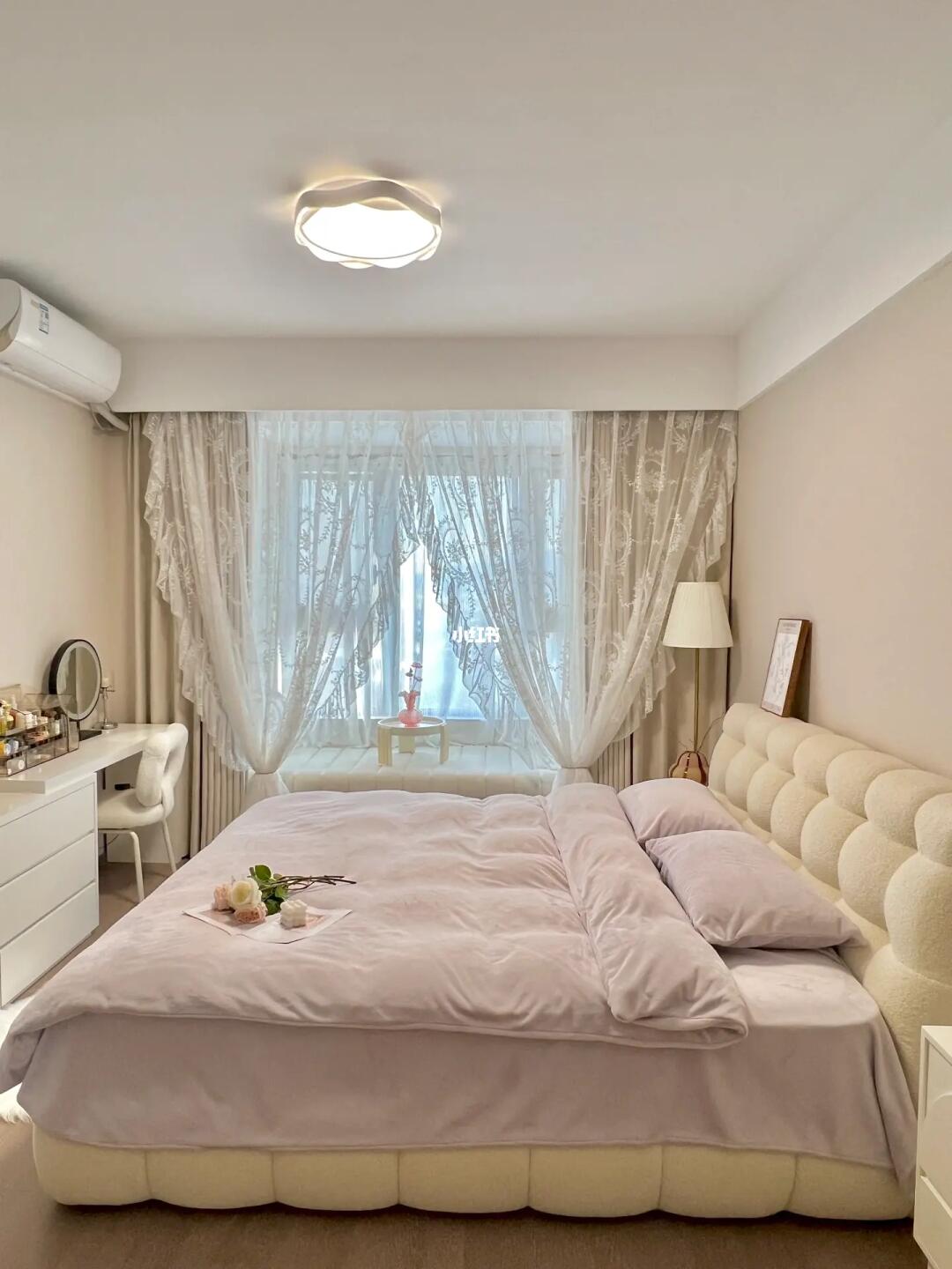 欢迎参观我的13平奶油卧室🌷 入冬之后更想宅家躺平啦~ 清晨阳光洒满飘窗垫☀️ 在温暖的被窝里睡到自然醒 就是冬日的小确幸🍾️ · 趁着天气正好☁️ 给软软的棉花糖床 换上柔软舒适的四件套 梳妆台上安排了配套的收纳盒 配上花边吸顶灯和蕾丝纱帘 奶呼呼的温柔又浪漫💕 · 其实,卧室不需要多复杂的装饰 阳光就是最好的风景🌅