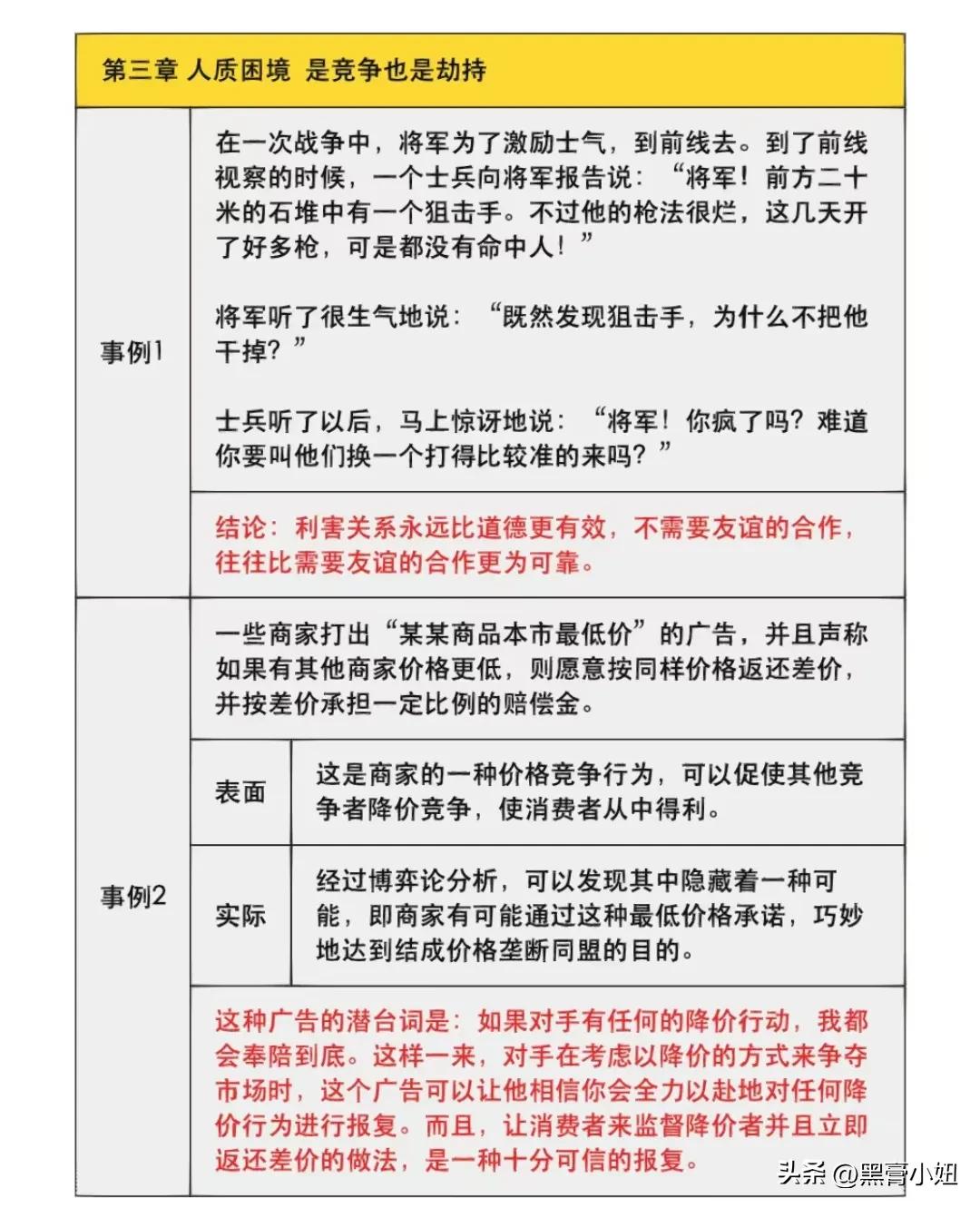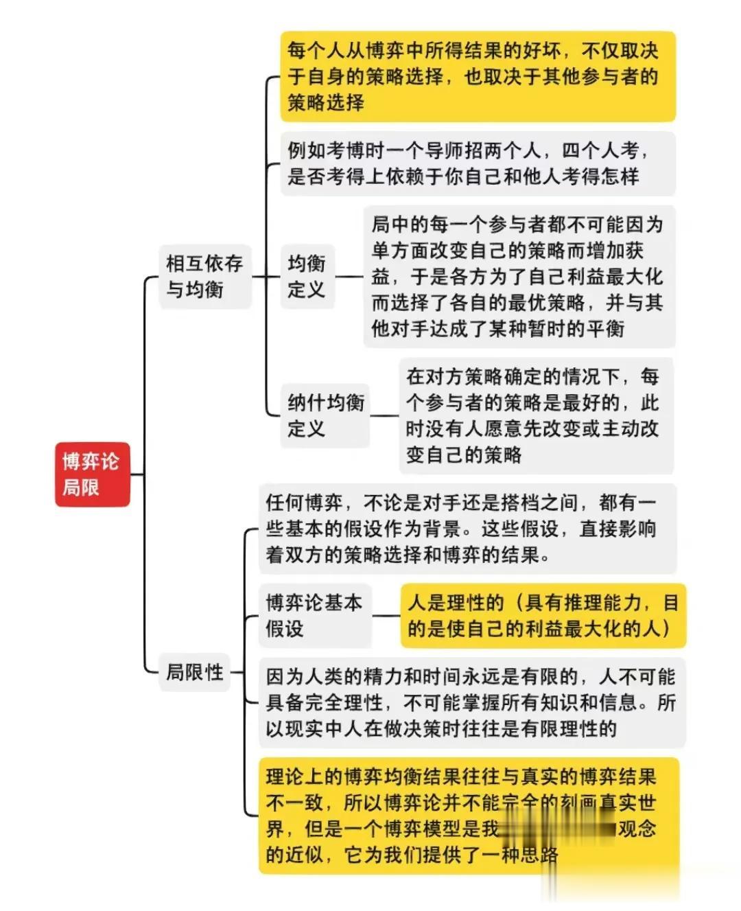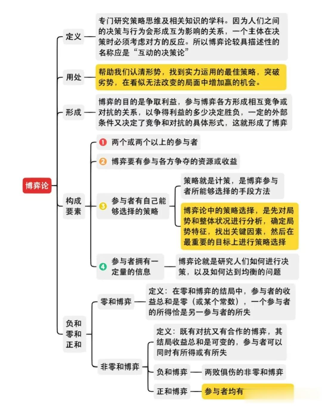 天呐!真没想到,博弈论这么有用!难怪那些混得好的每天都在研究,博弈能帮助我们认清形势,找到实力运用的最佳策略,突破劣势,在看似无法改变的局面中增加赢的机会。 这是看过多遍《博弈论的诡计》的大咖总结出来的思维导图,告诉你人生是一场永不停息的博弈,教你如何在这个充满竞争与合作的世界中,用策略和智慧去赢得胜利。 博弈论心理学的诡计
