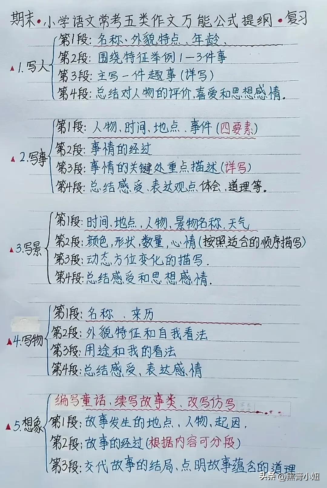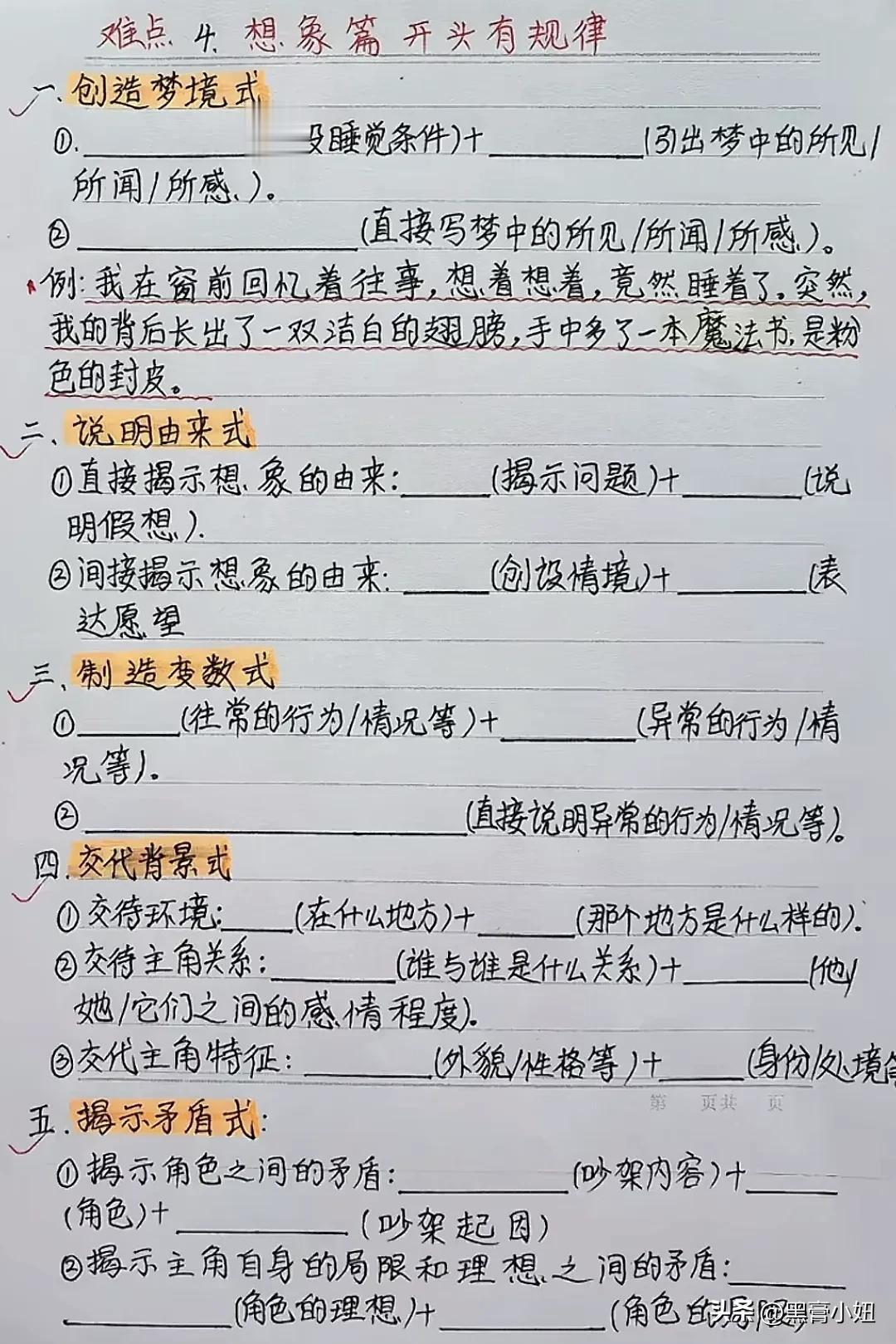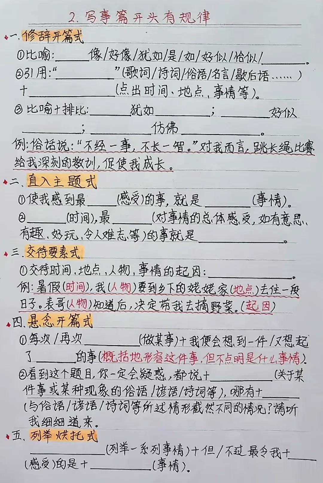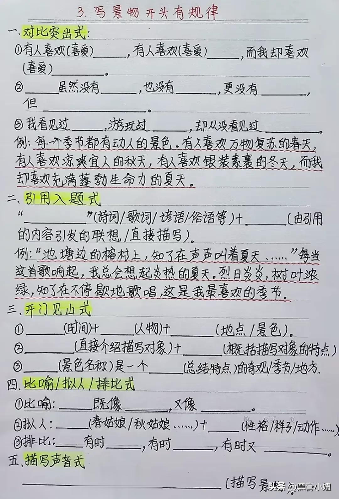 天呐!这位班主任老师太无私了!竟然将小学语文习作常见的5种作文方法以及五类作文万能公式全都手写整理出来了,什么写人、写事、写景物等开头规律和公式,还有一套仿写公式和技巧训练,简直太适合小学生写作水平的提升!赶紧收藏!没事让孩子看一看,练一练,打牢写作能力!为初高中打下坚实的基础! 作文仿写训练写作提升