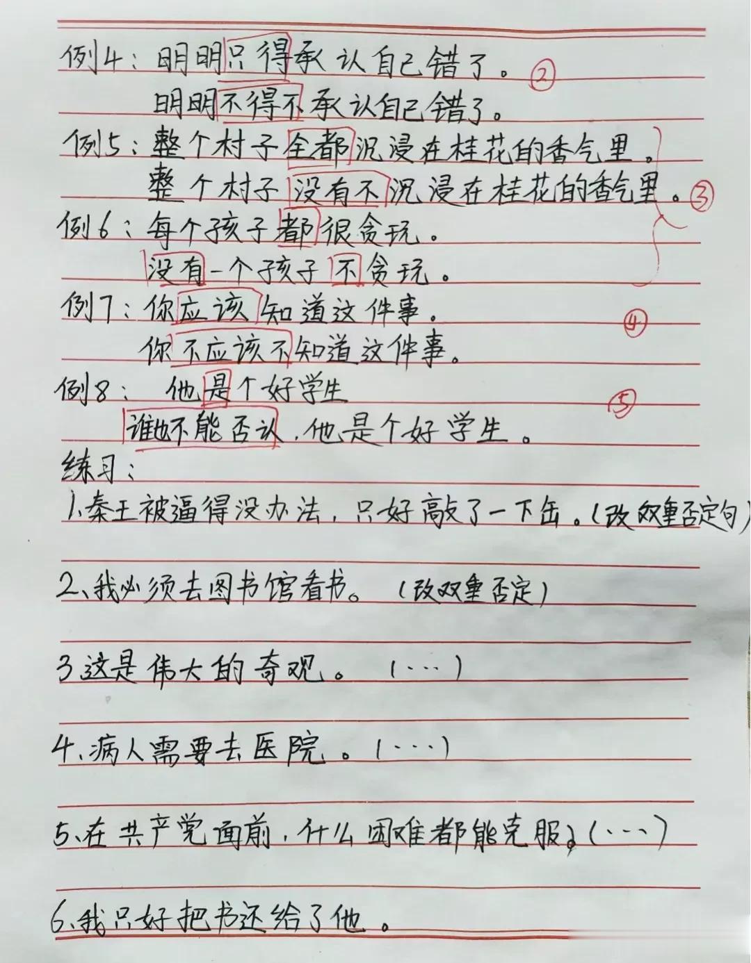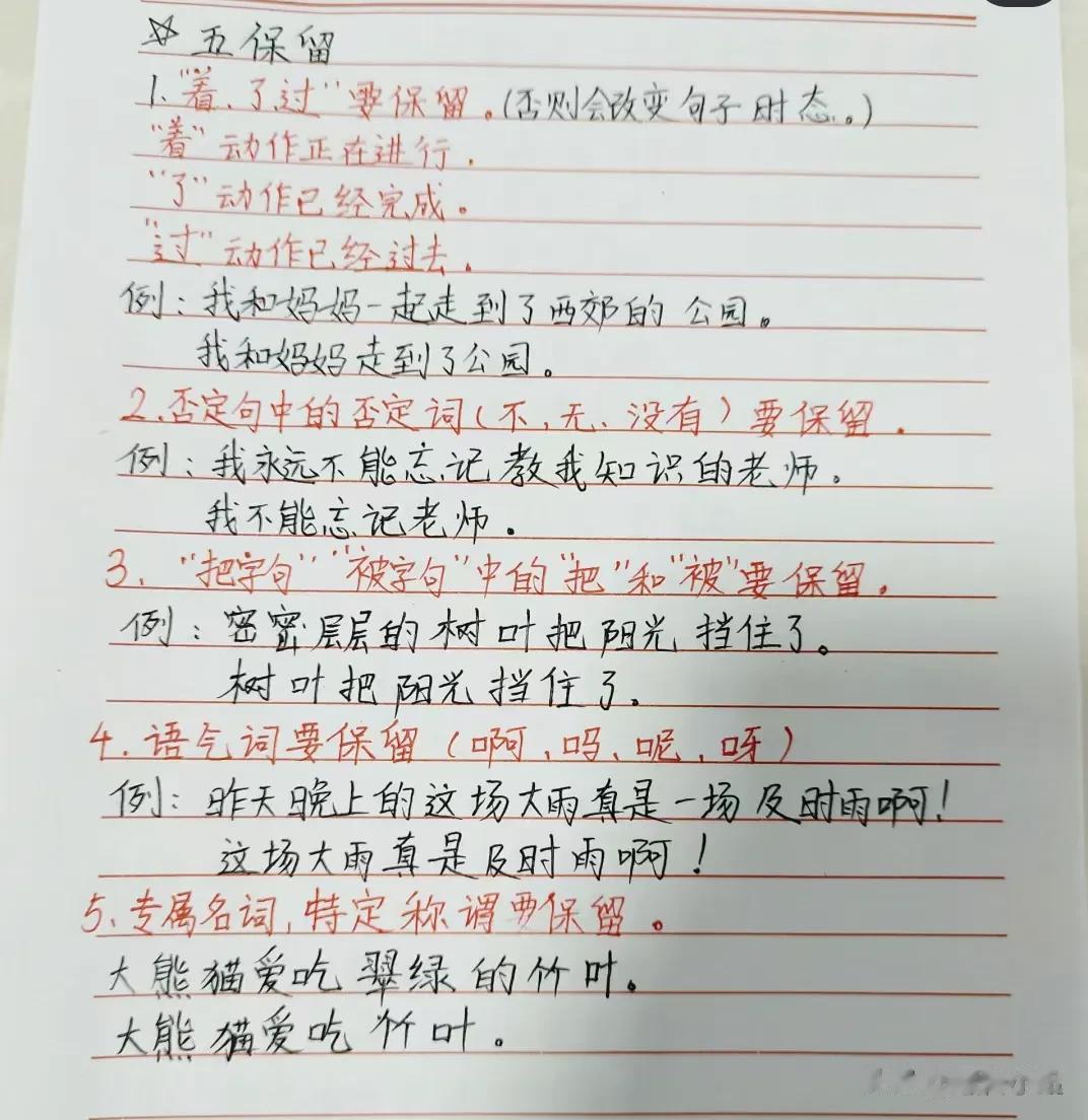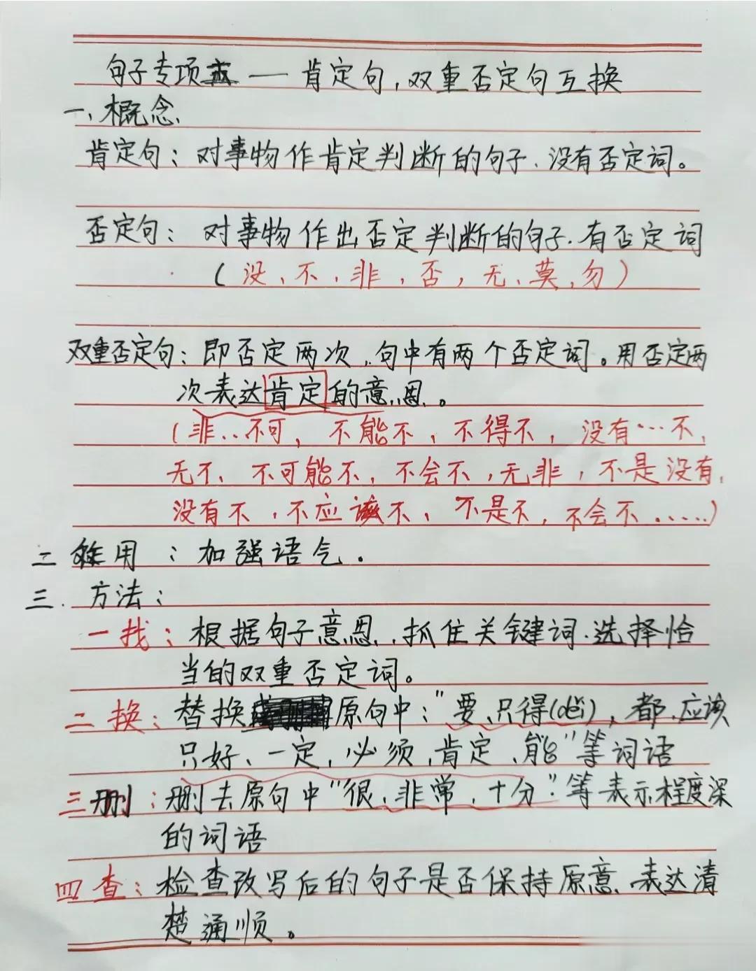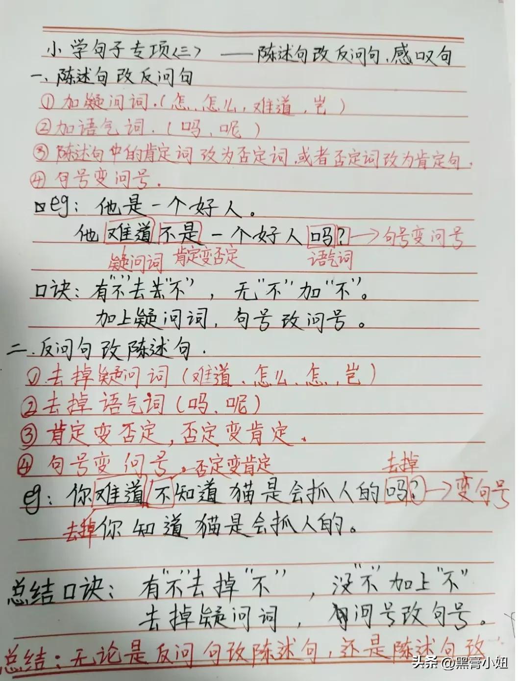 天呐!太卷了!竟然有孩子将小学句子专项训练全都手写出来了!涵盖肯定句,双重否定句互换、陈述句改反问句、感叹句、扩句、缩句、直接引用与转述句等等,有方法有口诀有总结有例题有练习,全在这18张纸上,看完轻松掌握各类句式转换技巧!家有孩子的赶紧收藏!没事练一练,打牢语文基础! 语文句式强化训练