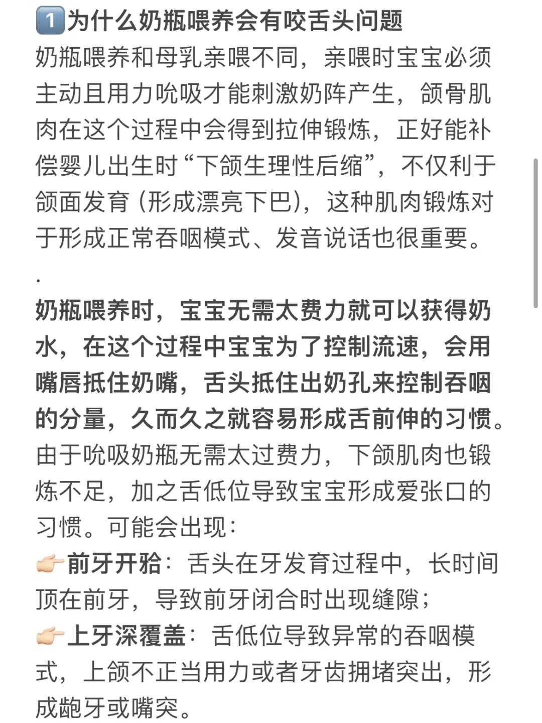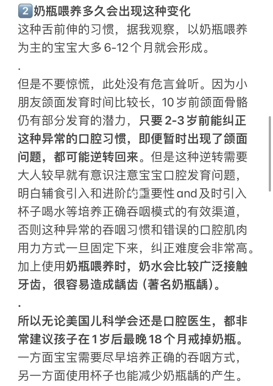 其实瓶喂真的帮助很多妈妈解决了喂养难题,比如kk上班后也是背奶给小朋友瓶喂。但是瓶喂时间过长确实也可能会影响口腔颌面发育,比如经常被提到的舌前伸(嘴巴不闭合、容易咬舌头睡觉)就是其中之一。在此建议各位父母一定要重视口腔发育的相关问题,通过好好吃辅食、引入吸管杯帮助宝宝形成成熟的吞咽模式,助力颌面正常发育,让每个宝宝都能拥有一个漂亮的脸型。