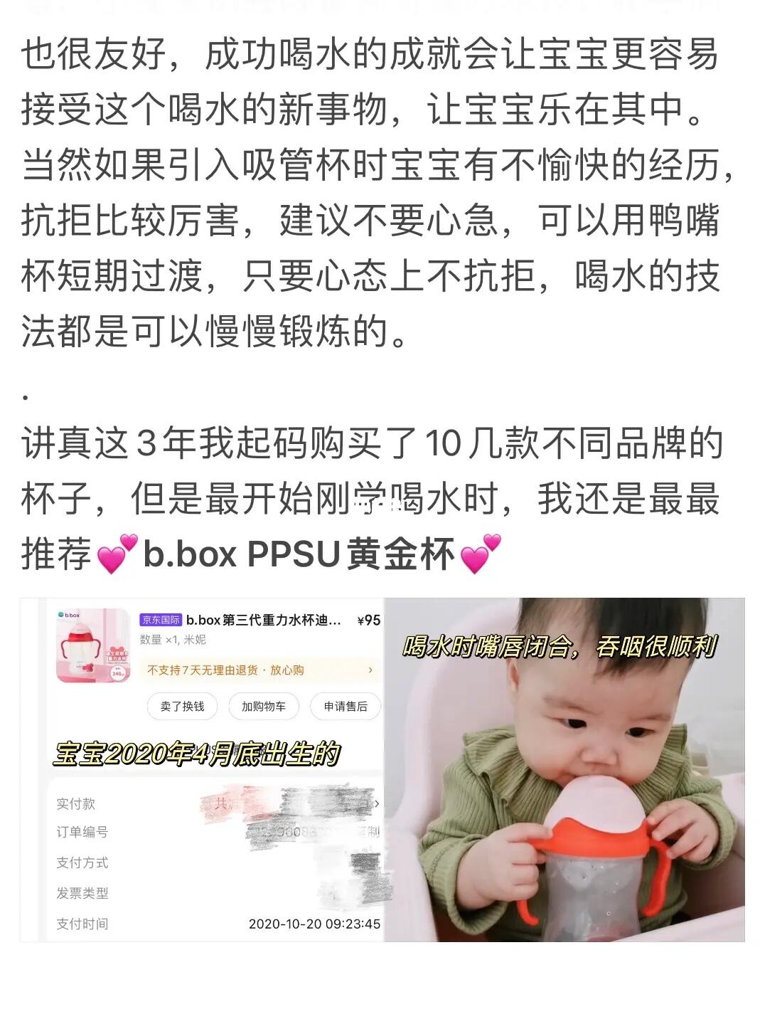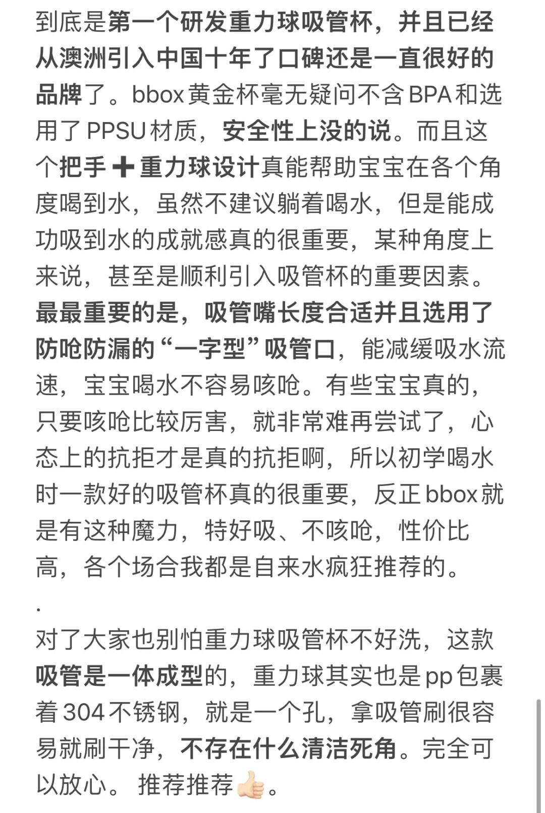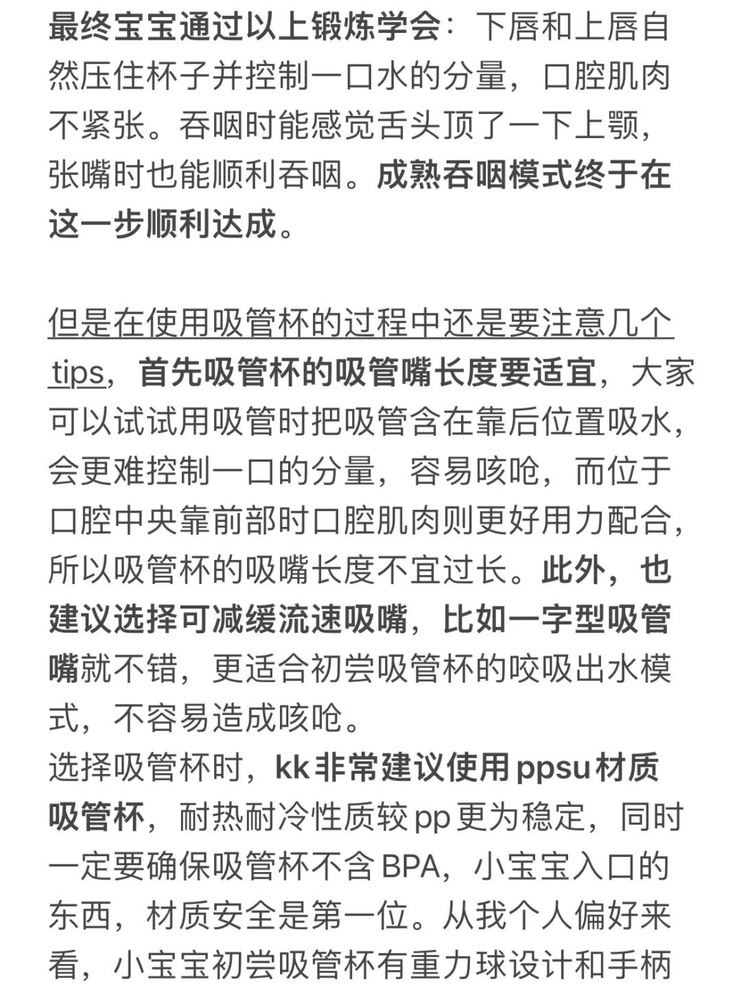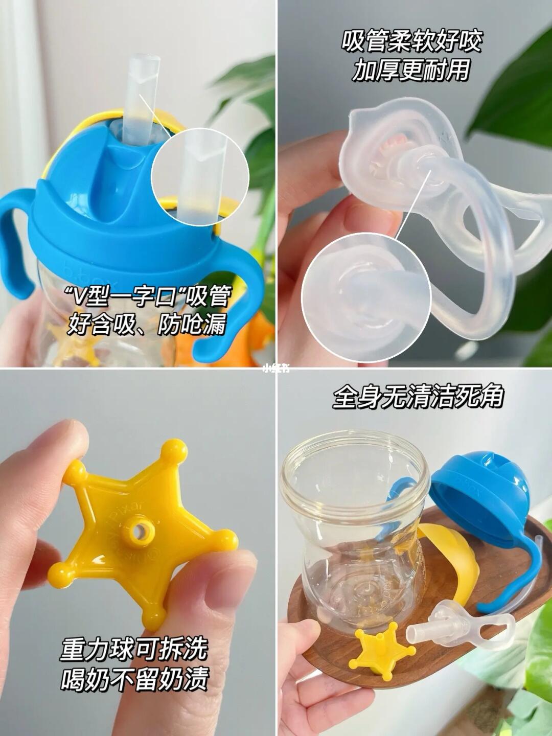 kk这两年半起码买过十几个不同品牌的吸管杯,但个人认为最适合初学饮水婴儿使用的就是b.box家的吸管杯,第一个做这类杯子的品牌就是b.box,我们买的也比较早,它家有PP和PPSU材质,都是食品级,不含BPA的。更关键是:好吸、不呛,宝宝接受度高。吸管口就是防呛漏的“一字型”吸管口减缓了流速喝水不容易咳呛,还有重力球,宝宝躺着随便喝奶喝水,让宝宝心态上更容易接受吸管杯。整个杯杯全身可拆卸水洗、🈚清洁死角。