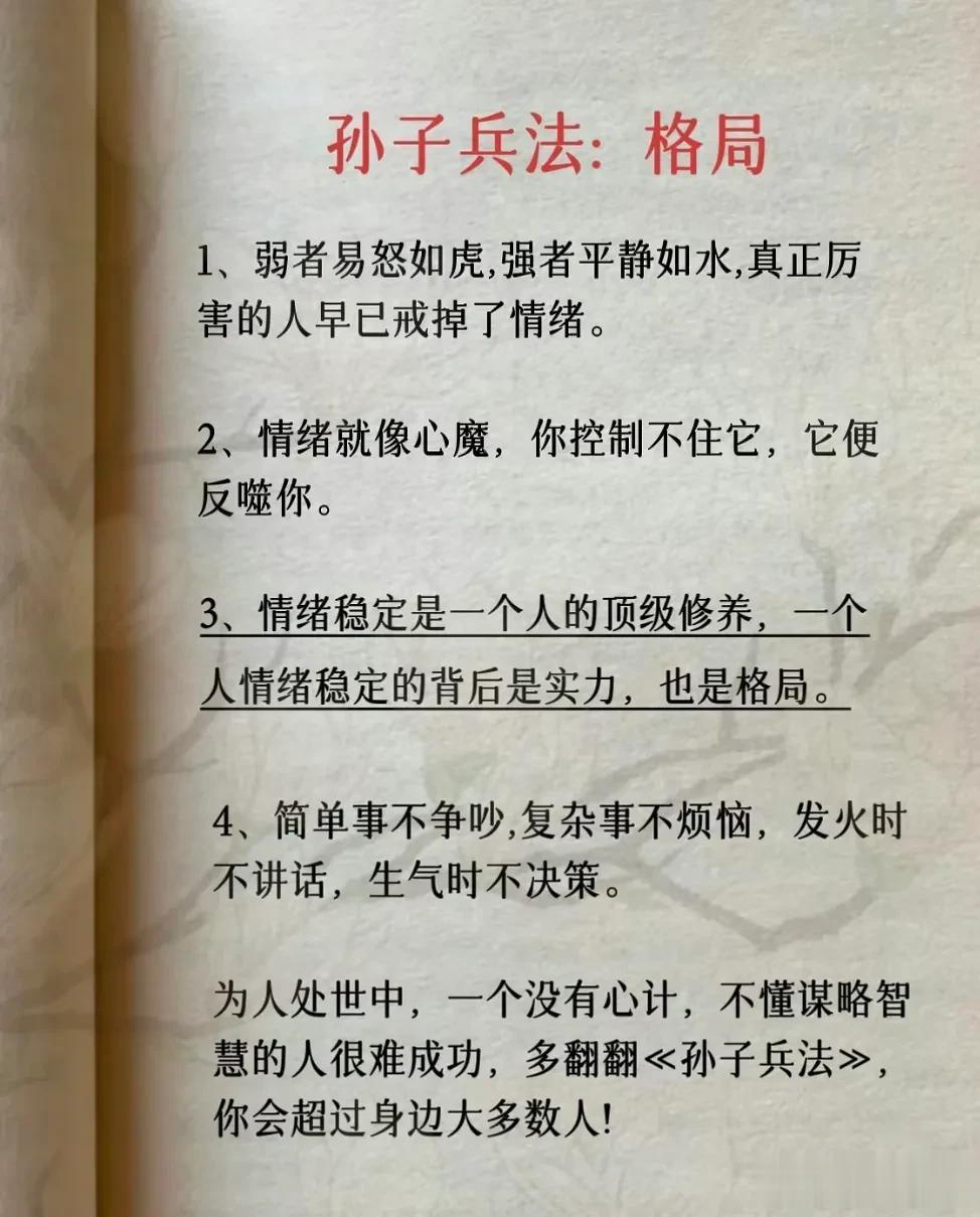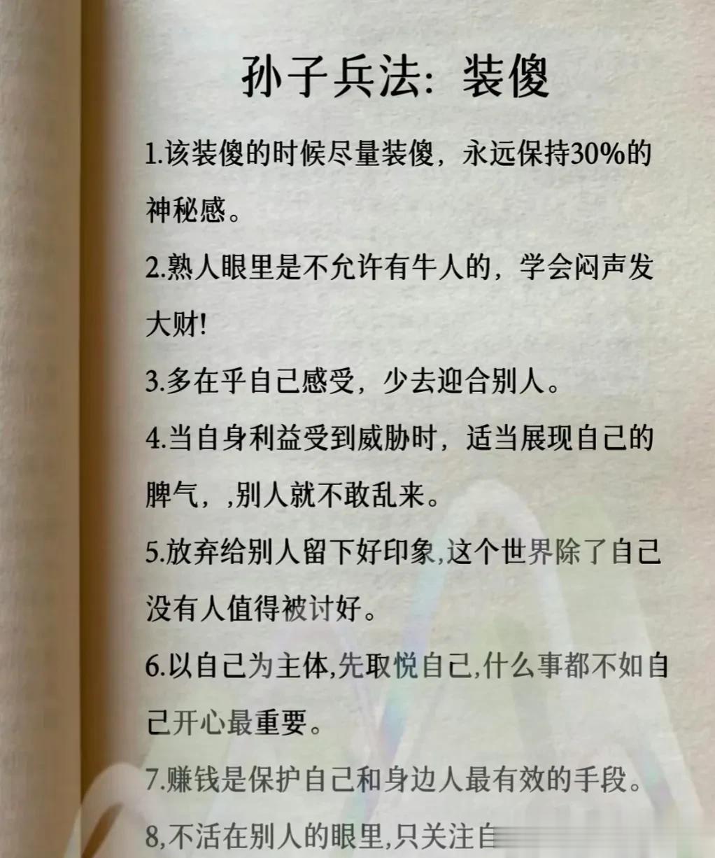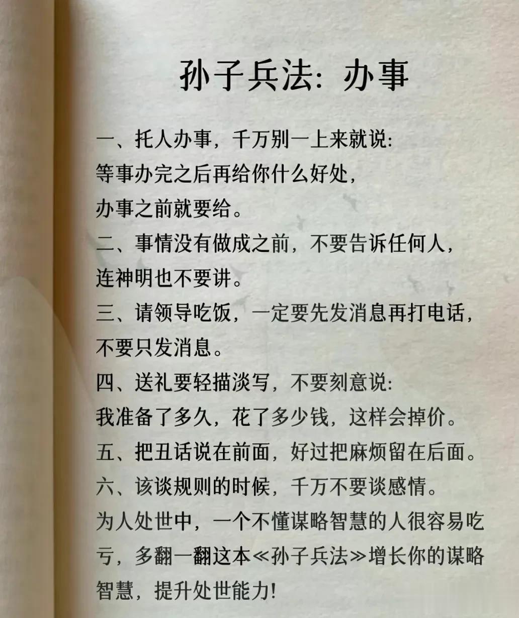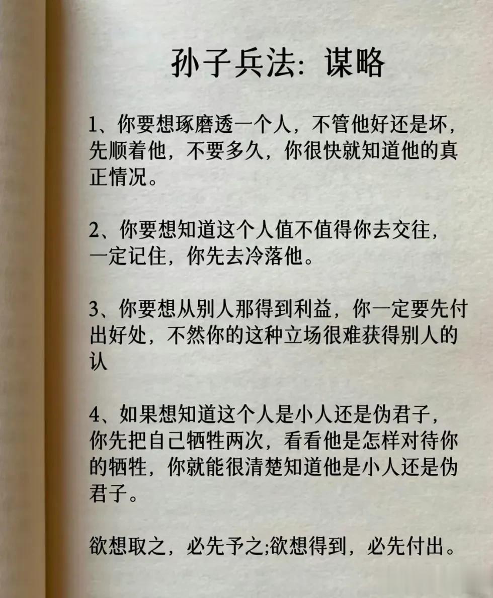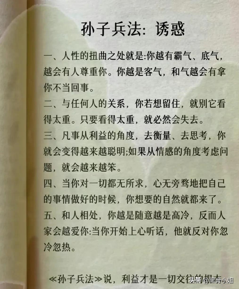 我滴天呐!第一次见到这么完整的孙子兵法解读,涵盖计谋、办事、借力、圈子、诱惑、处世、智慧、反杀术、格局、改善等方面,这次终于涨见识了,不愧是一部旷世奇书的精髓,值得反复读,能提升你的人生格局和思考能力,不管对于你的生活还是事业上都有很大的帮助,受益一生。 比如第一篇计谋: 你想跟人借2000你先张嘴问别人借20000他拒绝,你再改口说,那就借我2000,这叫"以退为进”。 工资1万,对亲戚说4000,对同事说,跟你差不多,这叫“瞒天过海”。 别人想要你的东西,你要是不愿意给,别眼巴巴的不敢拒绝,问他一句,你拿什么跟我交换,这叫“以守为攻”。 …… 为人处世中,一个不懂谋略智慧的人很容易吃亏,多翻一翻下方链接这本高启强翻烂的《孙子兵法》,能增长你的谋略智慧,提升处世能力,藏着普通人改变命运的底层逻辑。 孙子兵法国学经典精粹