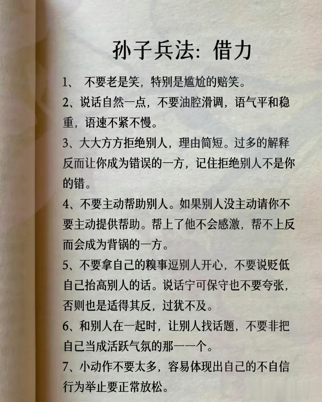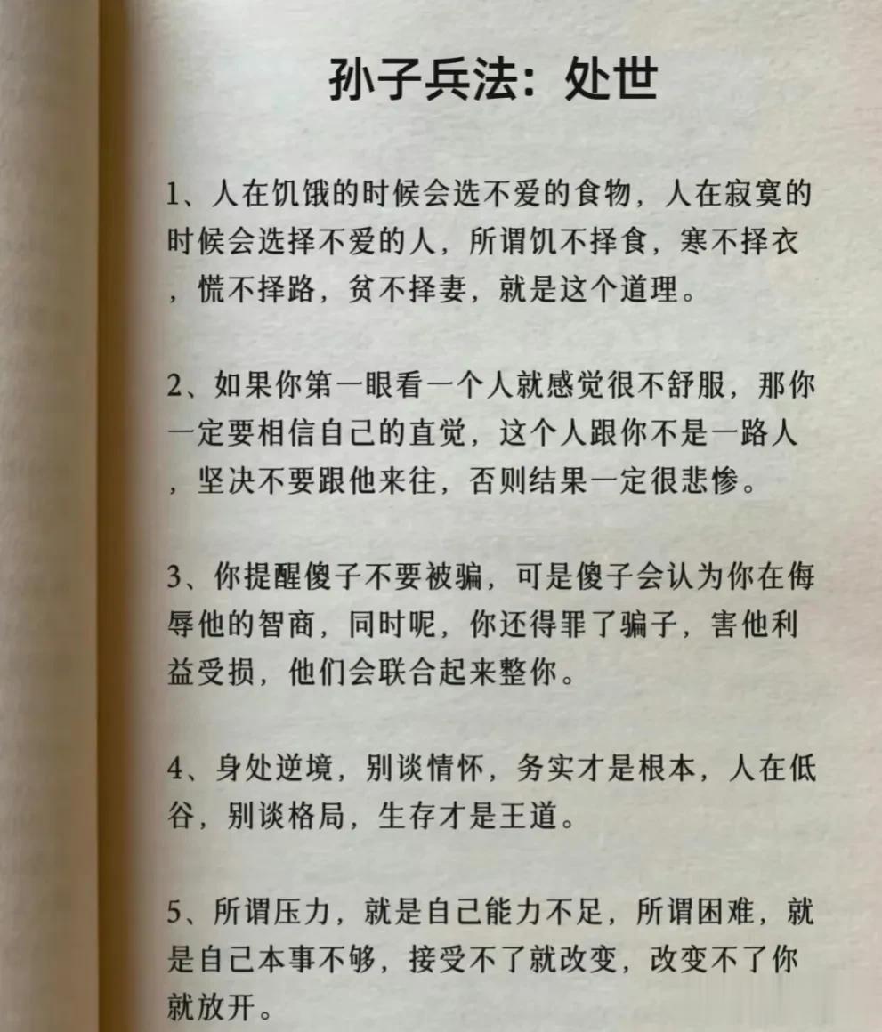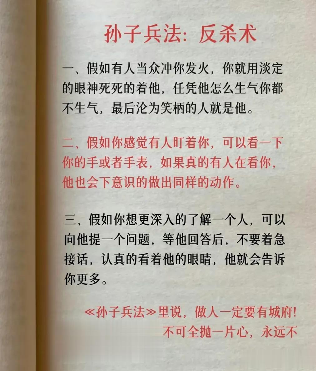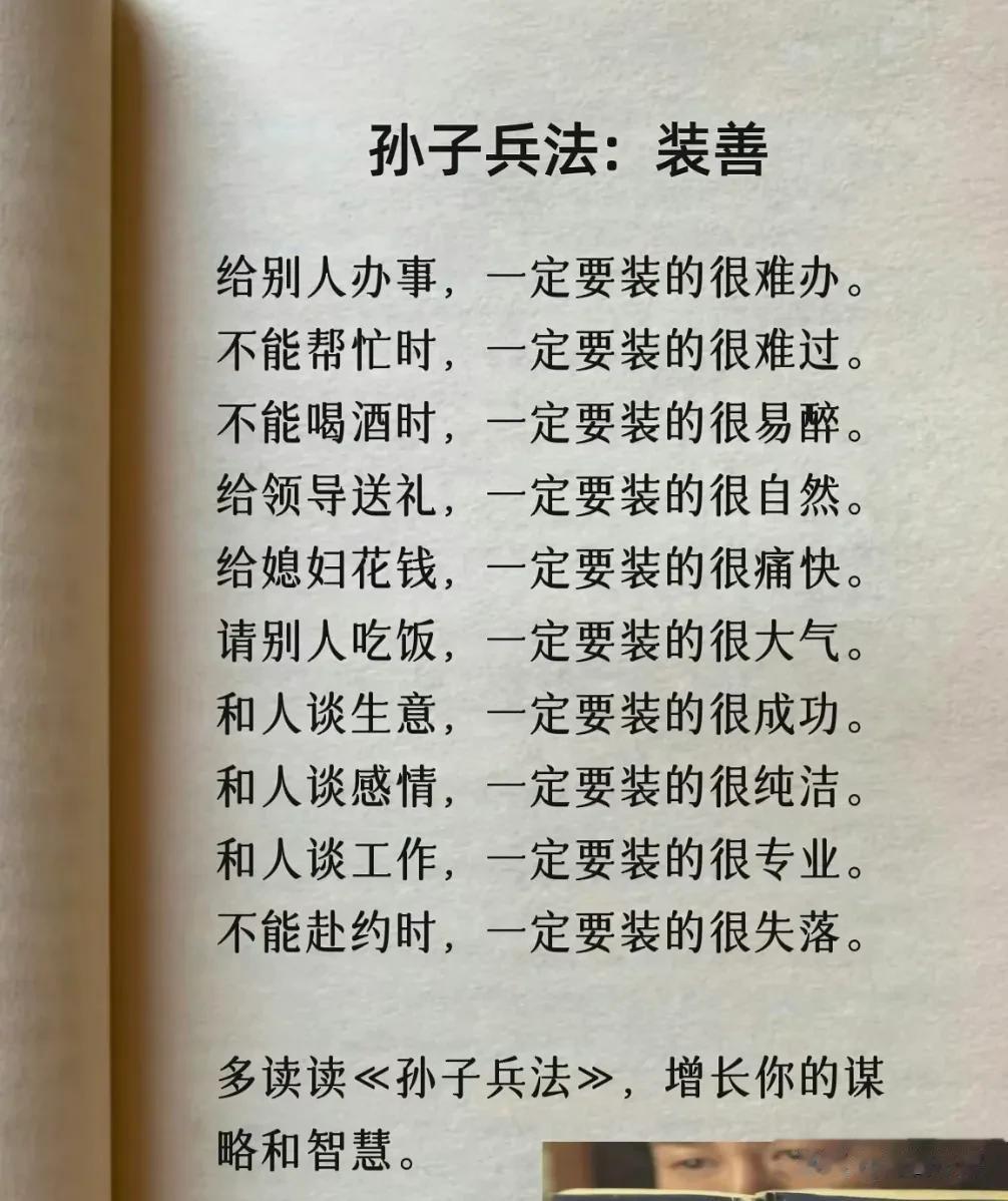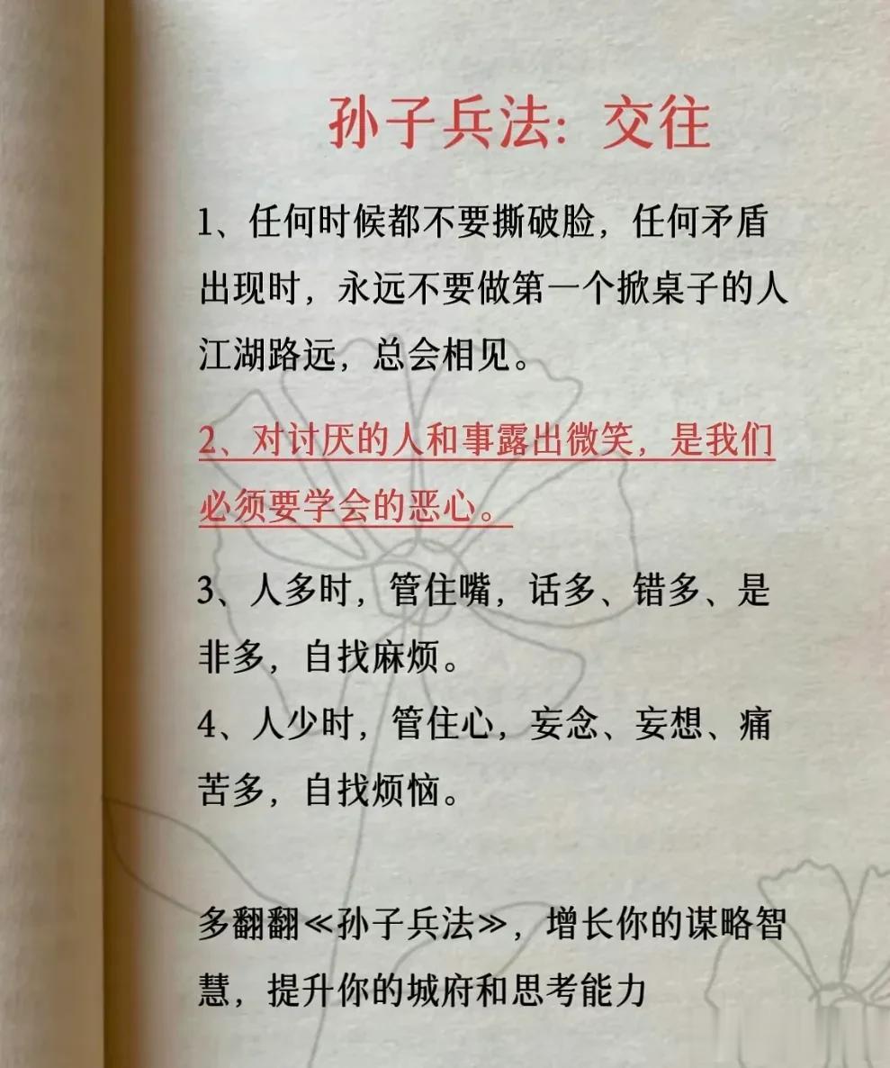我滴天呐!第一次见到这么完整的孙子兵法解读,涵盖计谋、办事、借力、圈子、诱惑、处世、智慧、反杀术、格局、改善等方面,这次终于涨见识了,不愧是一部旷世奇书的精髓,值得反复读,能提升你的人生格局和思考能力,不管对于你的生活还是事业上都有很大的帮助,受益一生。 比如第一篇计谋: 你想跟人借2000你先张嘴问别人借20000他拒绝,你再改口说,那就借我2000,这叫"以退为进”。 工资1万,对亲戚说4000,对同事说,跟你差不多,这叫“瞒天过海”。 别人想要你的东西,你要是不愿意给,别眼巴巴的不敢拒绝,问他一句,你拿什么跟我交换,这叫“以守为攻”。 …… 为人处世中,一个不懂谋略智慧的人很容易吃亏,多翻一翻下方链接这本高启强翻烂的《孙子兵法》,能增长你的谋略智慧,提升处世能力,藏着普通人改变命运的底层逻辑。 孙子兵法国学经典精粹
