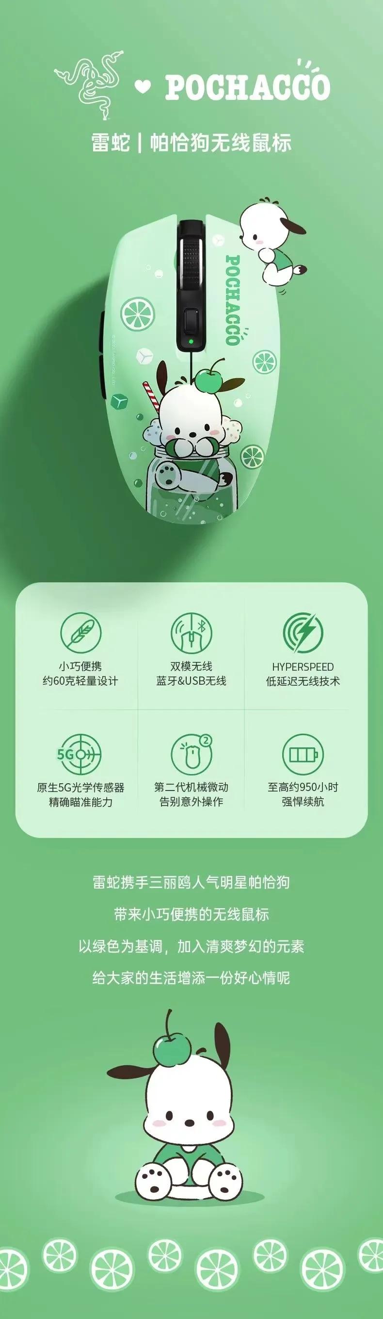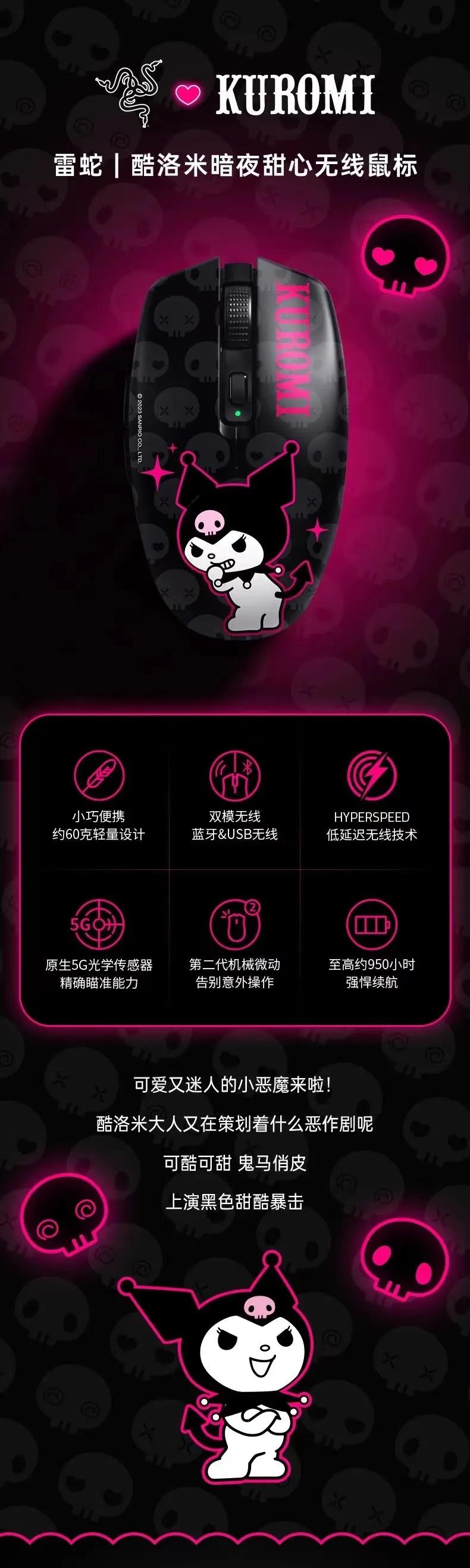 雷蛇和Hello Kitty 50周年外设礼盒(包括键盘和无线鼠标),以及雷蛇与酷洛米暗夜甜心、帕恰狗联名推出的无鼠标,外观设计应该会受到很多妹子的喜欢。