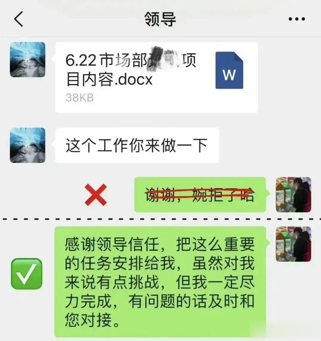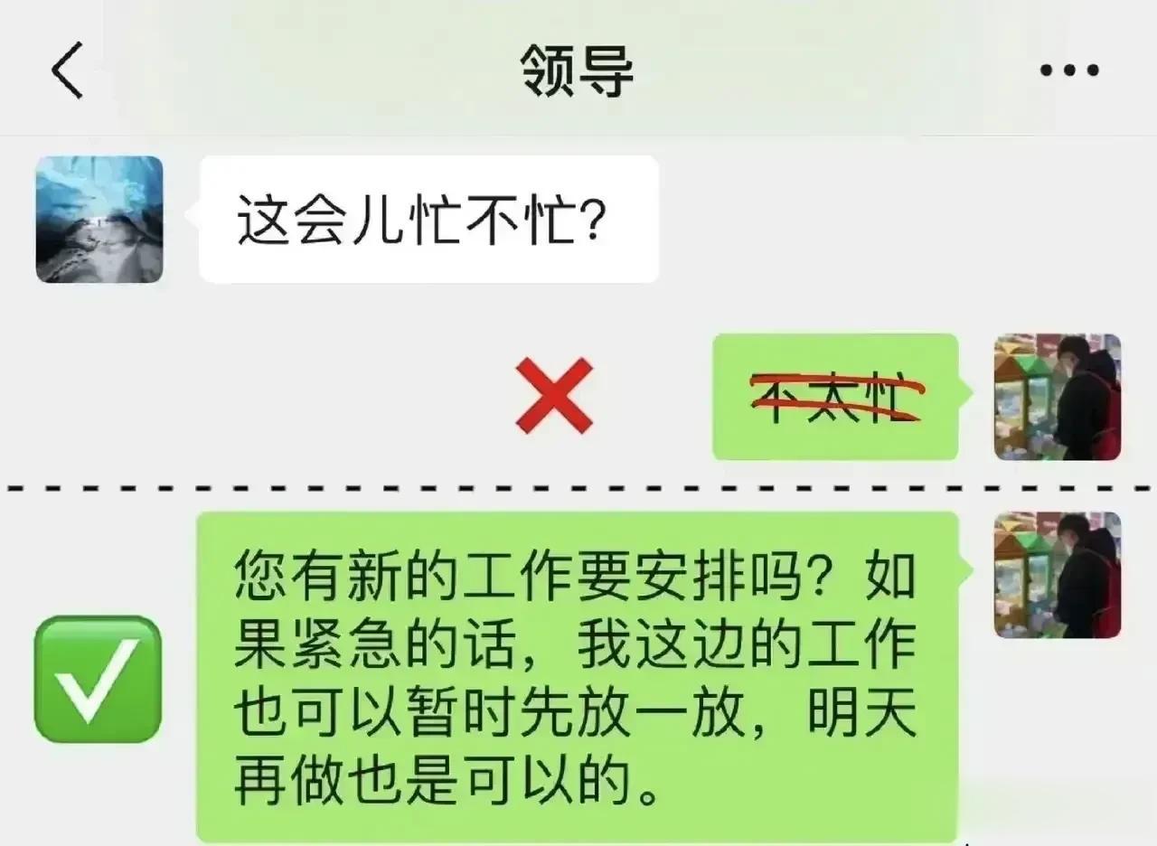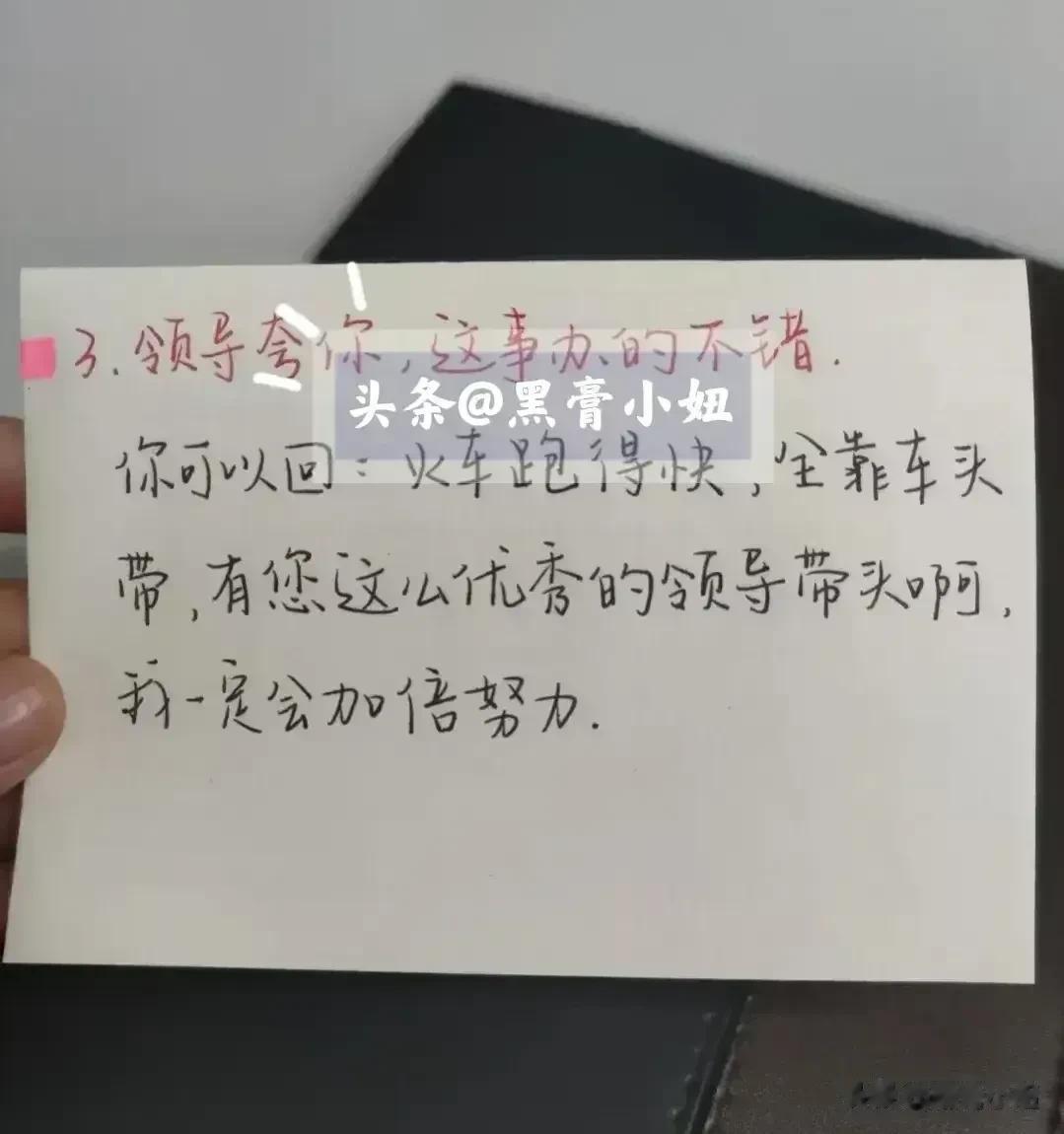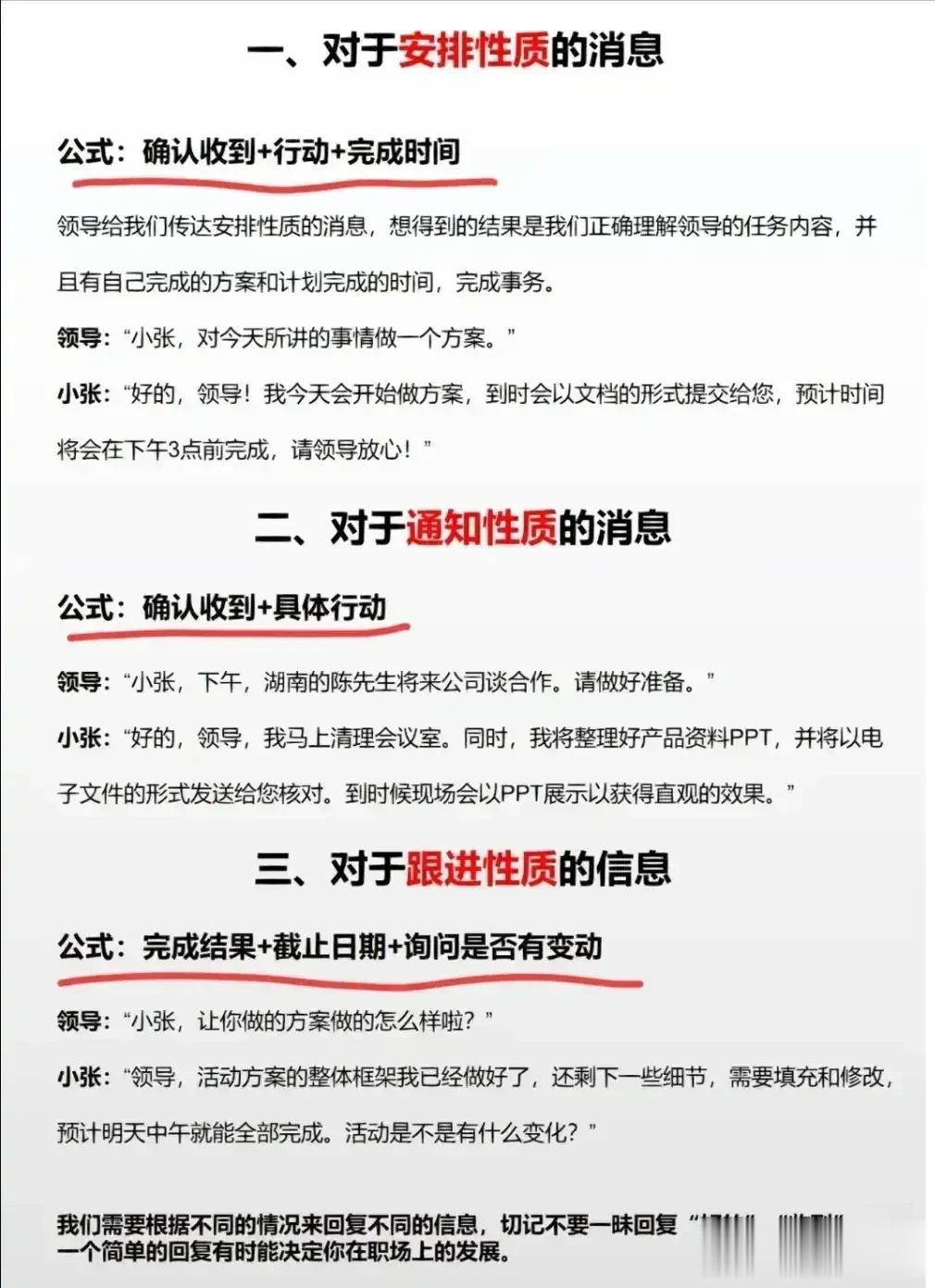 在工作上,千万别简单地回复领导“好的”“收到”的话术,那些混得好的职场高手都有回复领导的万能公式,总能深入老板的喜爱。比如对于安排性质的消息回复公式:确认收到+行动+完成时间。对于通知性质的消息回话公式:确认收到+具体行动。对于跟进性质的信息回话公式:完成结果+截止日期+询问是否有变动等等,会回话就是厉害,想升职加薪的,赶紧背下来! 总而言之,在回话时,借助公式来组织和表达我的思想。这些公式使得回答更加结构化、有条理,并且能够有效地传达我的观点和建议。 回话是一门技术,这对于想要晋升和加薪的人来说是非常重要的。只有把话说到领导心里,才能够得到他们的重视。更多技巧下方链接走起! 中国沟通智慧回话技术