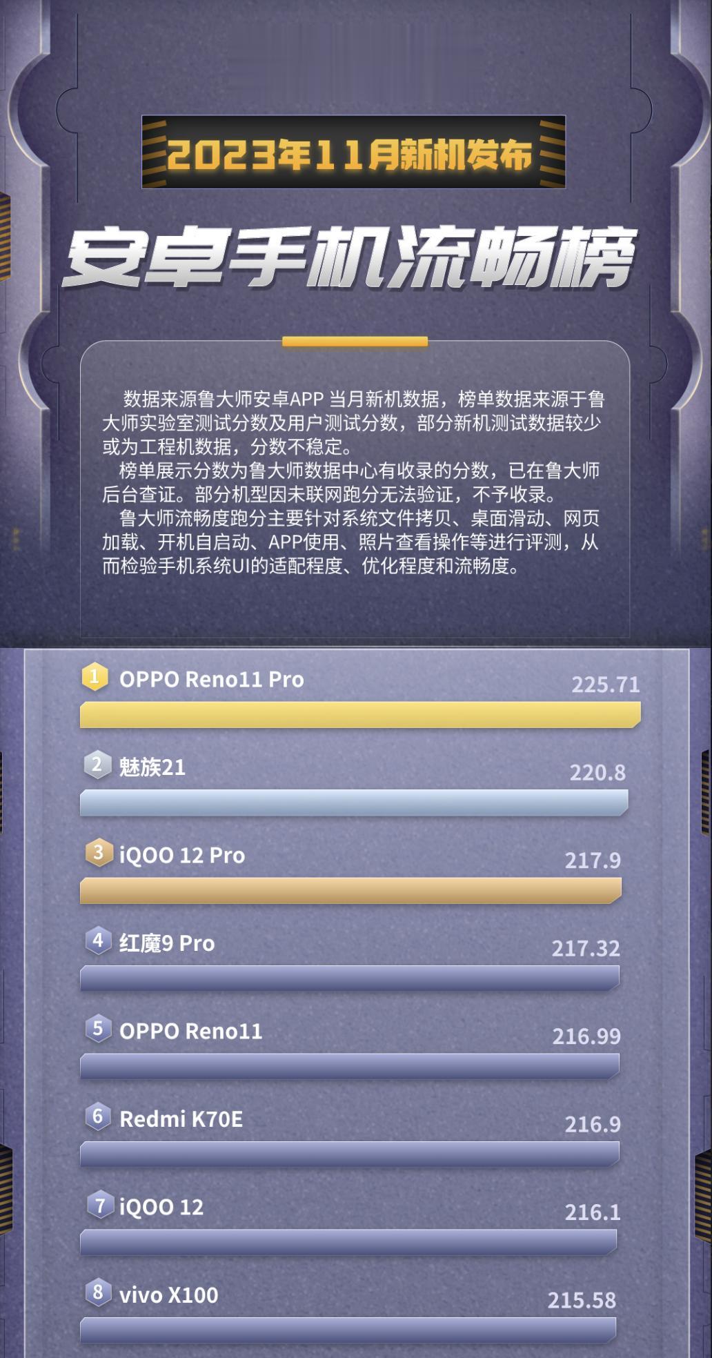 华为新机又要来了?而且网传还是麒麟芯片,这款新机大概率是nova 12系列,其中Ultra版本有可能会搭载麒麟新芯片,还是很值得期待的,建议花粉再等等。 不得不说,最近这两个月发布的新机是相当多啊!而根据鲁大师公布的11月新机流畅榜单来看,OPPO Reno11 Pro流畅度最高,分数达到了225.71,而OPPO Reno11标准版的表现也不错,流畅度排行第五。之所以能在Top 5榜单中占据两席,我觉得跟ColorOS 14系统的出色优化是分不开的,这次ColorOS 14就再次对流畅度进行了深度优化,而且还新增了「流体云」、「中转站」以及「闪速抠图」等能够提高效率的功能,所以追求流畅体验的话,#OPPO Reno11#系列了解下?