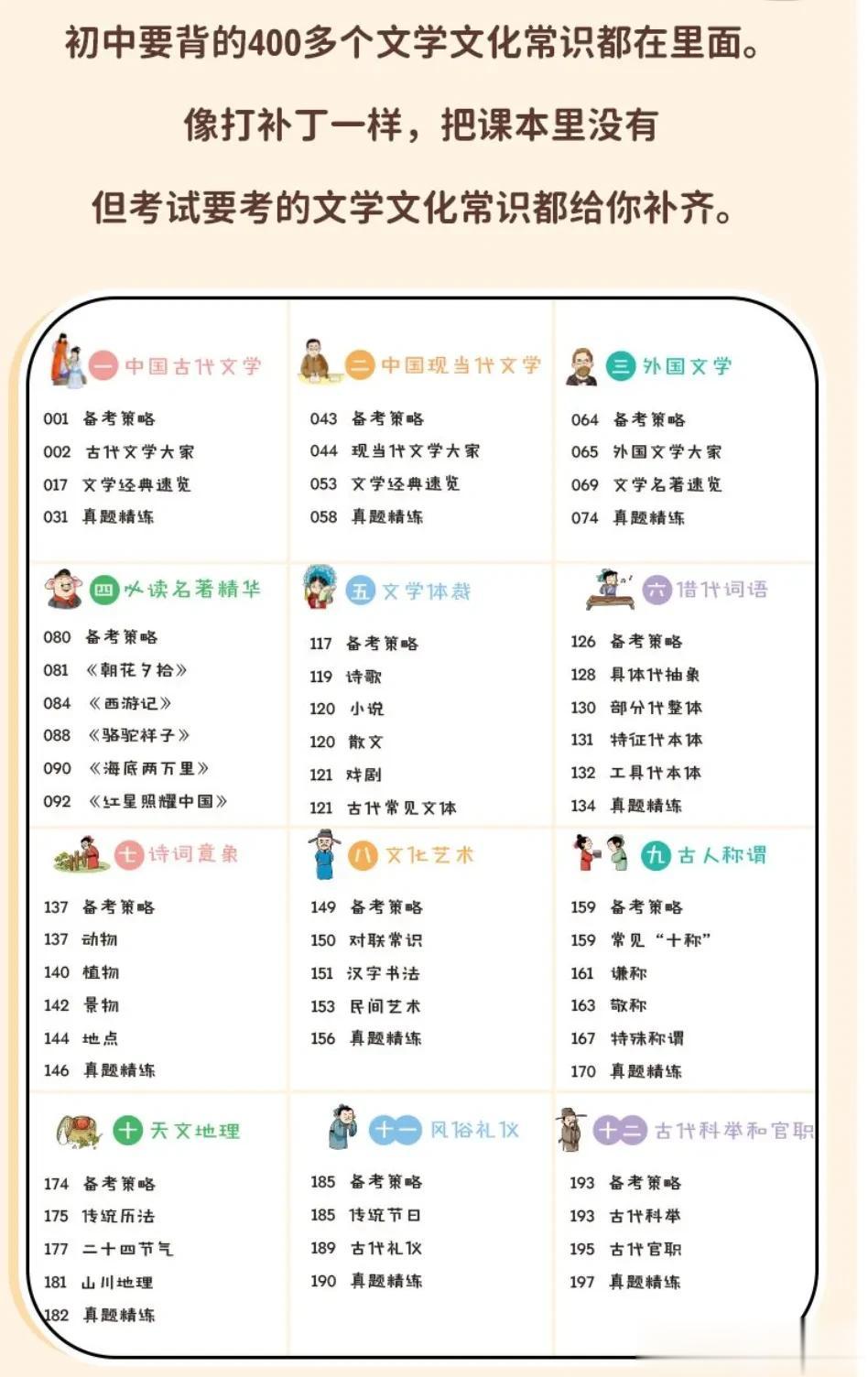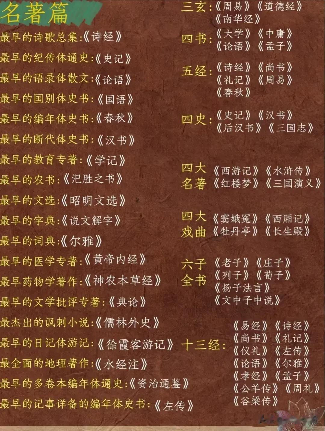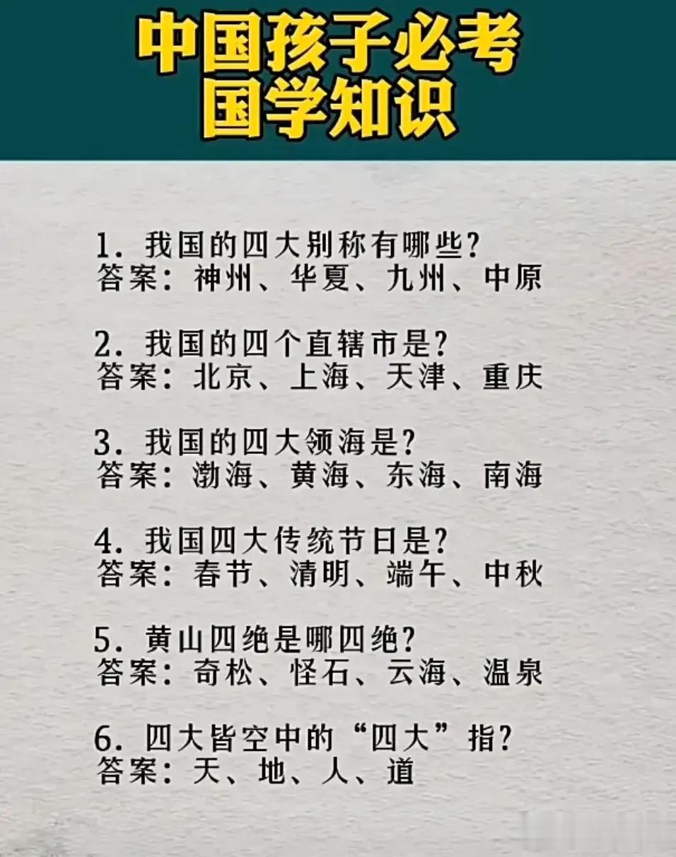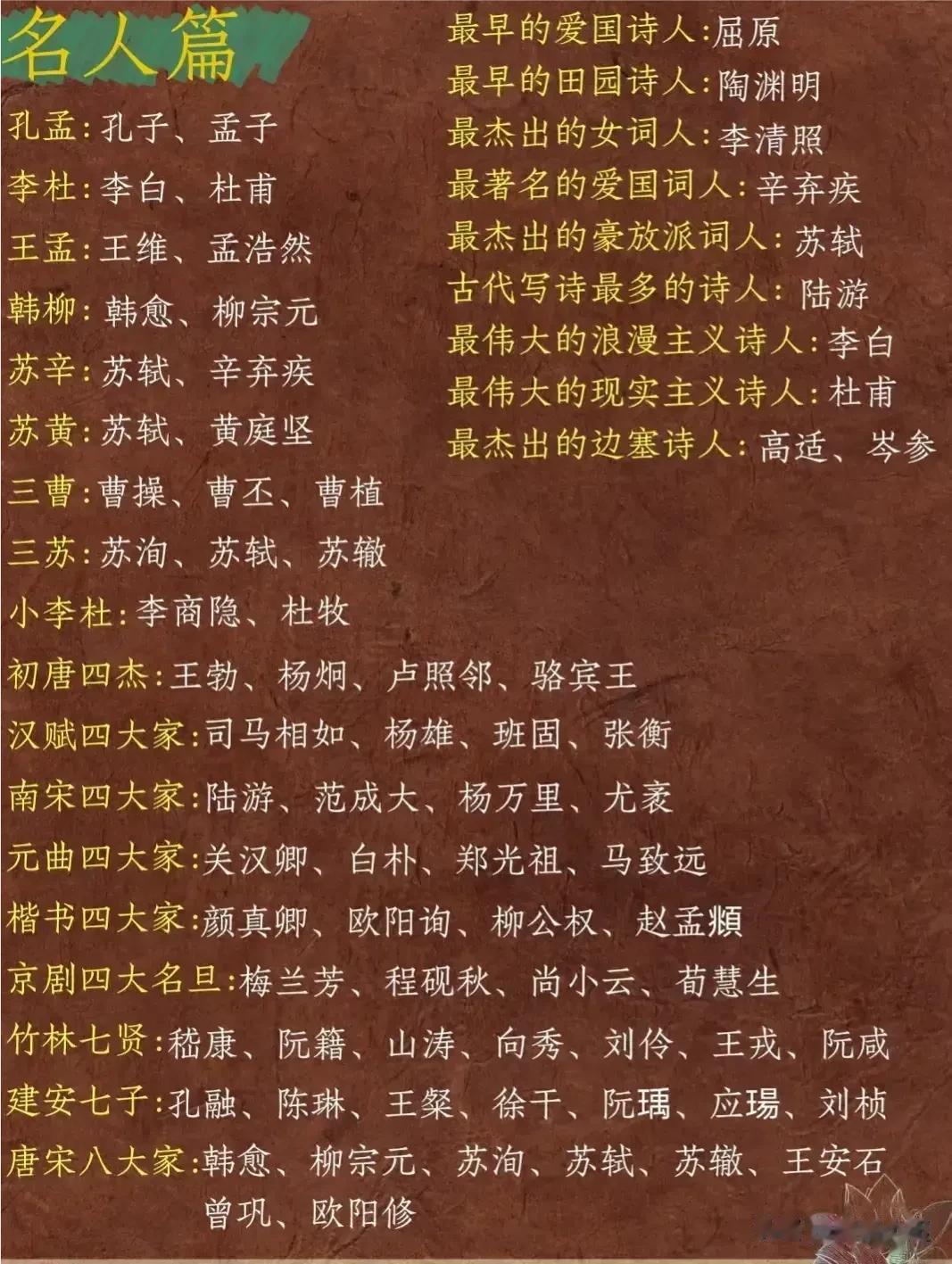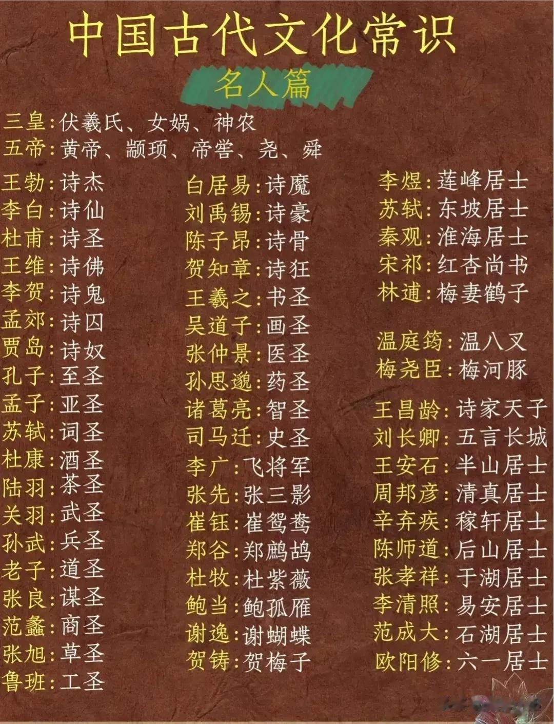 一位教师妈妈熬夜整理:中国孩子常考的国学文化知识,看完之后,发现总结的太给力了,这是我见过整理最全的知识点,孩子背下来,1-9年级的语文就牛了!不但可以提升孩子文化素养,也可以增加孩子文学常识! 古代文化是语文知识的重要组成部分,占了半壁江山,一定不能小看,所以,平时多注意,多背,多积累,丰富孩子经典知识,现在领先一小步,中高考领先一大步~ 初中小学必背文学常识