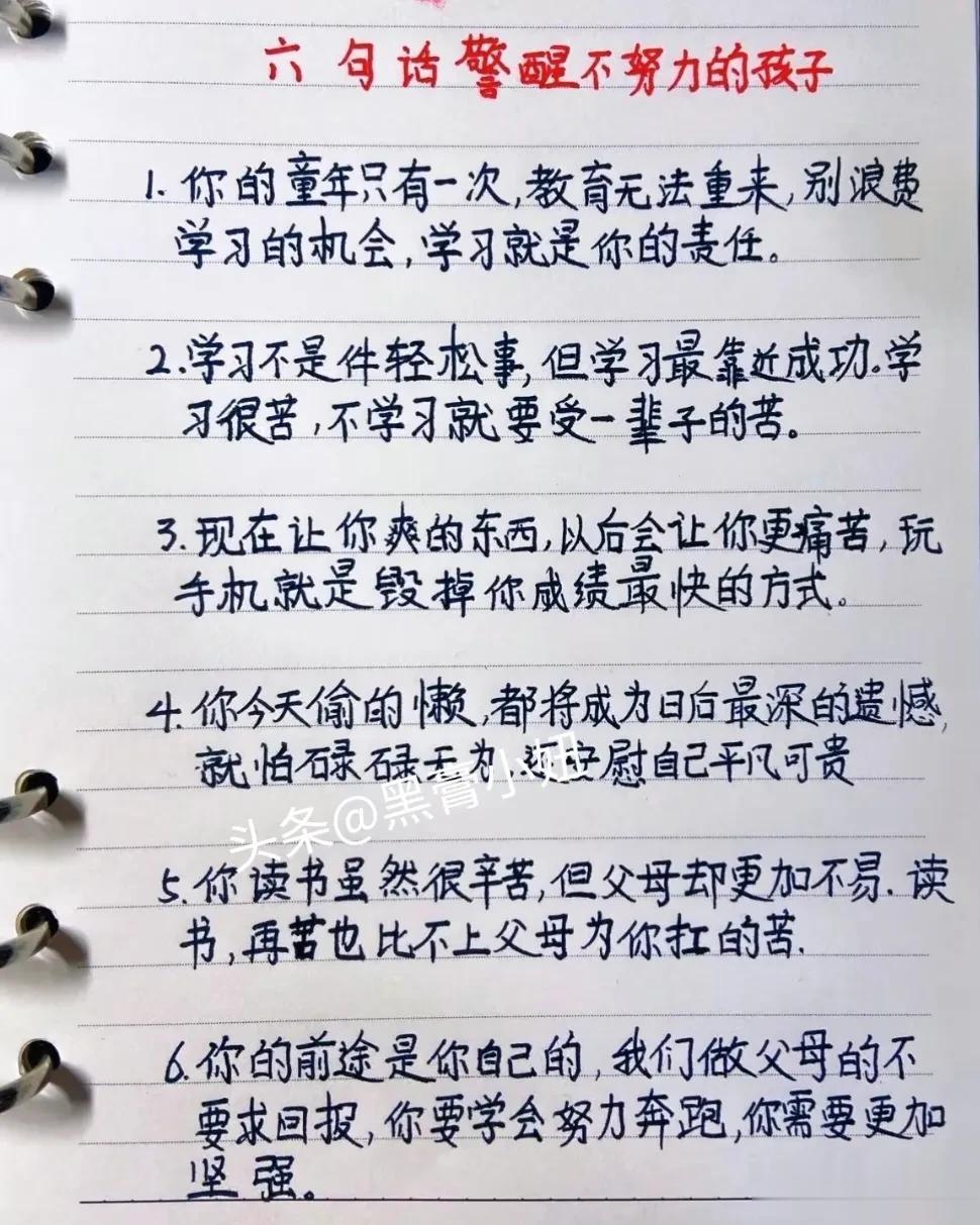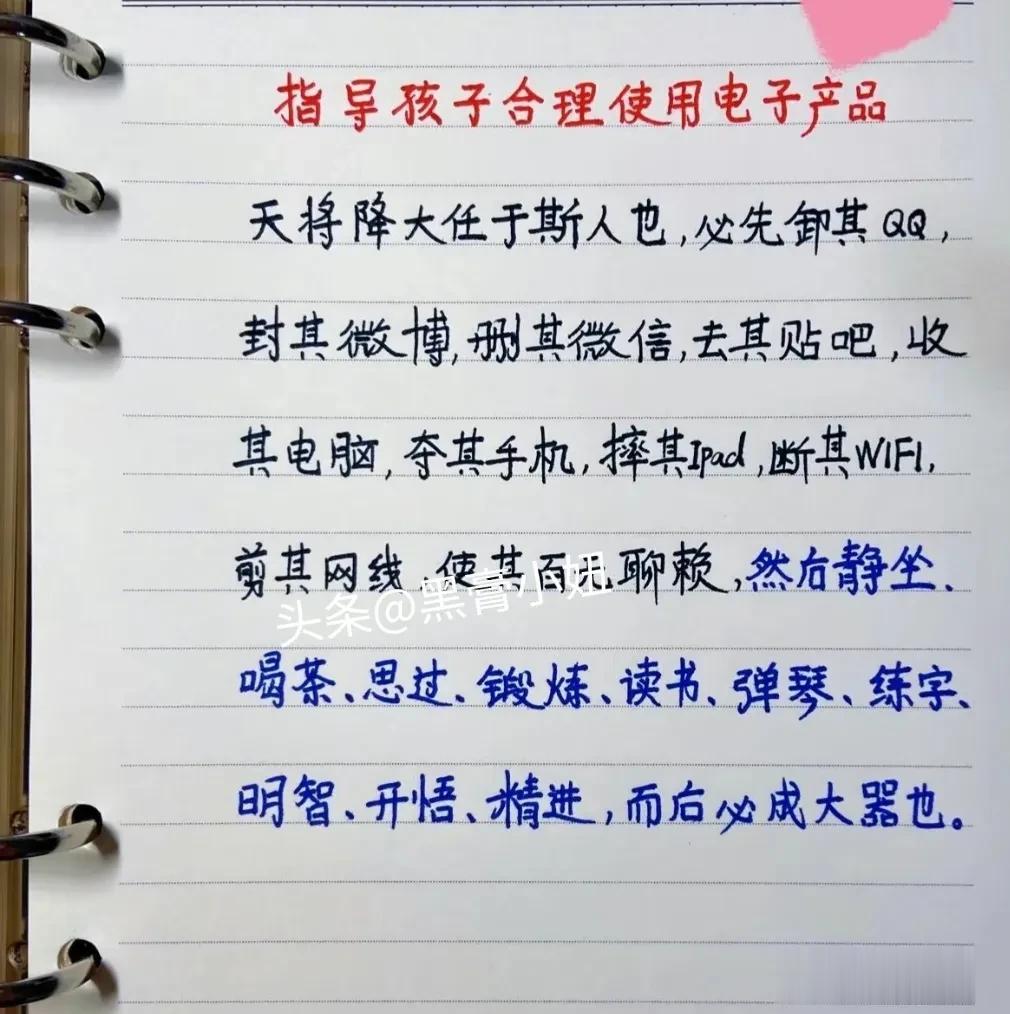 一位学霸母亲的教子金句,价值万金!看完之后,不得不说真是被惊艳到了,不管是激励孩子努力读书,还是做人做事的道理,更或是指导孩子合理使用电子产品,都很有内涵,精炼有趣! 比如天将降大任于斯人也,必先卸其QQ,封其微博,删其微信,去其贴吧,收其电脑,夺其手机,摔其Ipad,断其WIF1,剪其网线,使其百无聊赖,然后静坐,喝茶、思过、锻炼、读书、弹琴、练字、明智、开悟、精进,而后必成大器也。 家长们快保存下来,没事把这位母亲的话讲给孩子听,对于孩子以后的学习或者做人做事都很有益。赶紧来修炼自己,正确引导孩子! 学霸妈妈修炼家庭教育